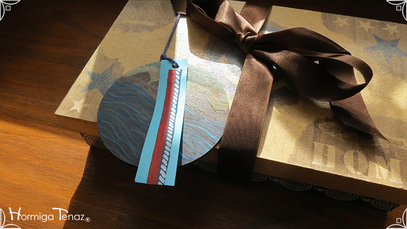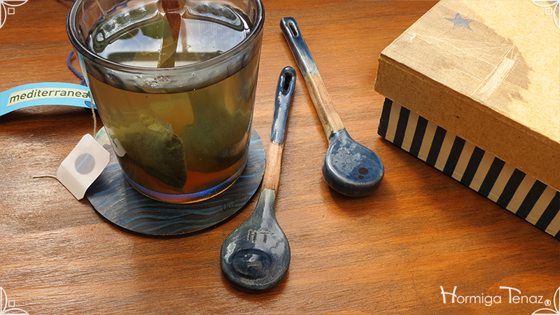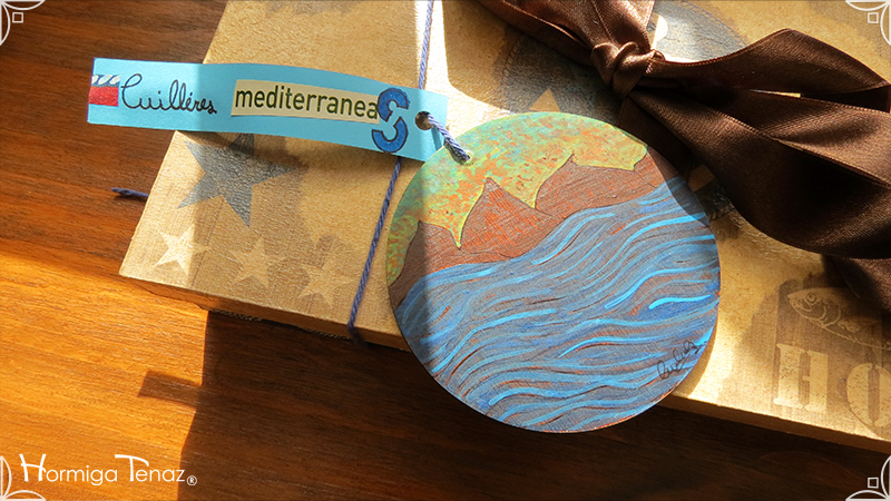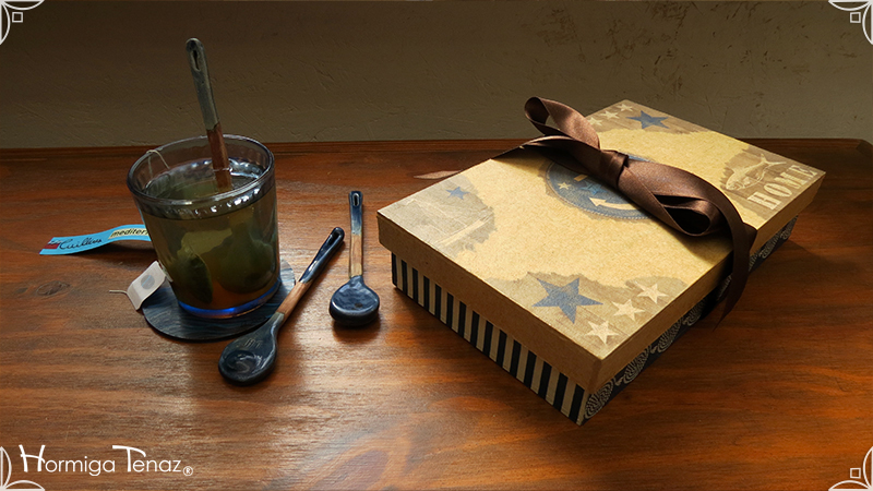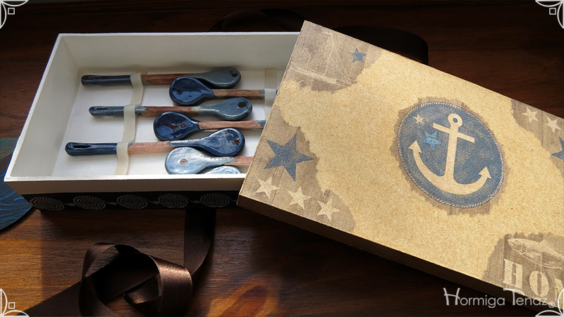 Siete cucharas realizadas en cerámica, en un diseño de formas orgánicas con colores combinados en distintos tonos de azul mediterráneo y marrón. Preservadas en su caja de madera con cordones de velcro en el interior para sujetar las cucharas, decorada además, con la técnica de decoupage en una temática marítima y ornamentada con un cierre de cinta de raso chocolate.