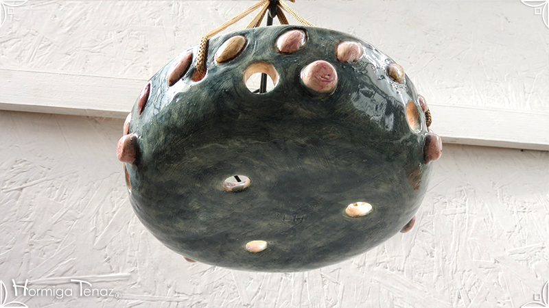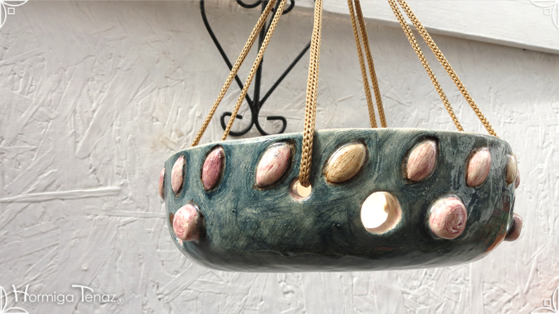 Maceta colgante calada para orquídeas epífitas y plantas que requieran que sus raíces permanezcan ventiladas. Es una pieza realizada en cerámica artesanal con bajorrelieves abstractos y orgánicos en tonos rosa y canela. Complementada, además, con cordones de nylon marrón para su colgado.