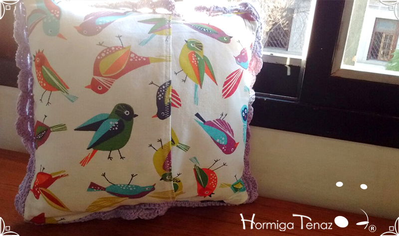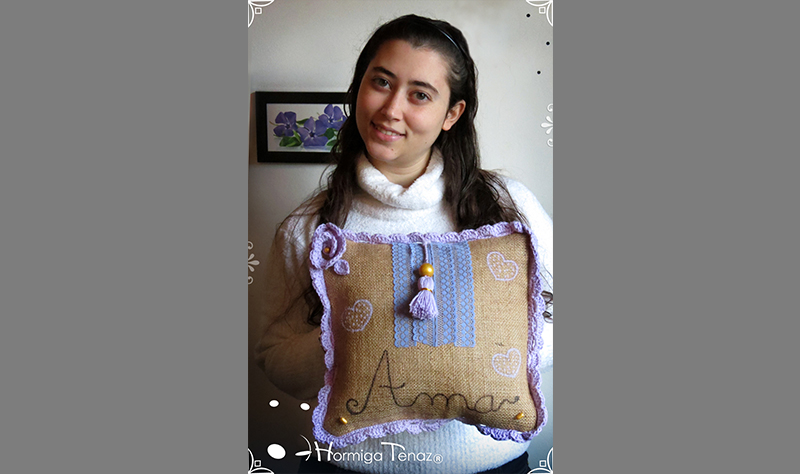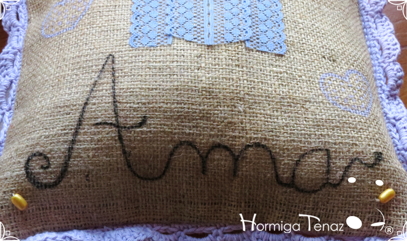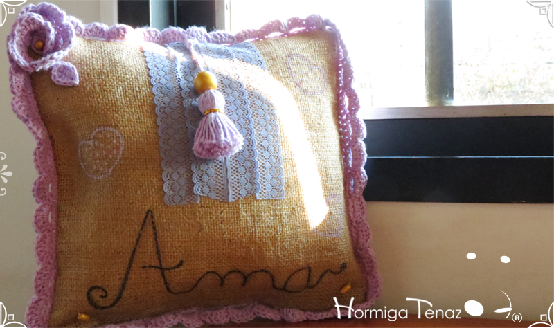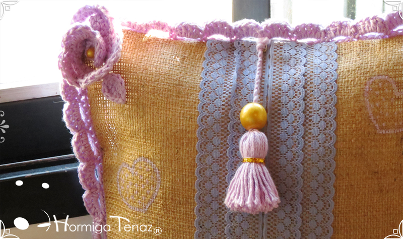 Almohadón de arpillera en versión lila, con detalles en dorado. Pintado a mano con volados en crochet, bordado con mostacillas de porcelana fría, detalles en encaje, y aplique de borla. Fundas lavables.