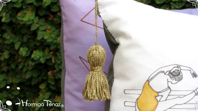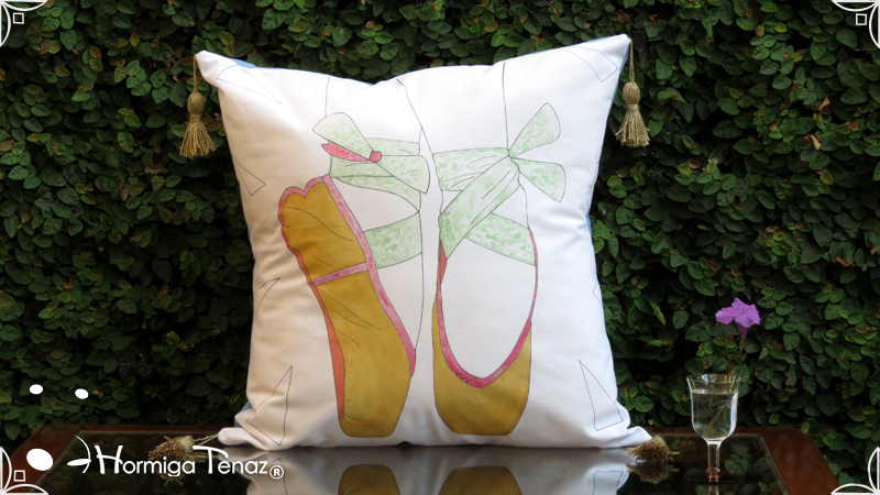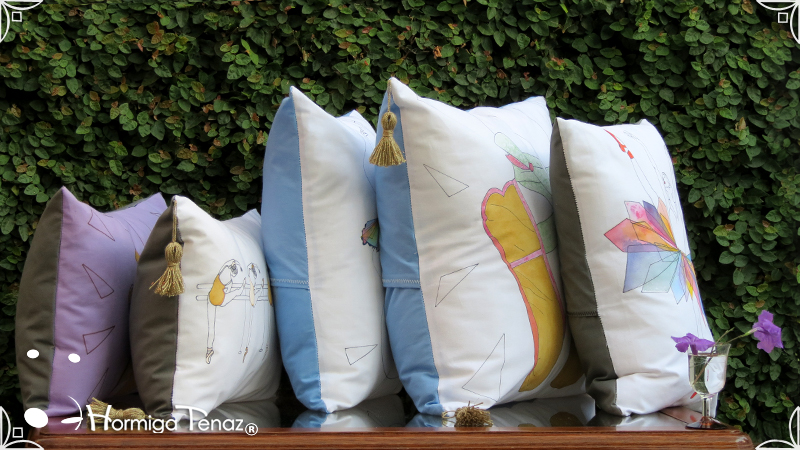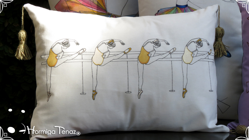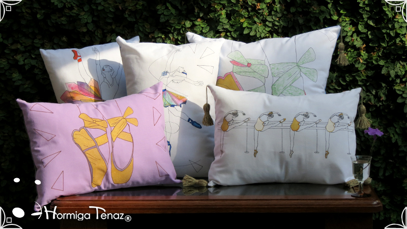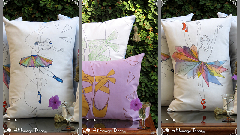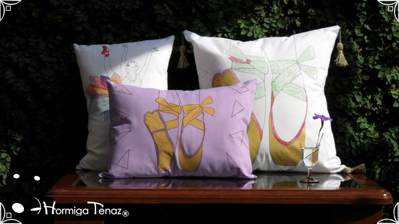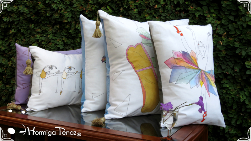 Almohadones con diseños de bailarinas clásicas expresando movimiento y equilibrio en una interacción de color y formas, pintados a mano sobre tela. Las fundas son desmontables para su fácil lavado y el relleno es de vellón siliconado. Medidas: almohadón grande 50 x 50 cm / almohadón mediano 35 x 46 cm. Los almohadones fueron realizados en combinación con los Cuadros Bailarinas.