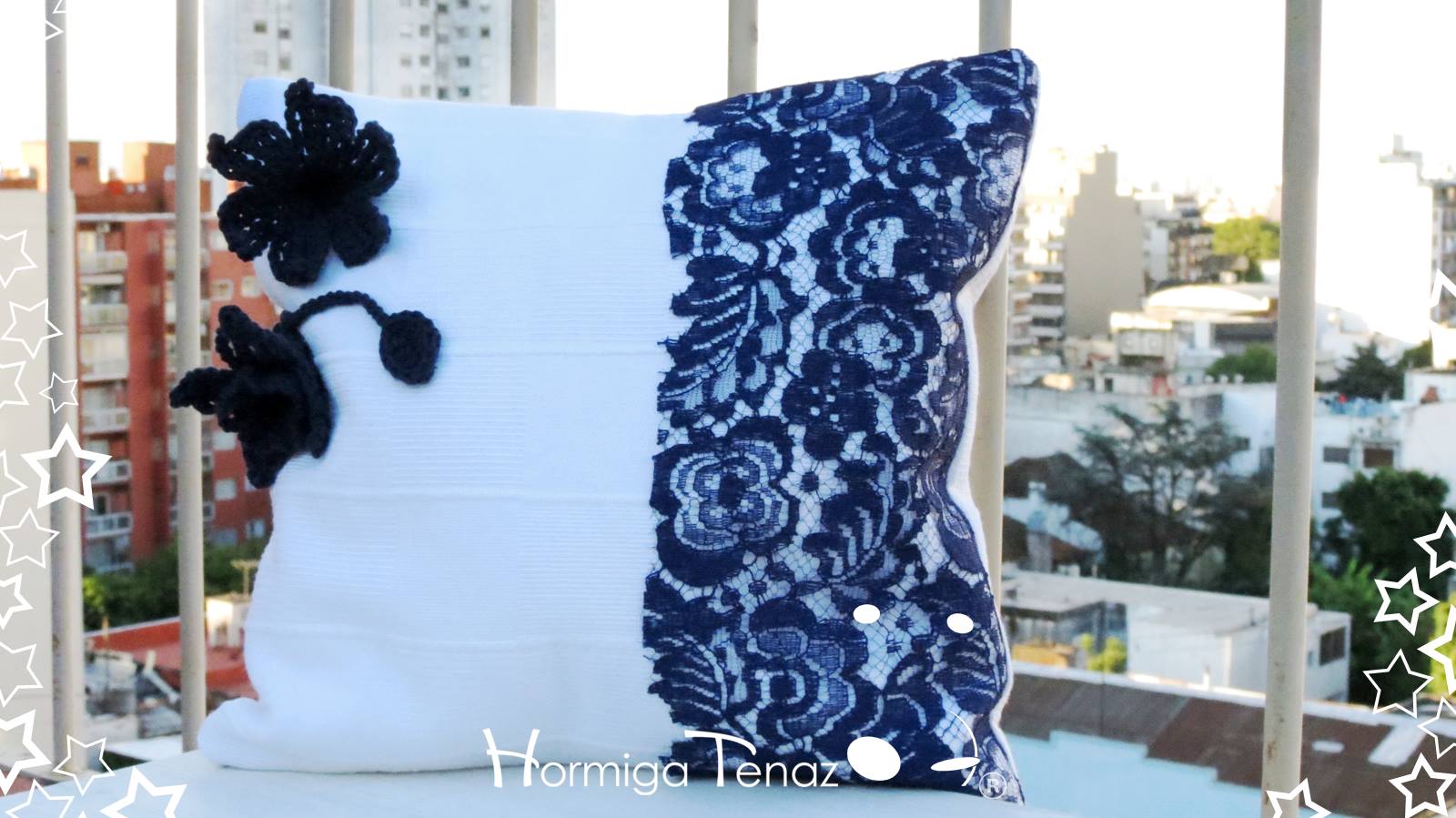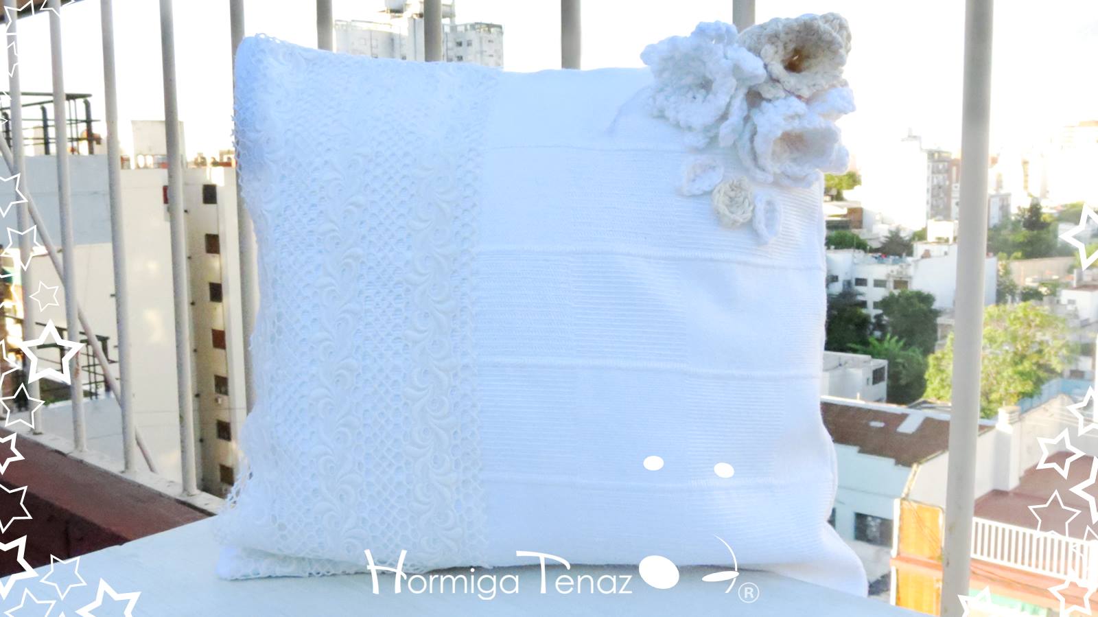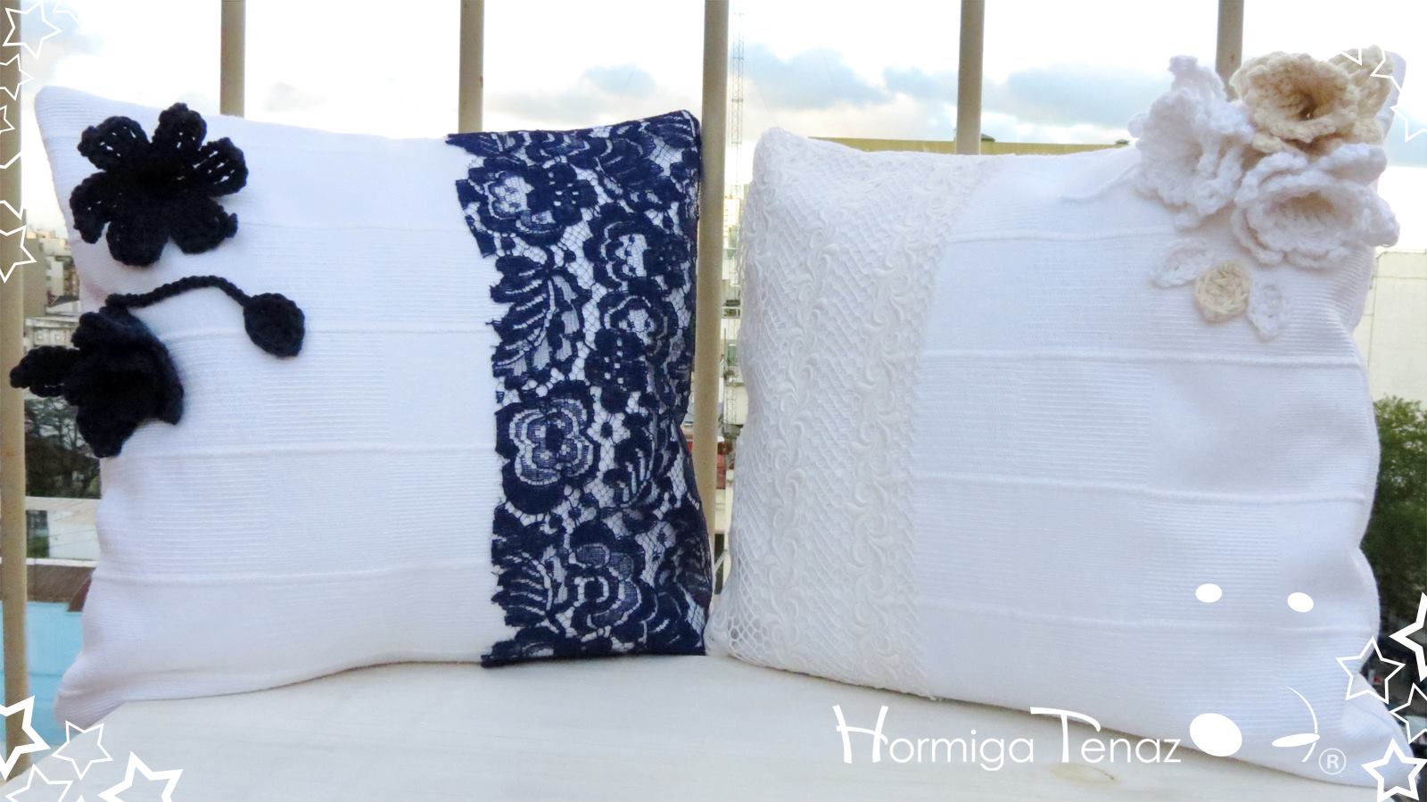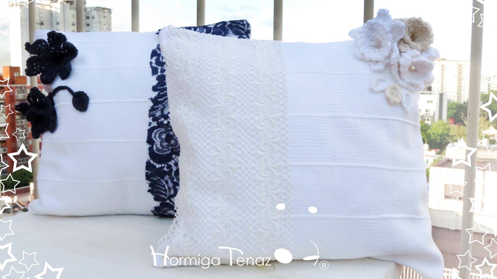 Almohadones realizados en tela de Piqué, con crochet y encajes. Las fundas son desmontables para un mejor lavado y con relleno de vellón siliconado.