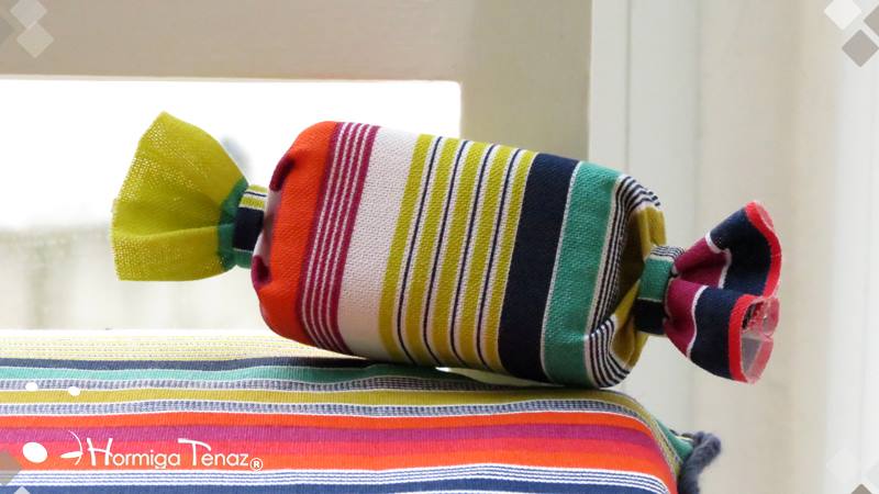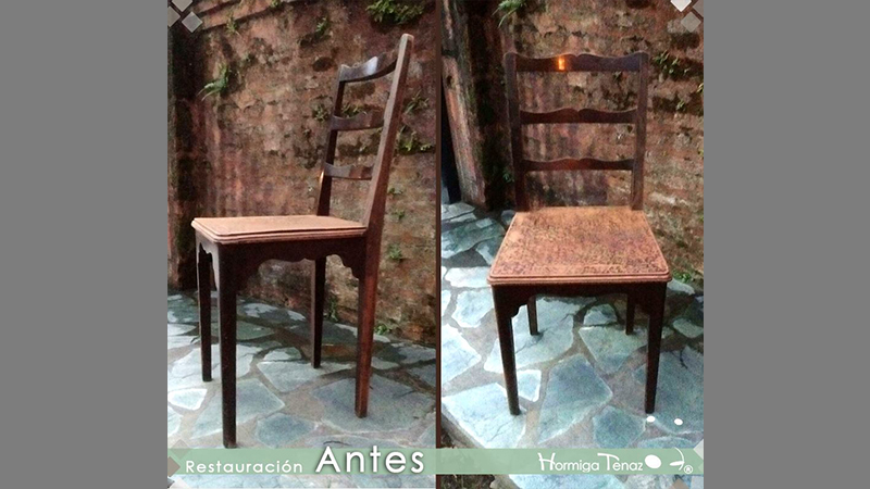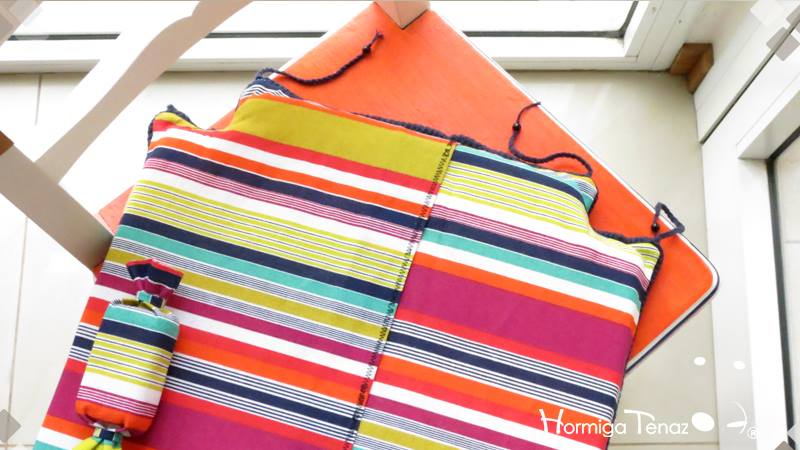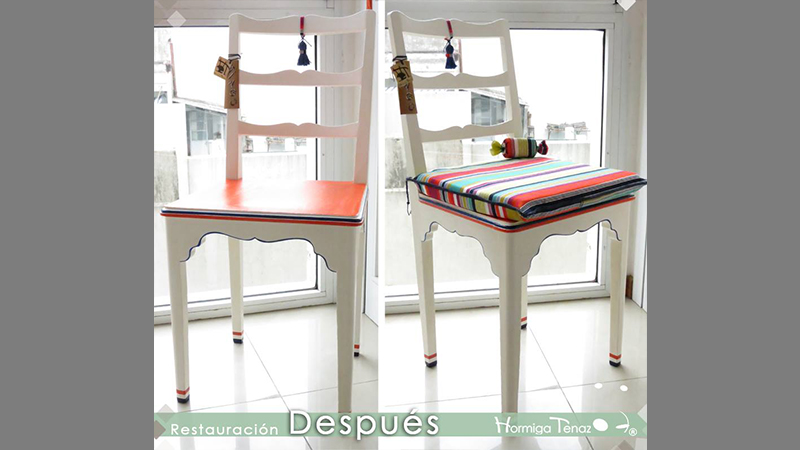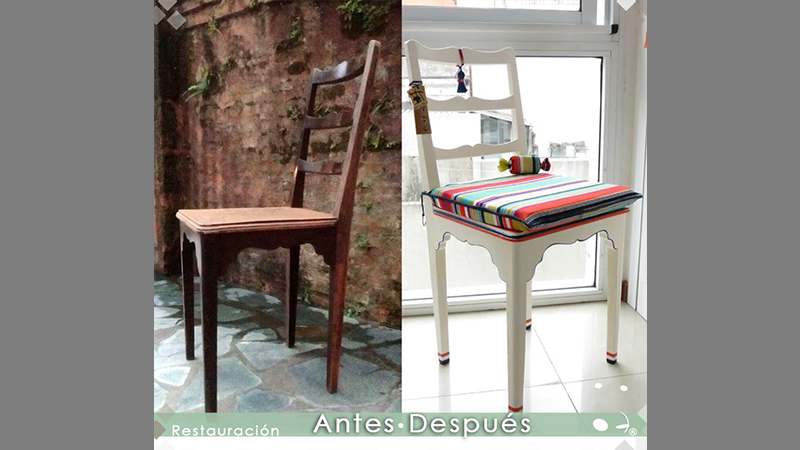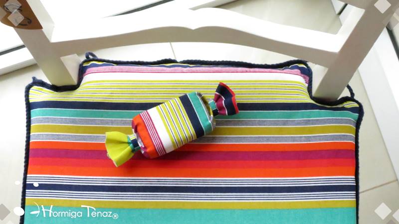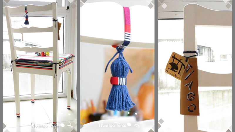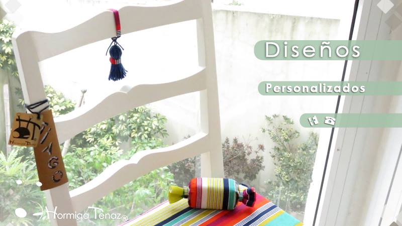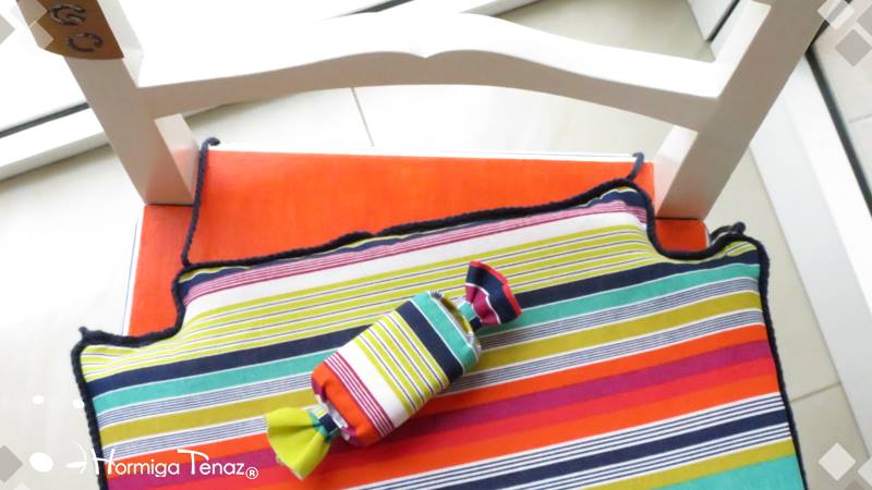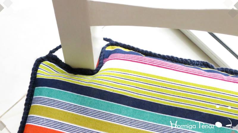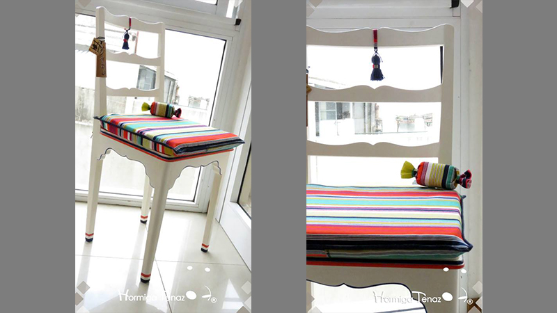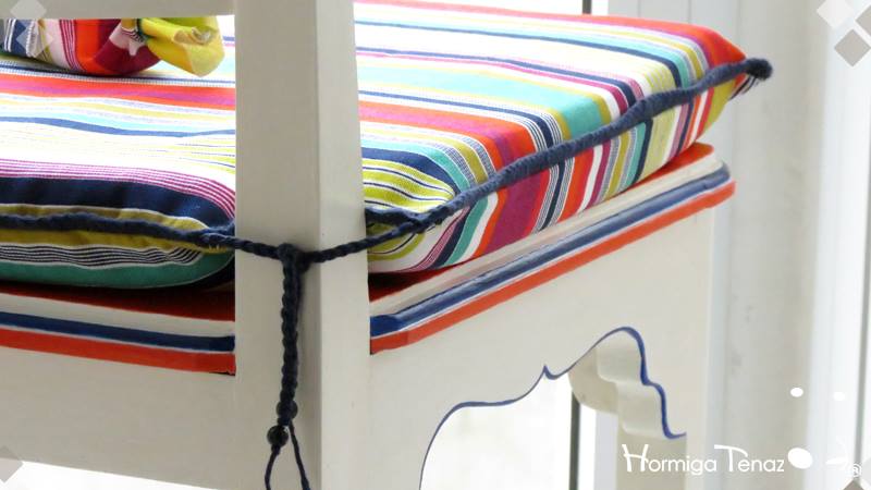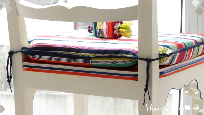 Almohadón confeccionado a la forma de la silla en tela Loneta Provenzal, realizado con sistema de solapas para un mejor lavado de la funda. Con ribete azul oscuro tejido al crochet y con cordones para sujetar el almohadón a la silla, en el mismo color. Y en su interior contiene una placa de goma espuma de 4 cm de espesor. Como detalle final, se realizó un almohadón mini en forma de caramelo, apliques de tela y una borla haciendo juego. Restauración e intervención artística sobre silla antigua, ver Silla Colores Vivos