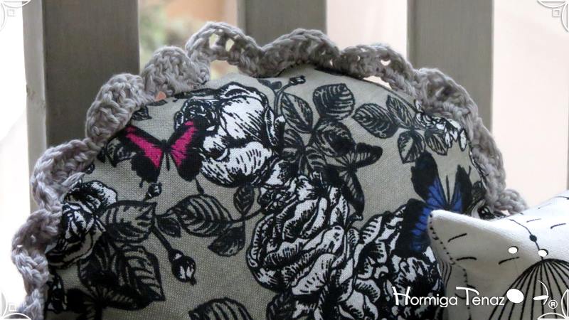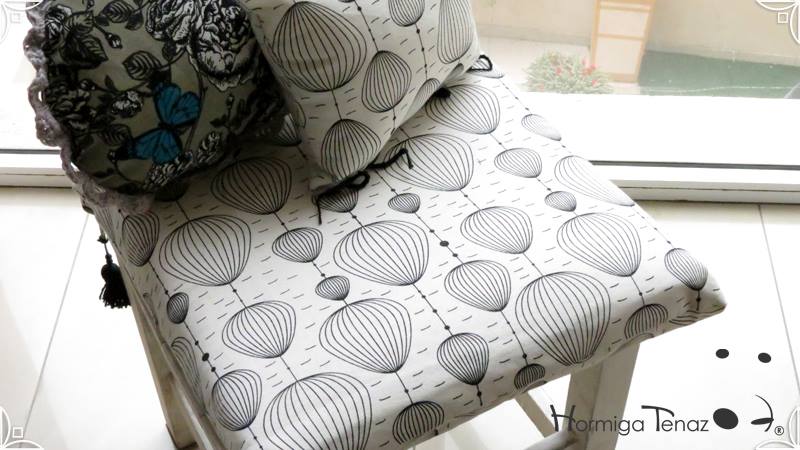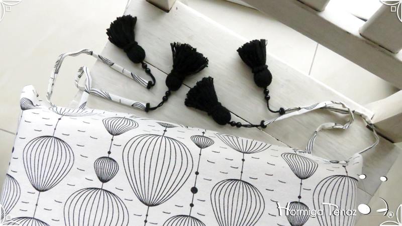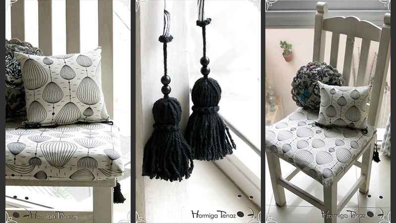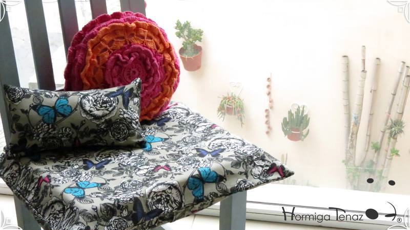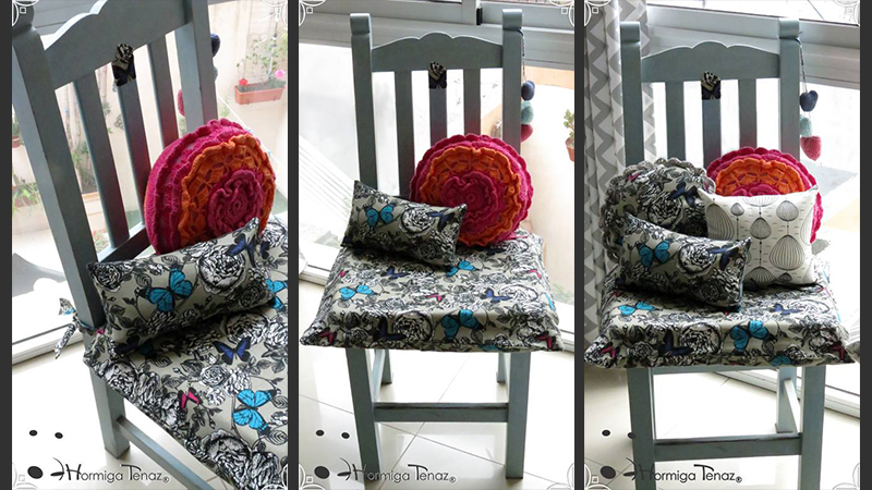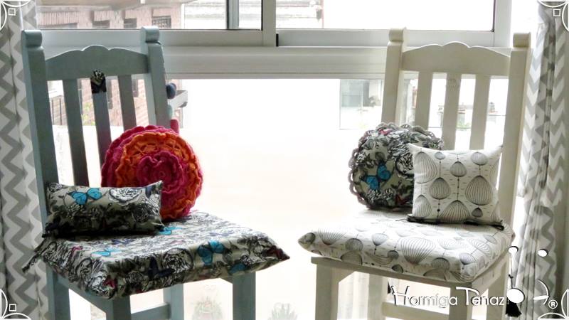Almohadones con dos funciones realizados en tela estampada Loneta Provenzal y uno en especial tejido todo al crochet en color naranja y fucsia. Además los almohadones vienen con detalles en cordones, mostacillas, borlas y volados en crochet. Los de asiento fueron realizados con placa de goma espuma de 8 cm de espesor y con placa de 4 cm de espesor. Los pequeños almohadones de respaldo fueron realizados con relleno de vellón siliconado. Todos los almohadones, excepto el tejido al crochet, tienen fundas con solapas para un mejor lavado.