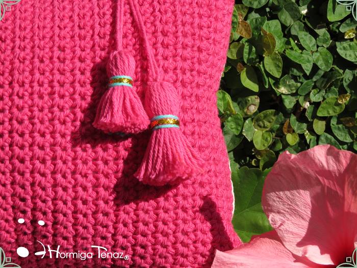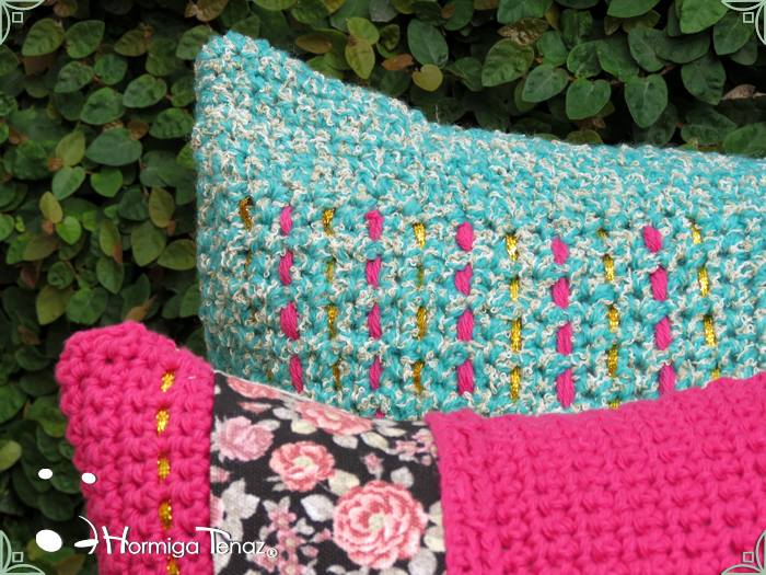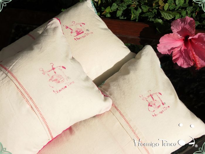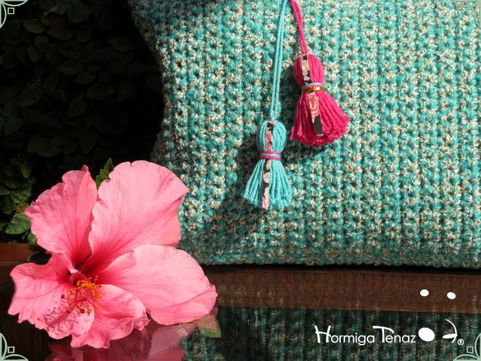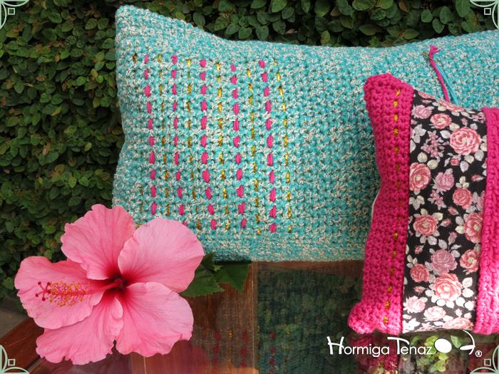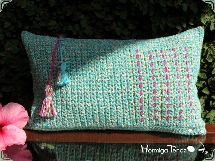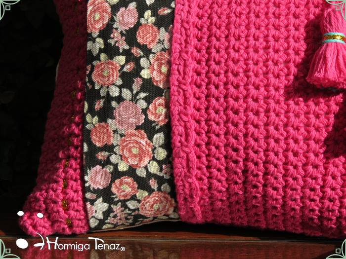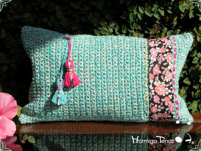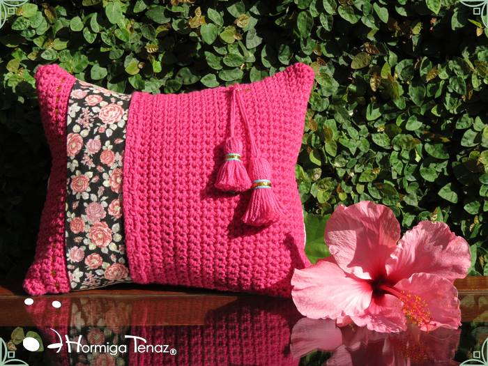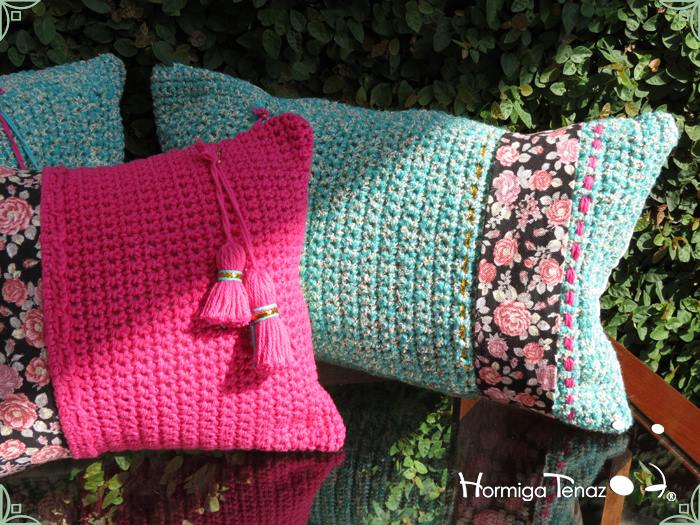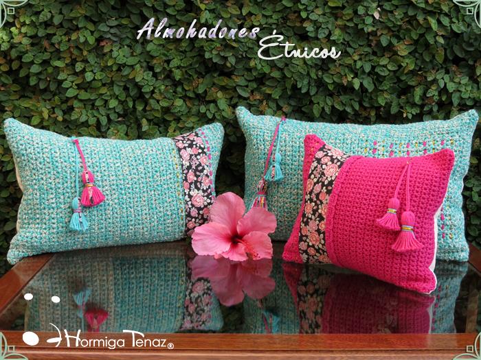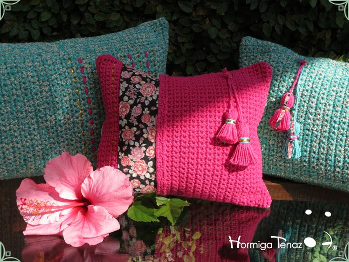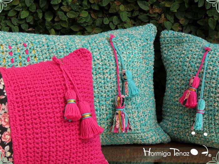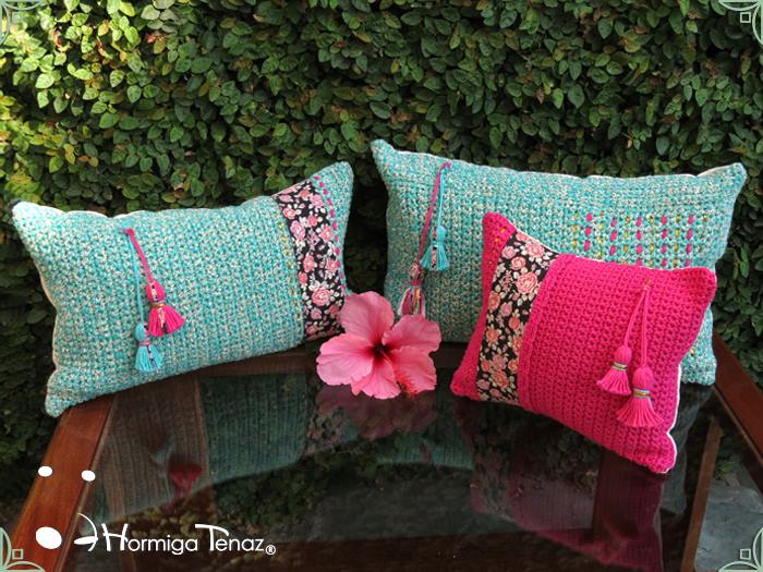 Almohadones tejidos al crochet, con detalles en tela, bordados y apliques de borlas. Realizados con