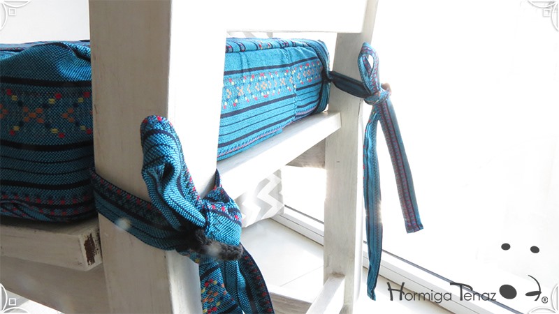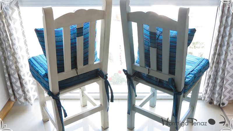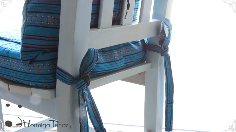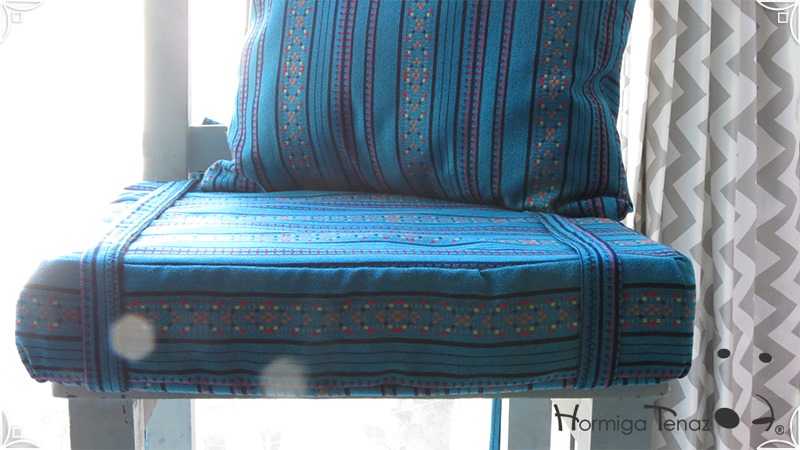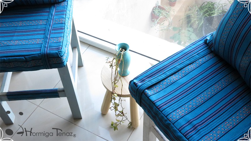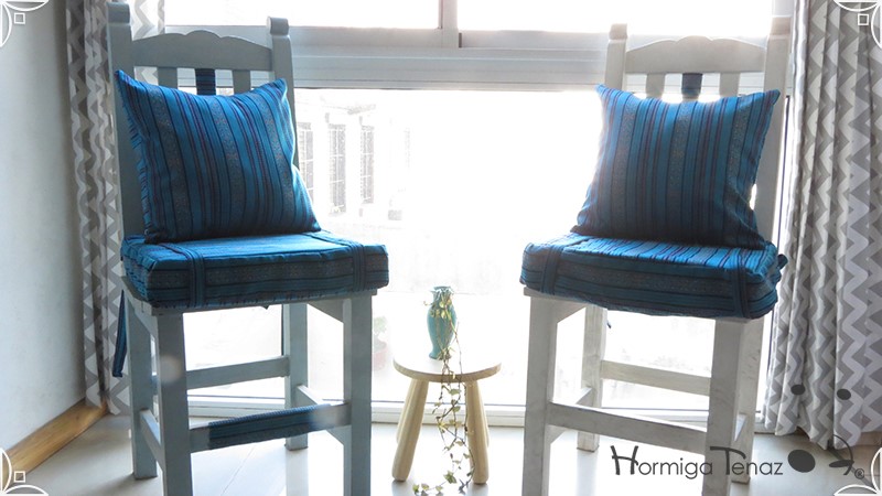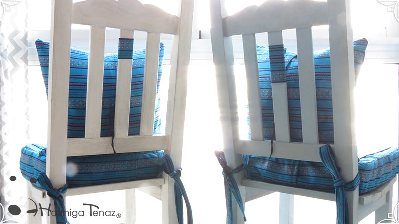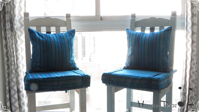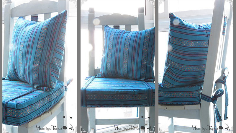Almohadones de asiento de 40x40 cm x 8cm de altura, con placa de goma espuma. + Cintas para sujetar los almohadones a las sillas + almohadones de respaldo rellenos con vellón siliconado de 40x40cm. Todo realizado en tela Aguayo Norteño.