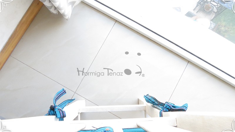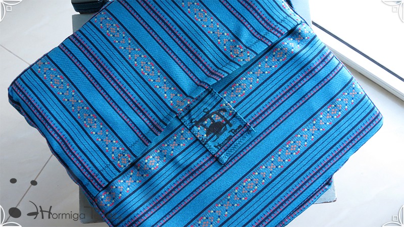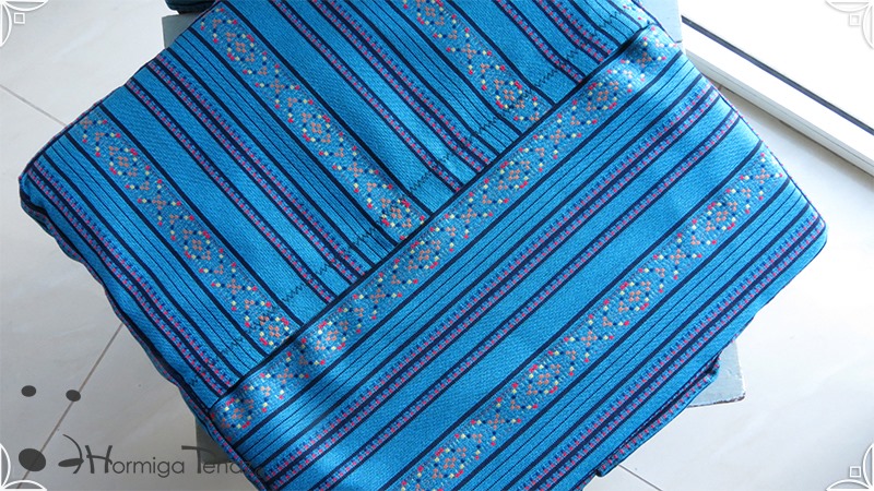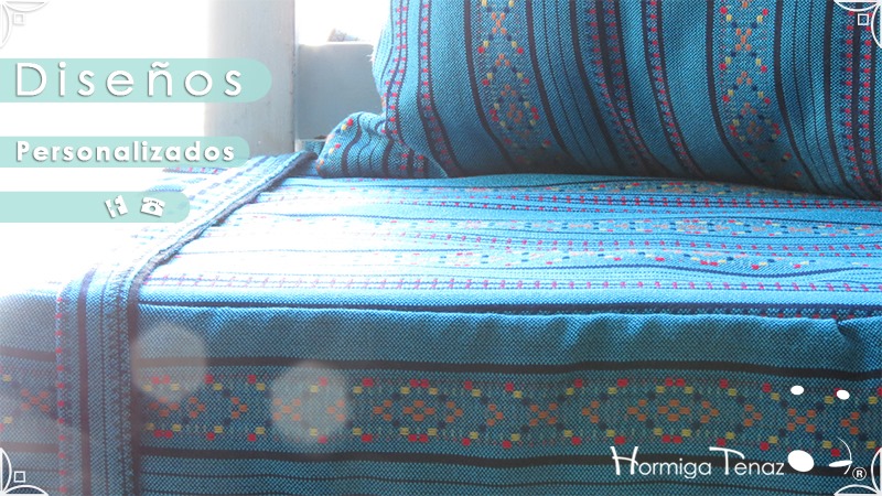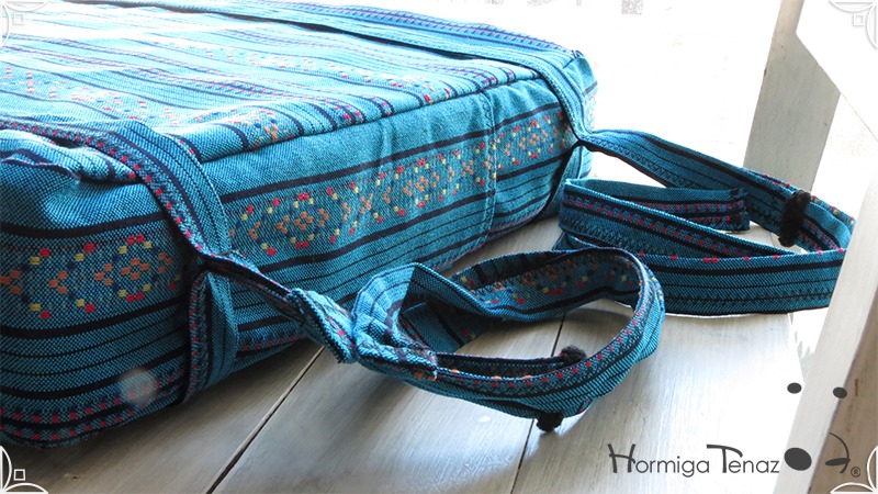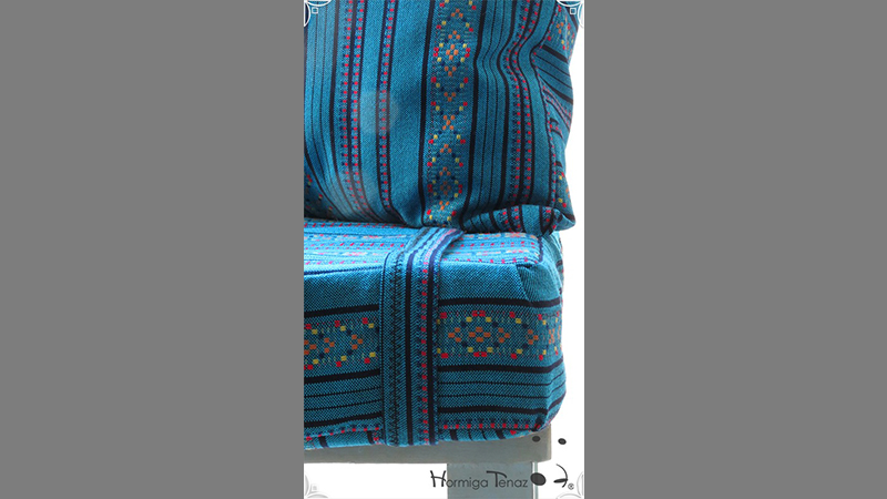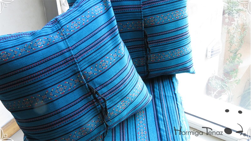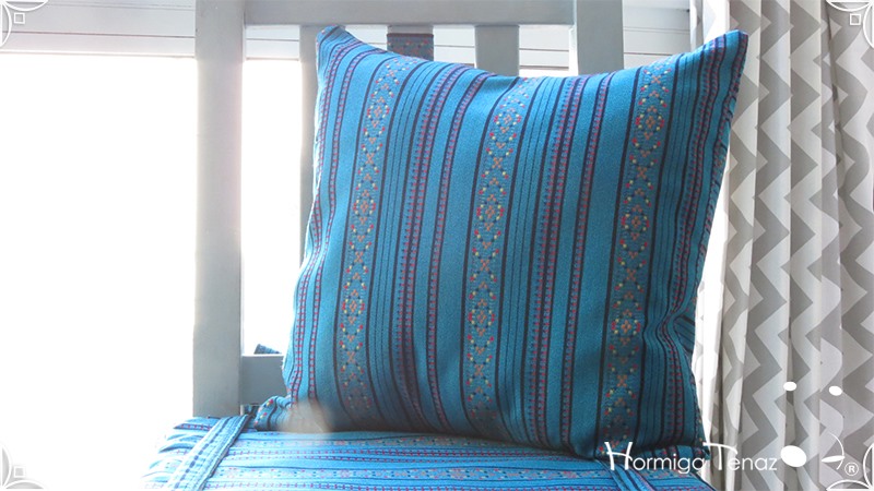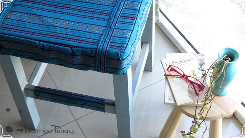 Almohadones de asiento de 40x40 cm x 8cm de altura, con placa de goma espuma. + Cintas para sujetar los almohadones a las sillas + almohadones de respaldo rellenos con vellón siliconado de 40x40cm. Todo realizado en tela Aguayo Norteño.