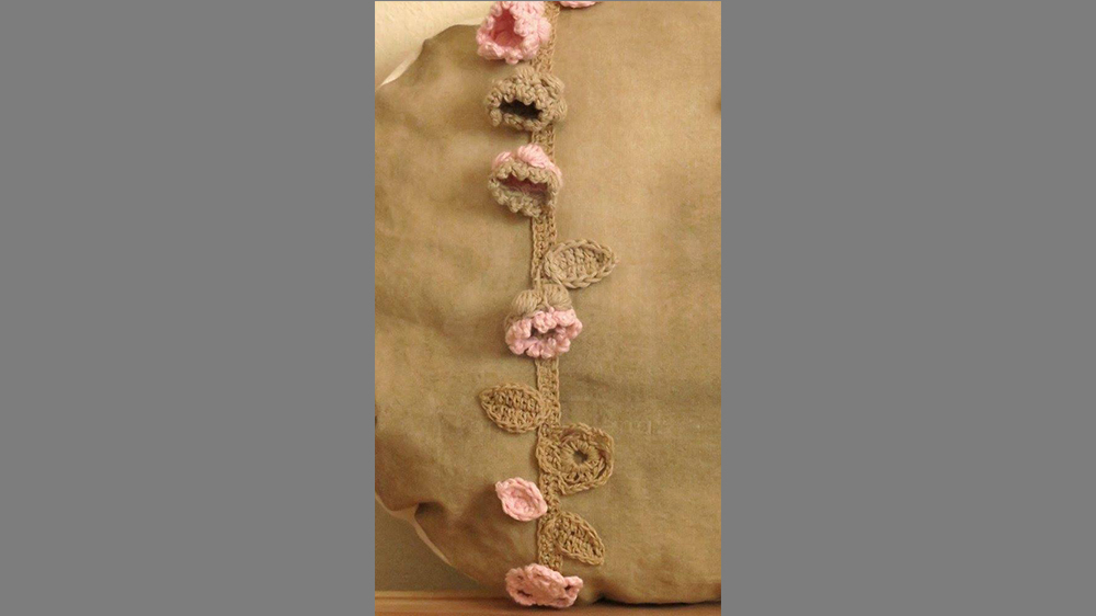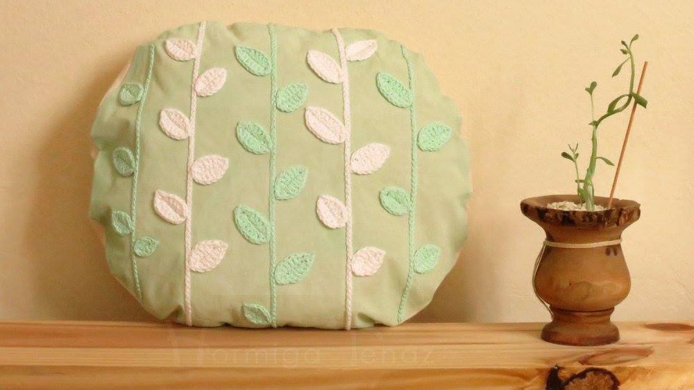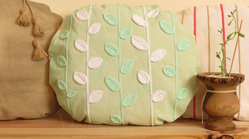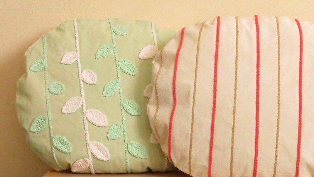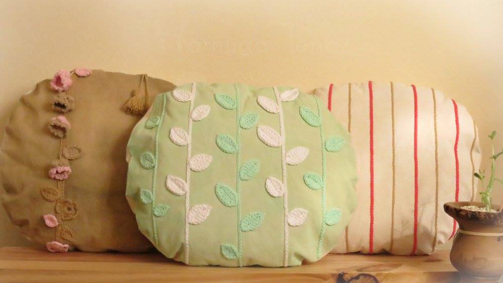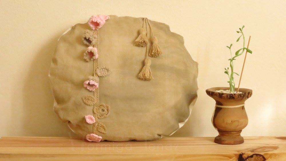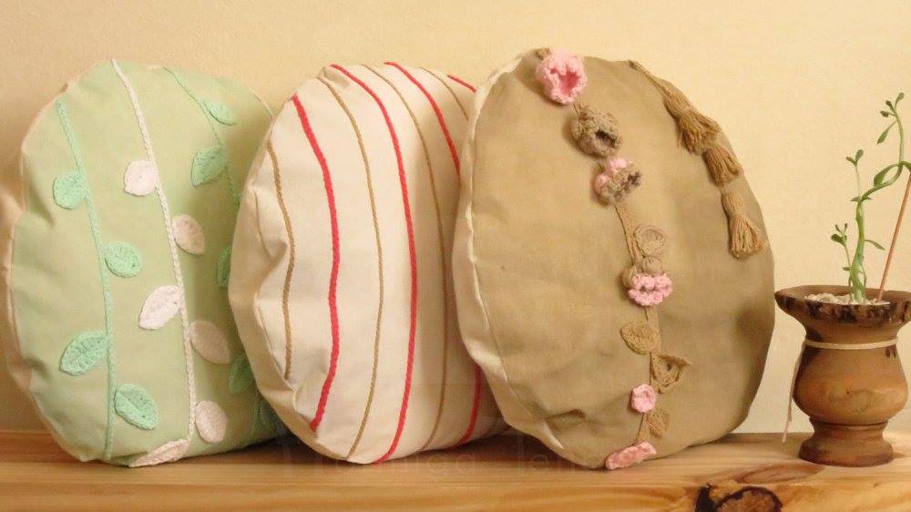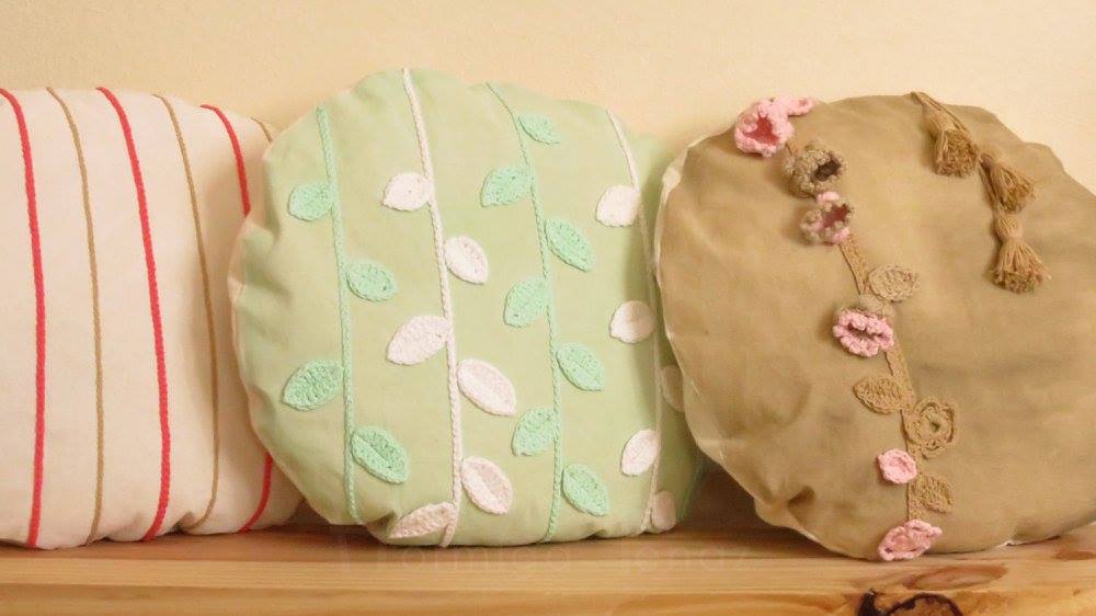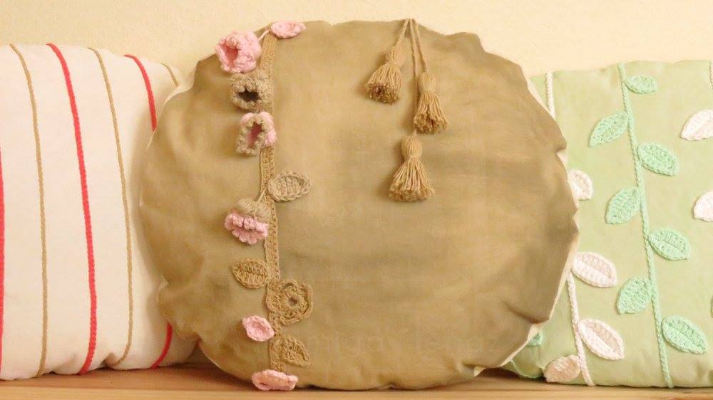 Almohadones circulares realizados en tela de lienzo, teñidos artesanalmente, con diseños en crochet y flores de amigurumi. Rellenos de vellón siliconado y con sistema de solapas para un fácil lavado.
