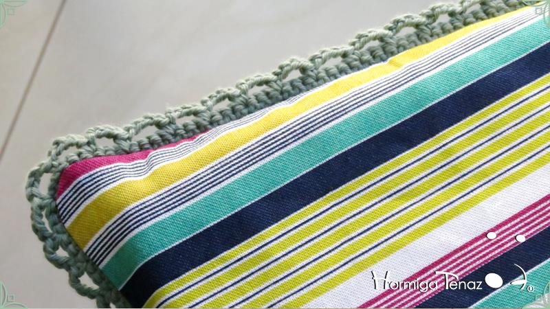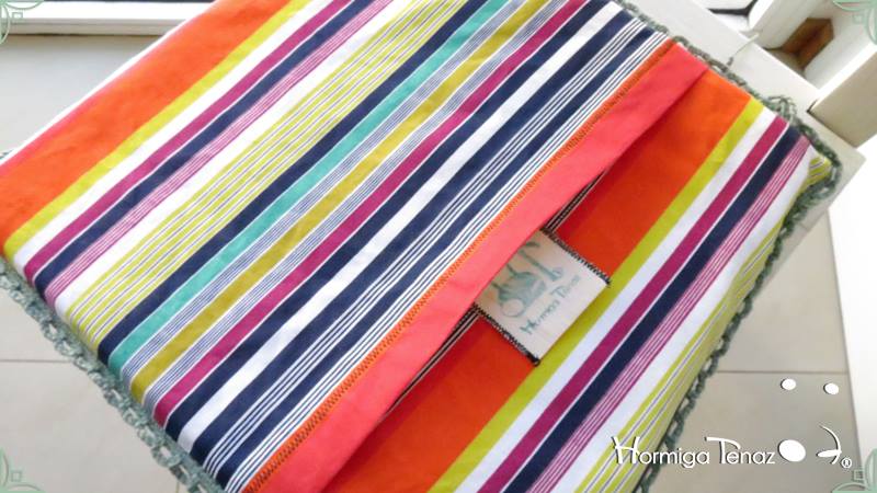 sistema de solapas para un práctico lavado. Terminación en ribete tejido al crochet y cordones para sujetar a la silla, hechos también con crochet.
