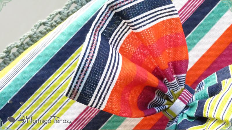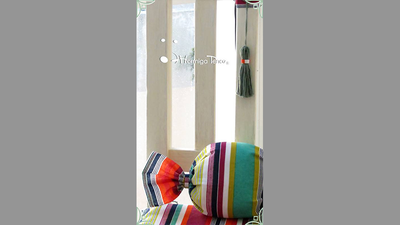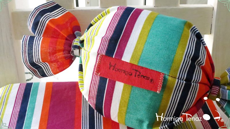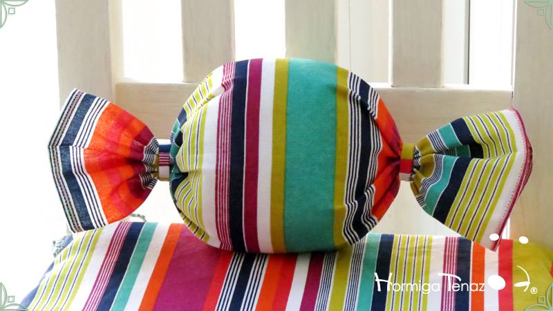 El almohadón en su interior contiene una placa de goma espuma de 4cm de espesor. Como detalle final, se realizó un pequeño almohadón en forma de caramelo relleno de vellón siliconado, acompañado de una borla y detalles textiles.