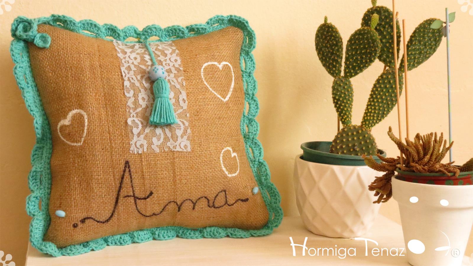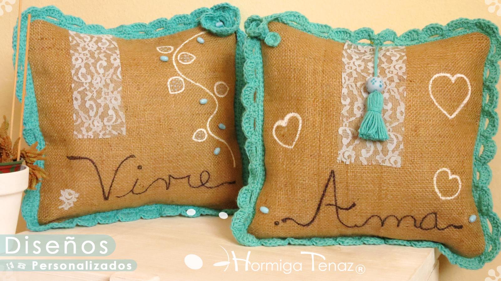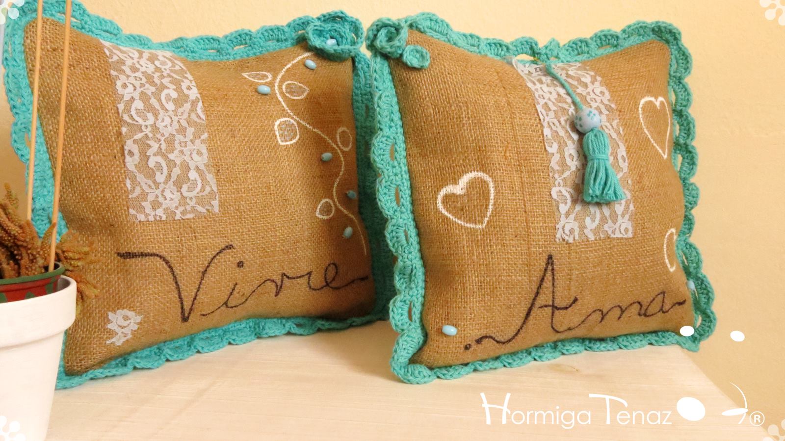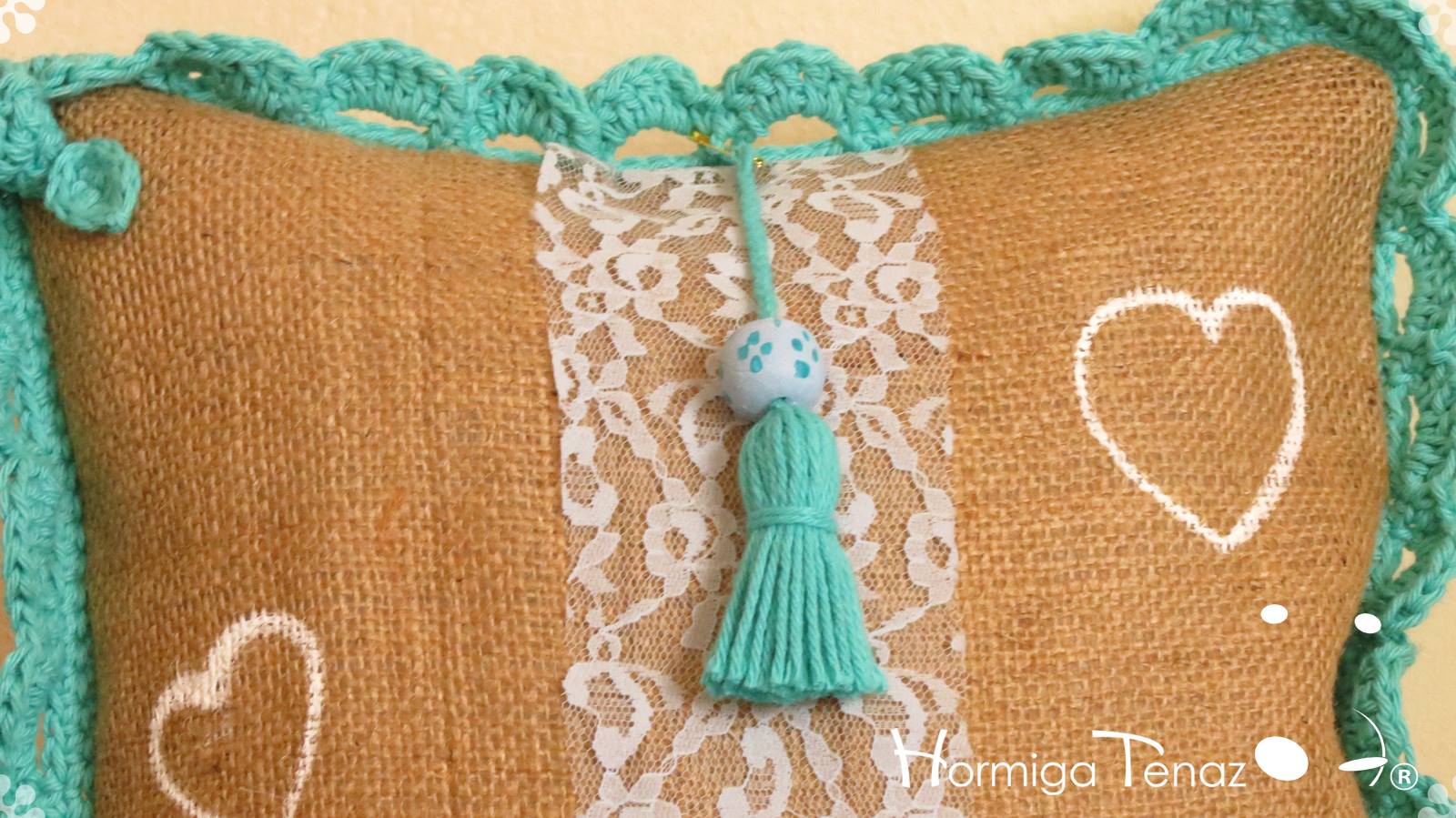 Almohadones de arpillera pintados a mano con volados en crochet, bordado con mostacillas artesanales, detalles en encaje, y aplique de borla. Fundas lavables.