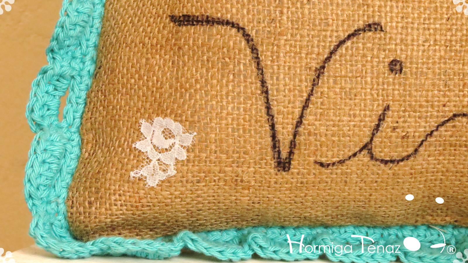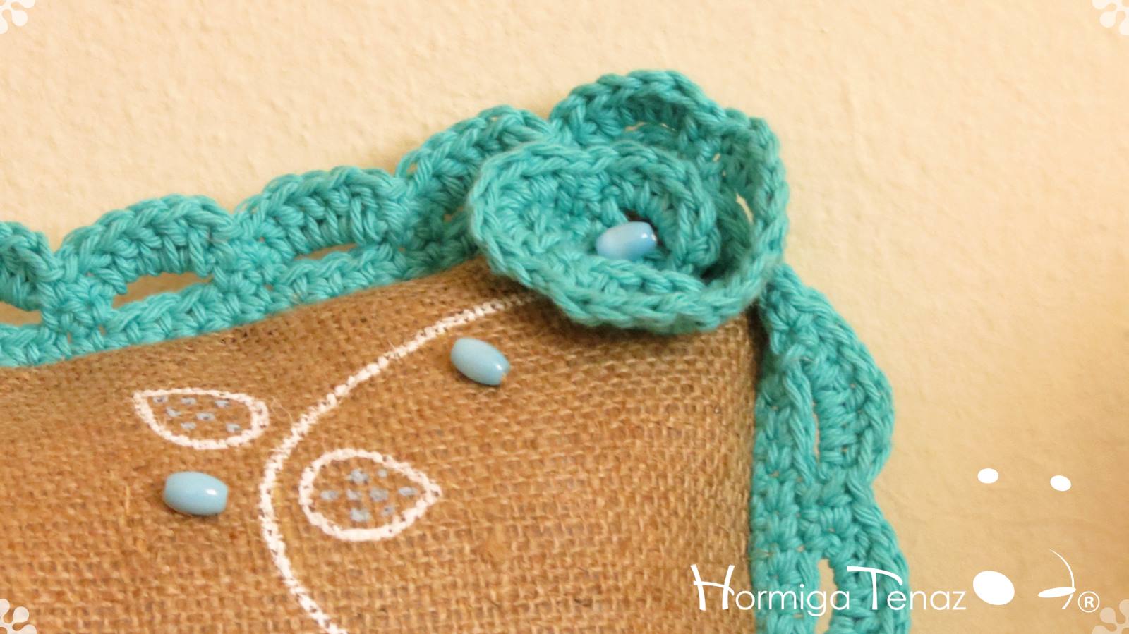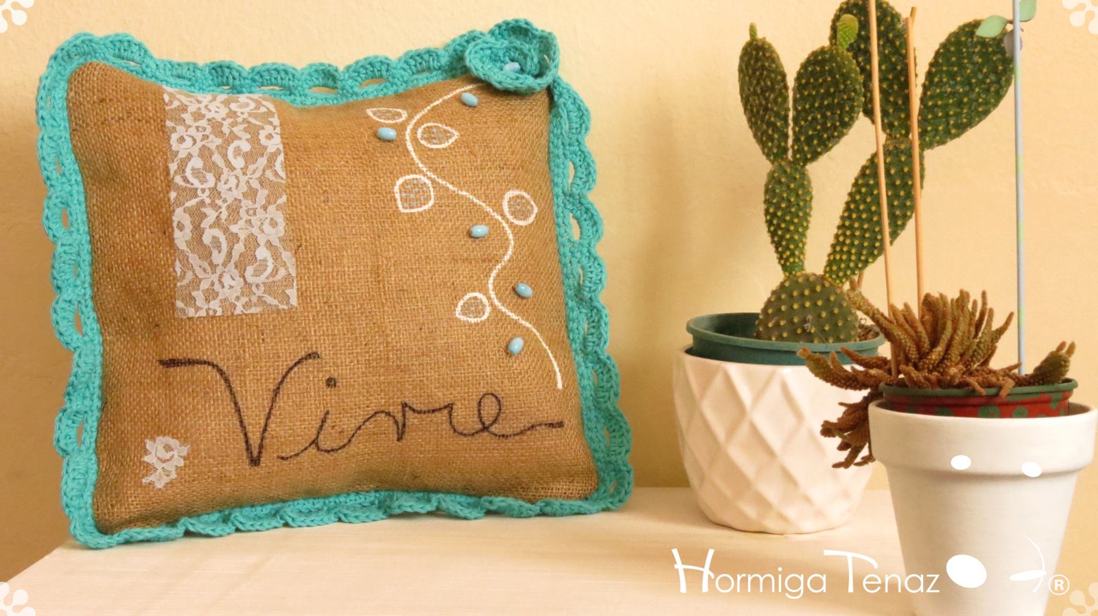 Almohadones de arpillera pintados a mano con volados en crochet, bordado con mostacillas artesanales, detalles en encaje, y aplique de borla. Fundas lavables.