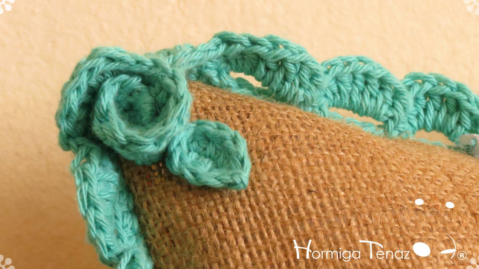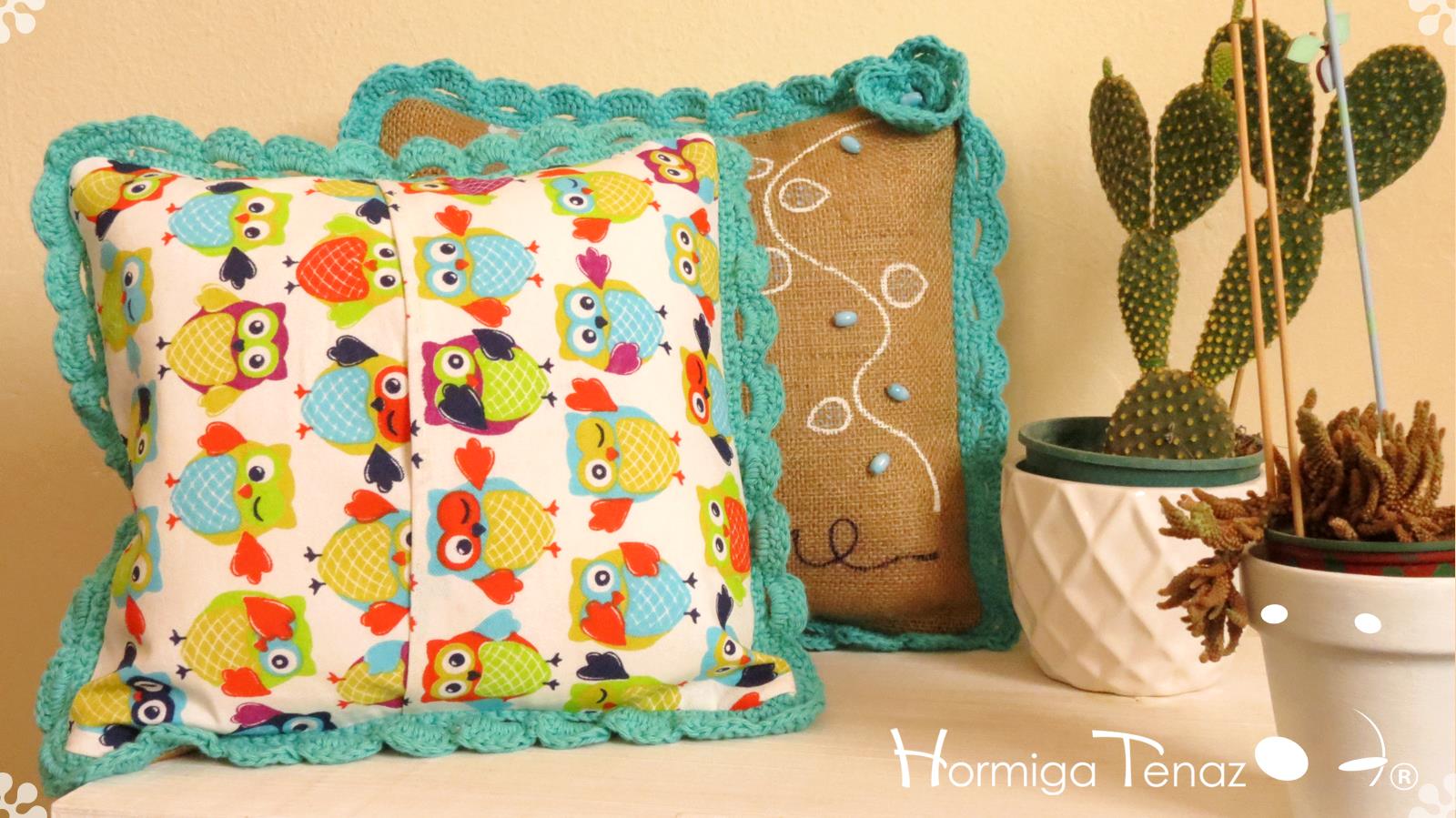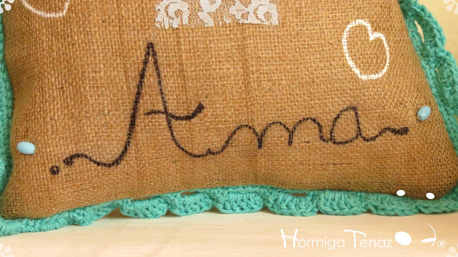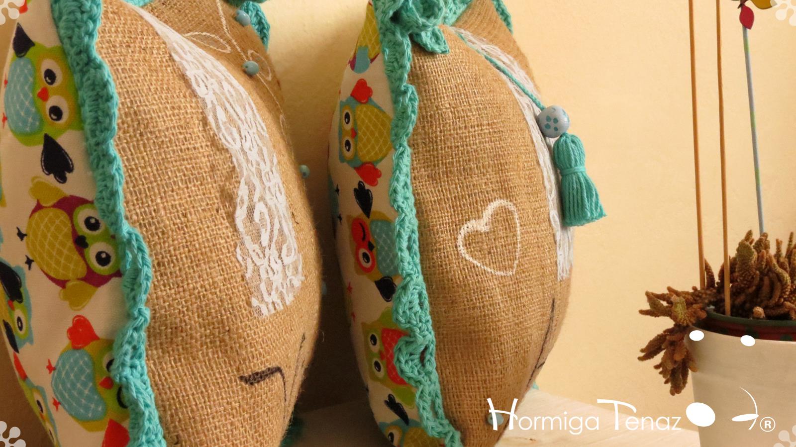 Almohadones de arpillera pintados a mano con volados en crochet, bordado con mostacillas artesanales, detalles en encaje, y aplique de borla. Fundas lavables.