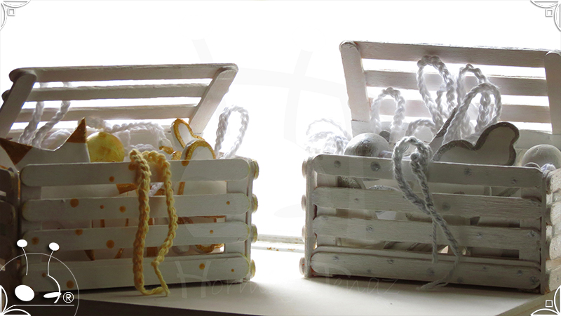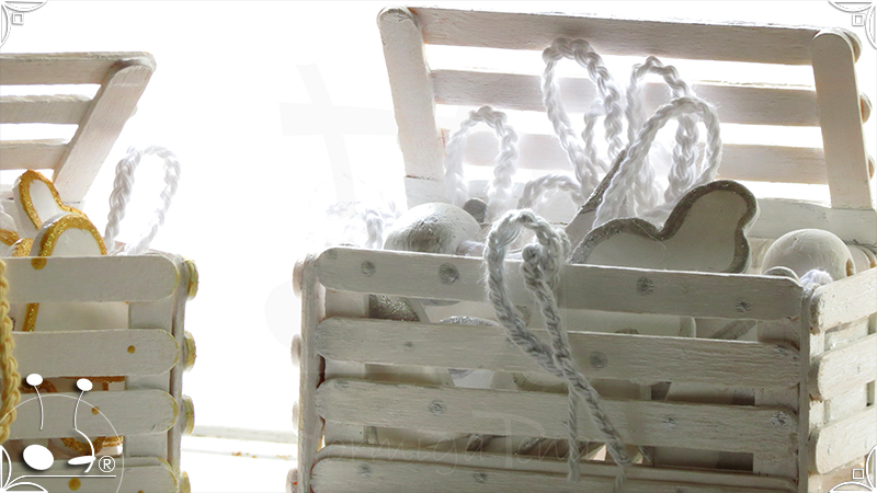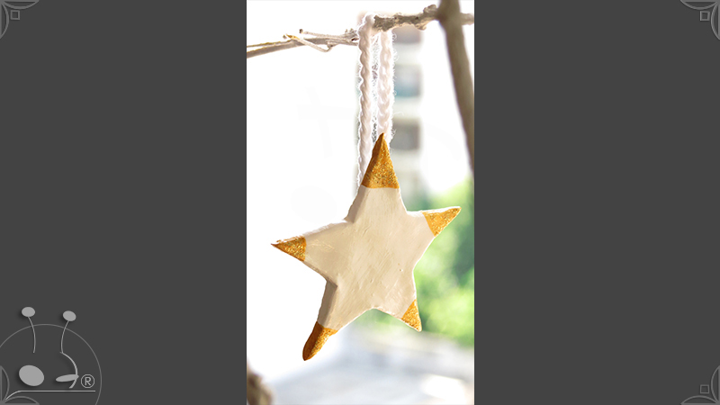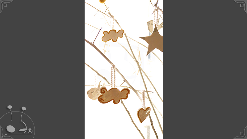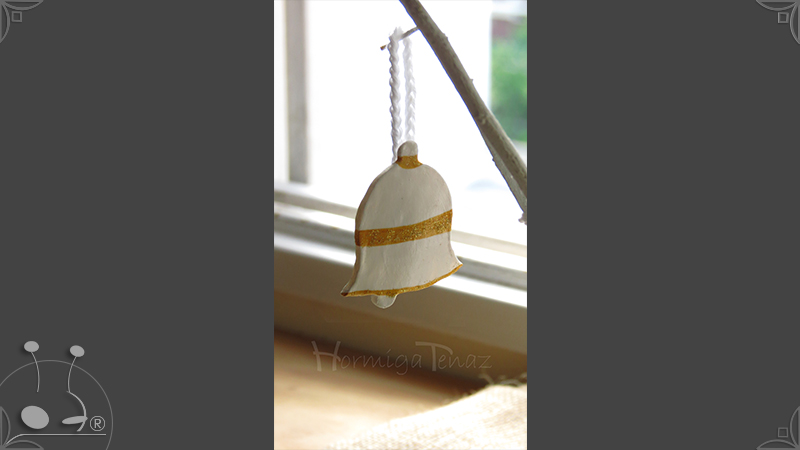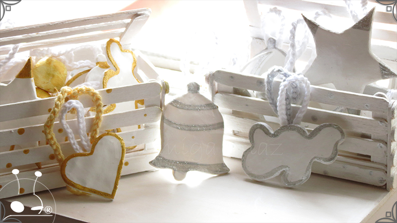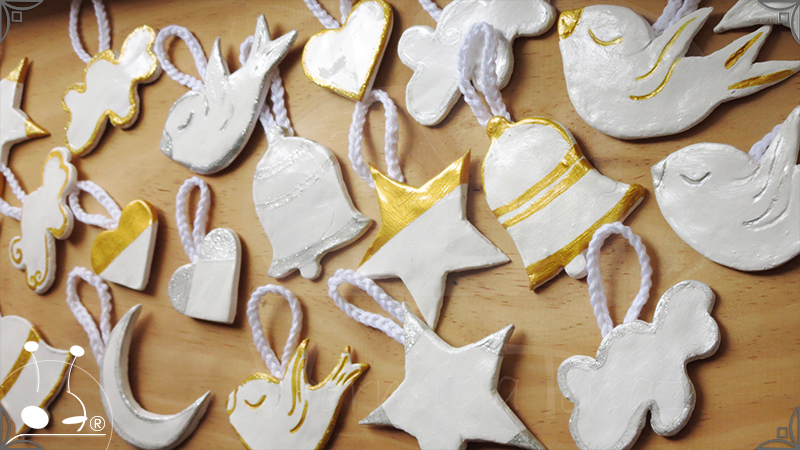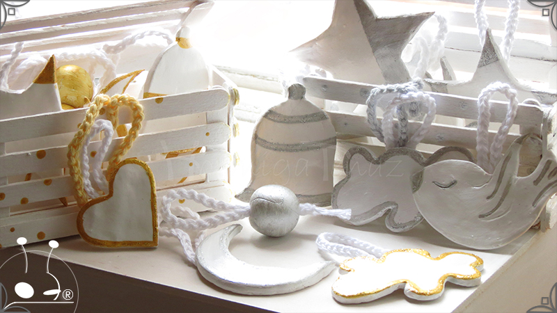 Adornos artesanales para árbol de navidad realizados en porcelana fría. Son dos combinaciones de 13 piezas, una en dorado y la otra en plateado con cordones tejidos al crochet.