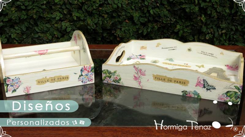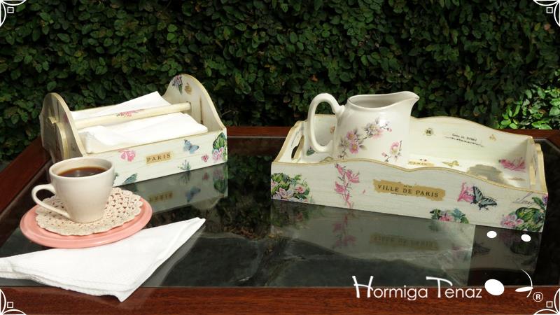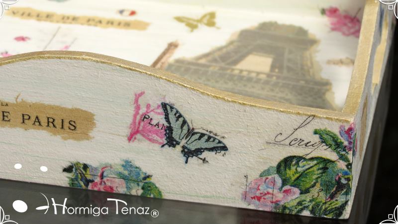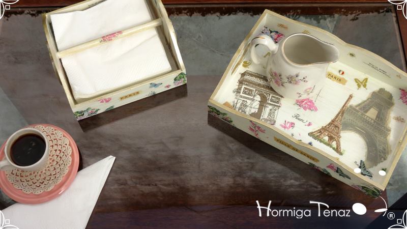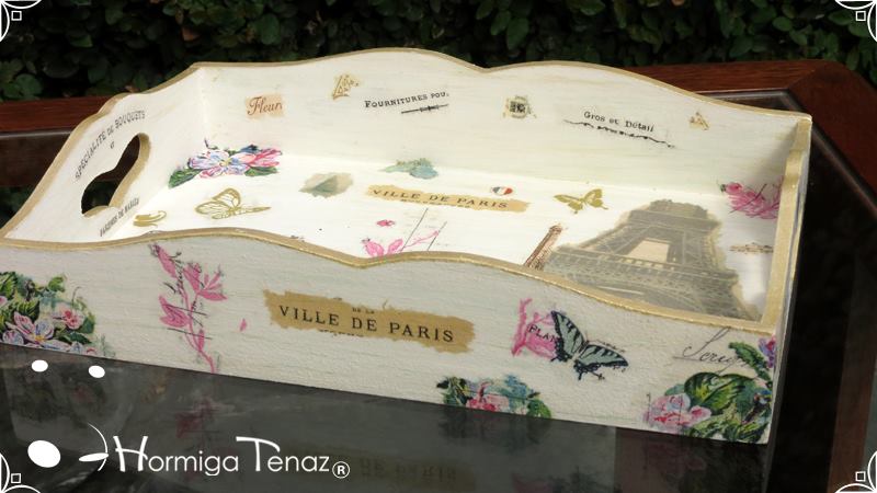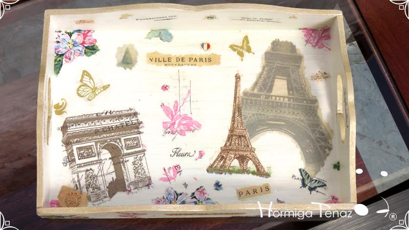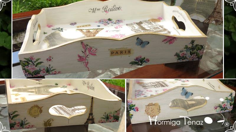 | Bandeja con curvas y manijas corazón intervenida en decoupage y pintura con temática parisina. Realizado a pedido en combinación con el Servilletero París. Diseño Personalizado ✎