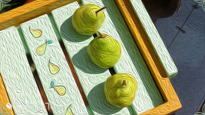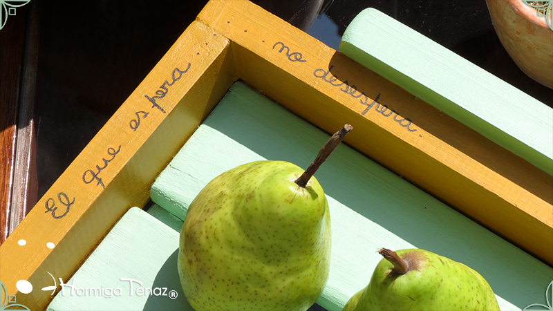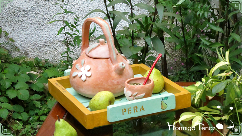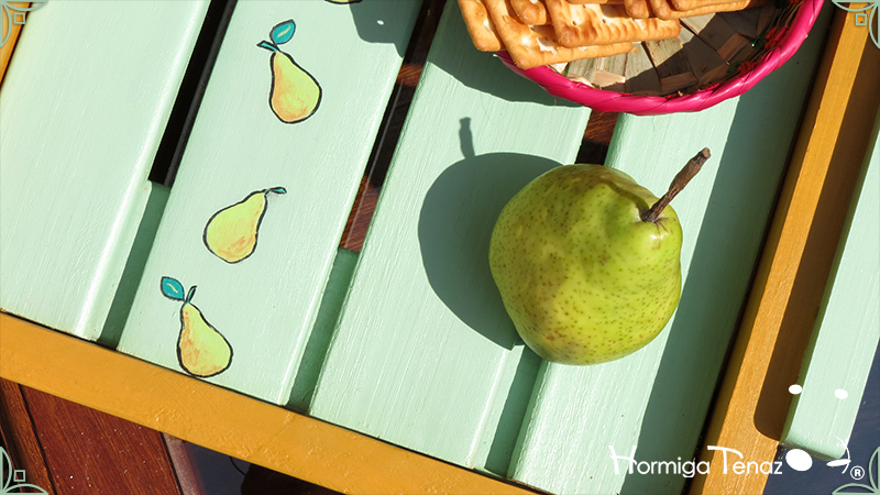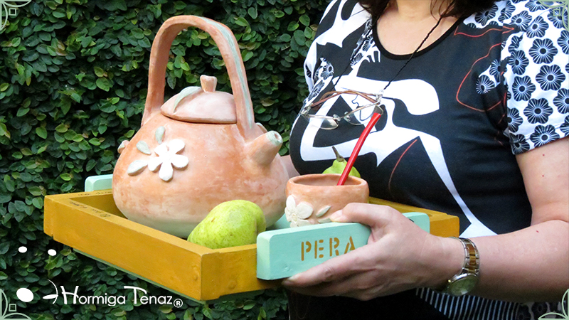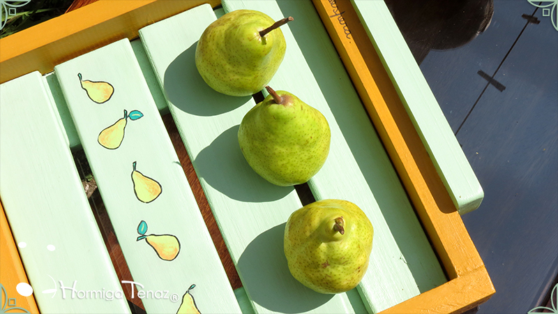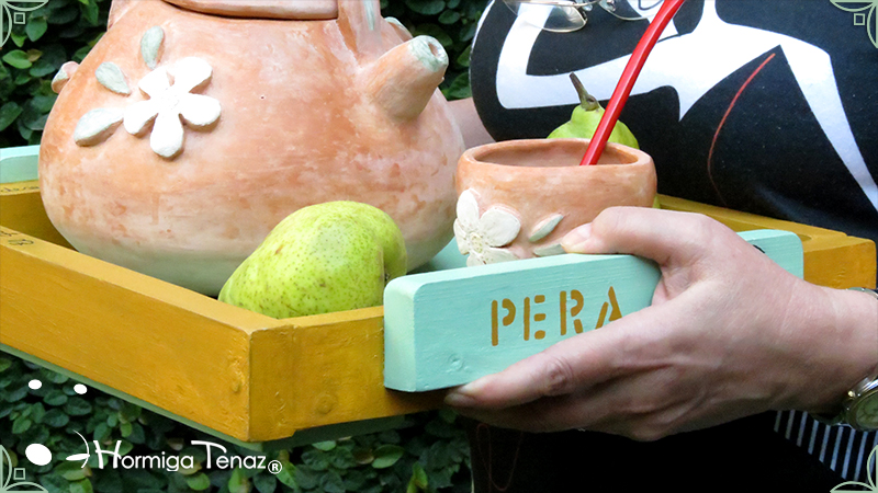Sólida Bandeja artesanal realizada en madera maciza, y con asas de madera modeladas. Pintada a mano y decorada con un patrón de peras y texto. Esta bandeja se realizó haciendo juego con Pava & Mate A la Pera.
