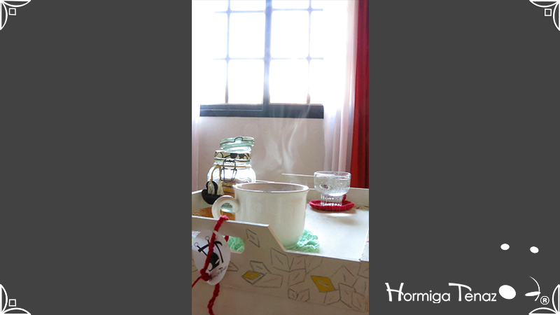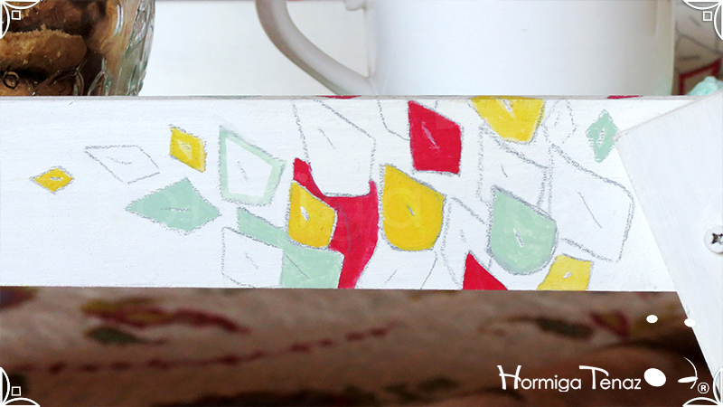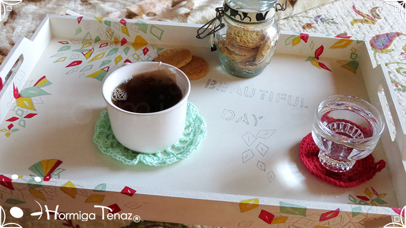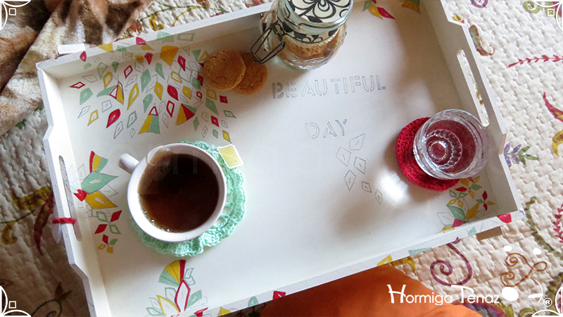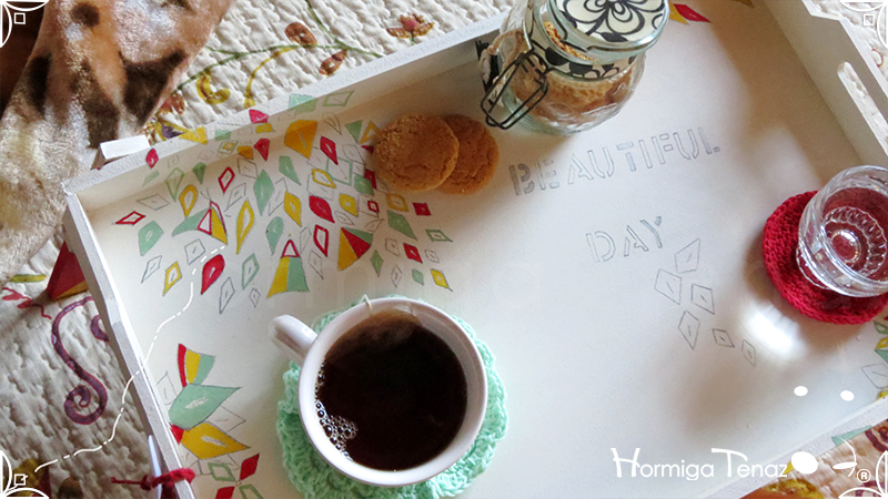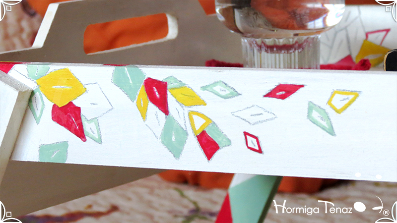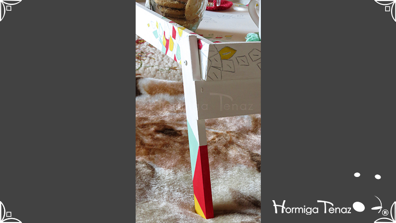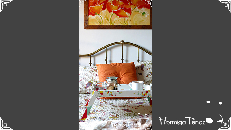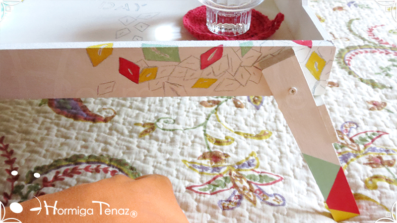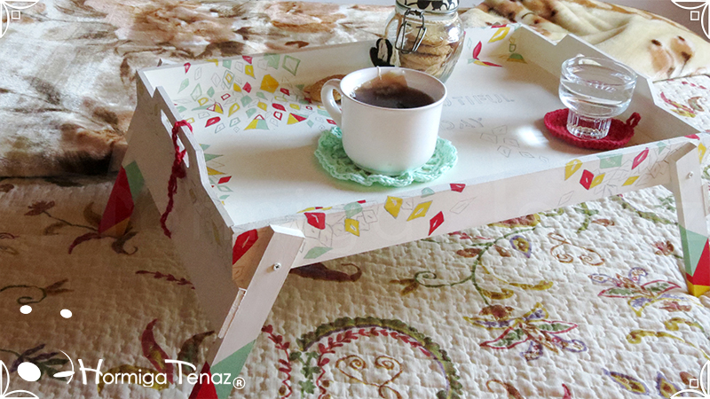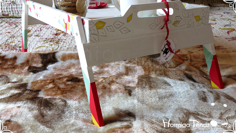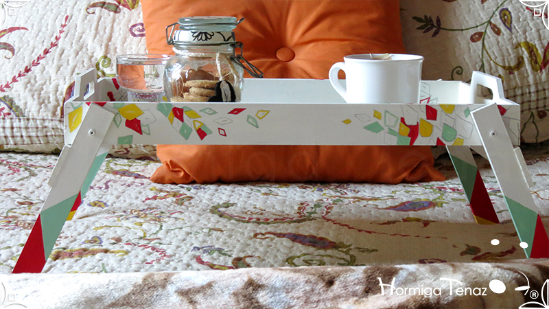 Bandeja rebatible de madera, ilustrada y pintada a mano, e impermeabilizada con barniz mate.