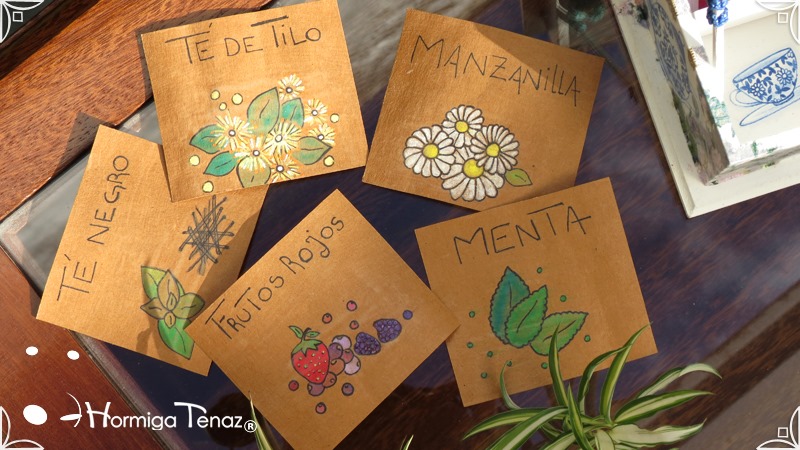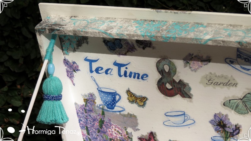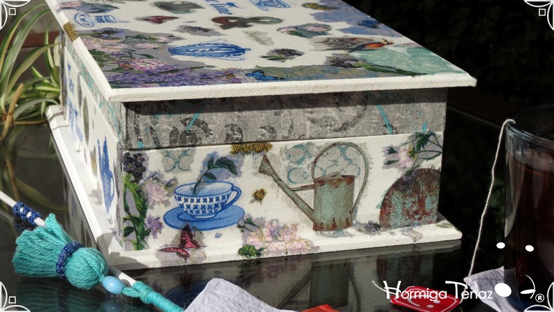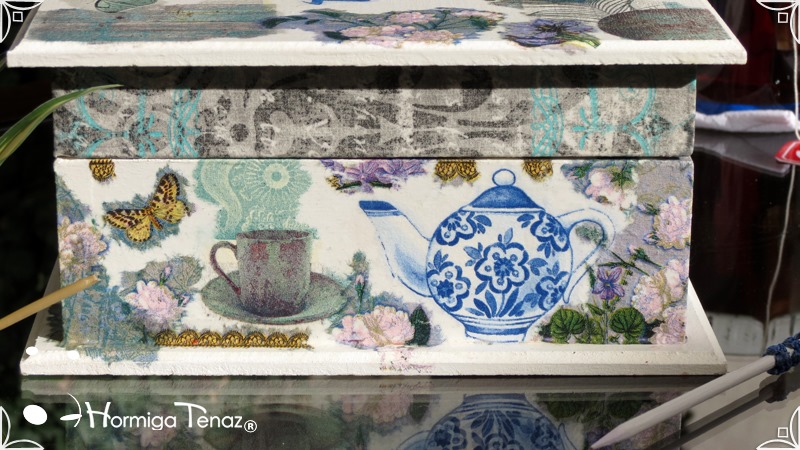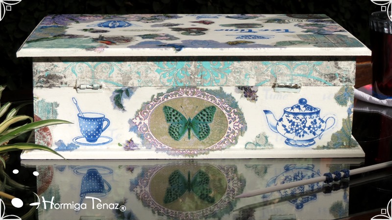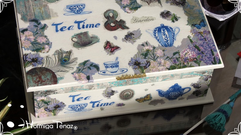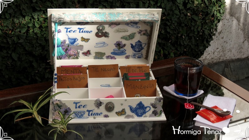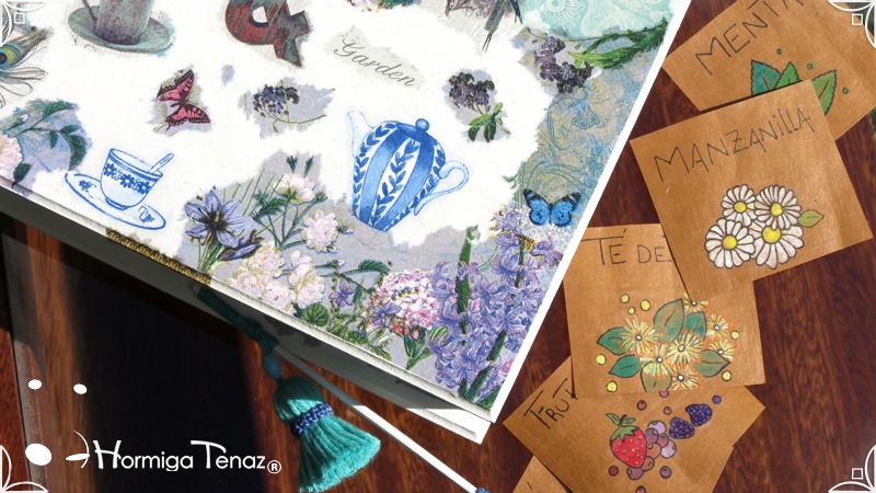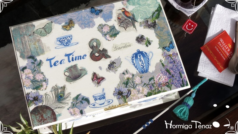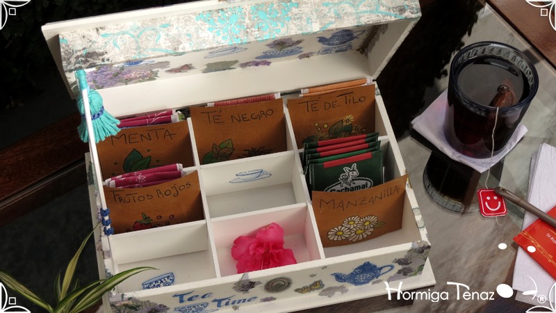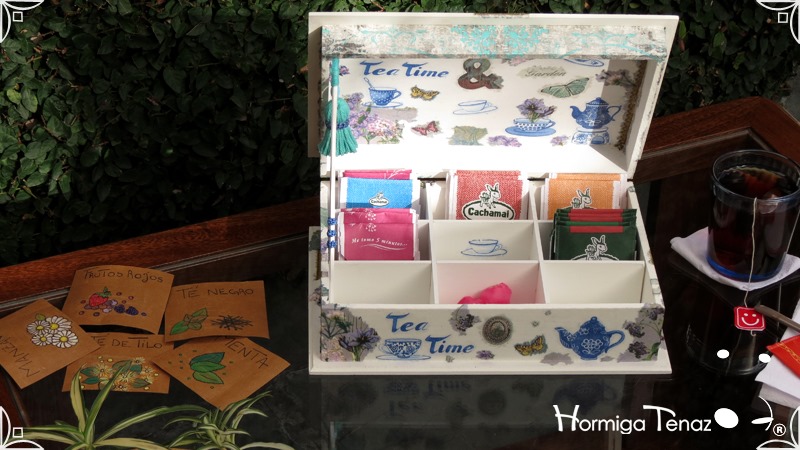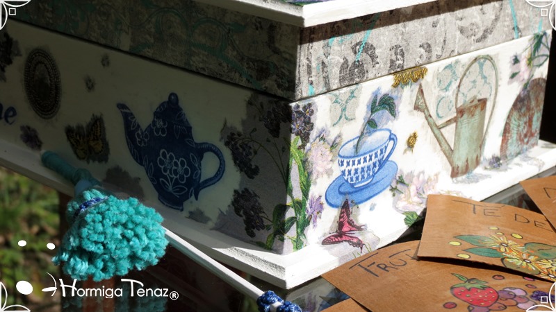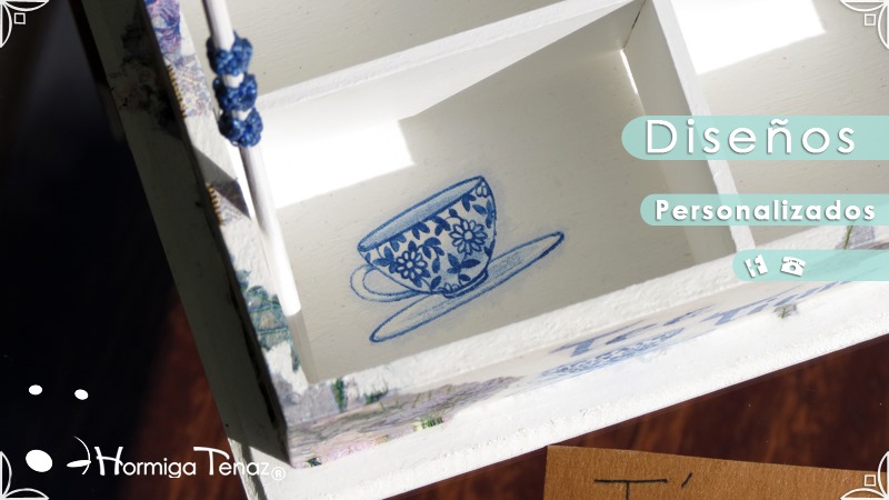 Caja de madera para té con nueve divisiones intervenida en decoupage, acompañado de cinco rótulos pintados a mano para organizar el té y una varilla artesanal con mostacilla y puntilla azul.