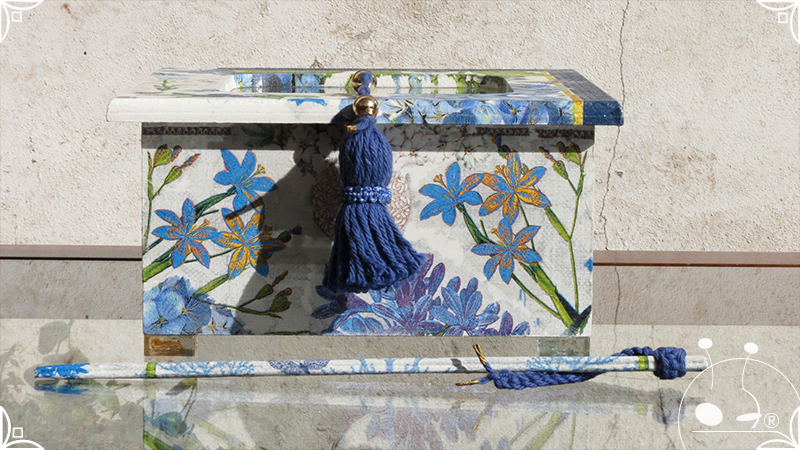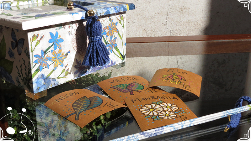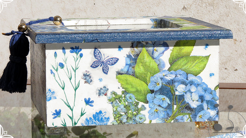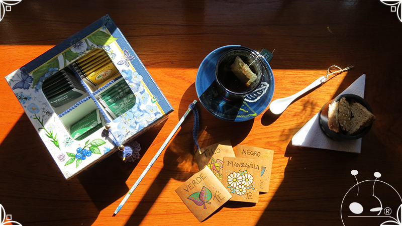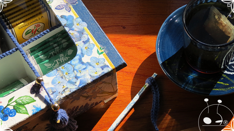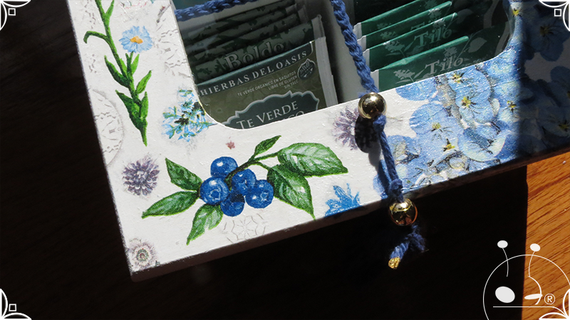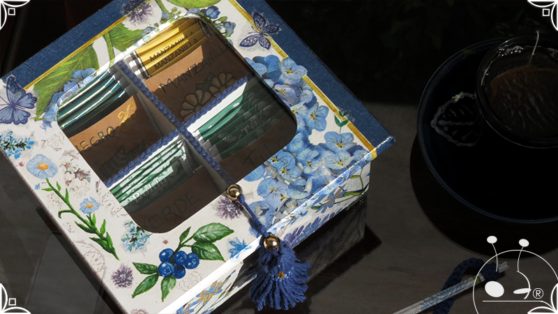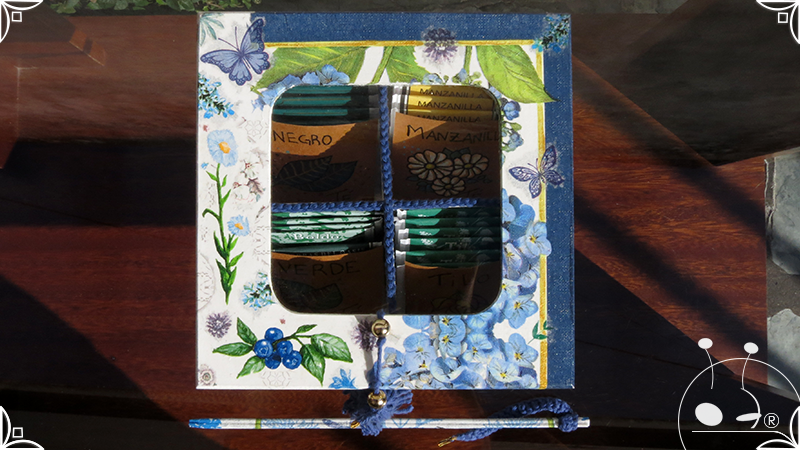 Caja de té de madera con cuatro divisiones intervenida en decoupage, pintura y venecitas de vidrio para el apoyo de la caja sobre superficies. La temática principal a pedido del cliente, fue la abundante presencia del azul y sus variantes. La Caja de té contiene, además, un tirador realizado con borla, mostacillas y una cintura de cordel azul. En el interior presenta terminaciones con cordón de crochet azul y detalles en decoupage. Se complementa con rótulos pintados a mano estilo arte egipcio para organizar el té y una varilla artesanal para sostener la tapa de la caja de té.