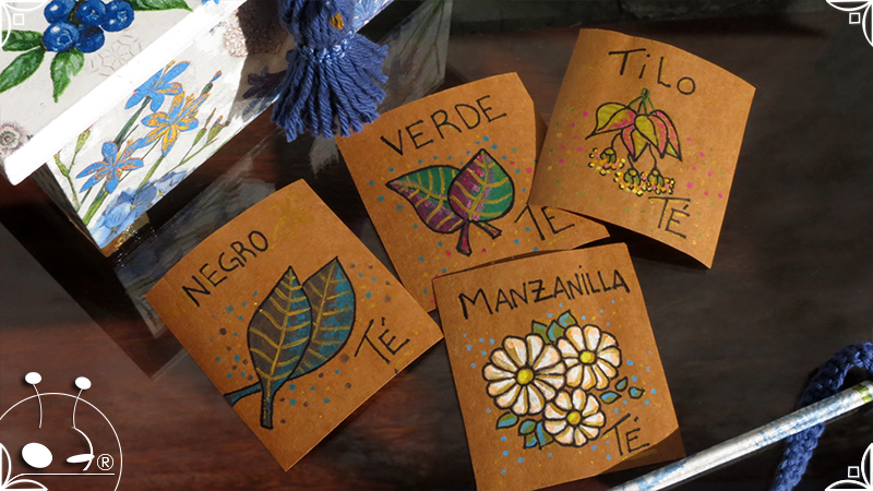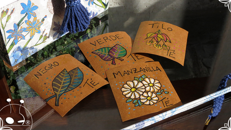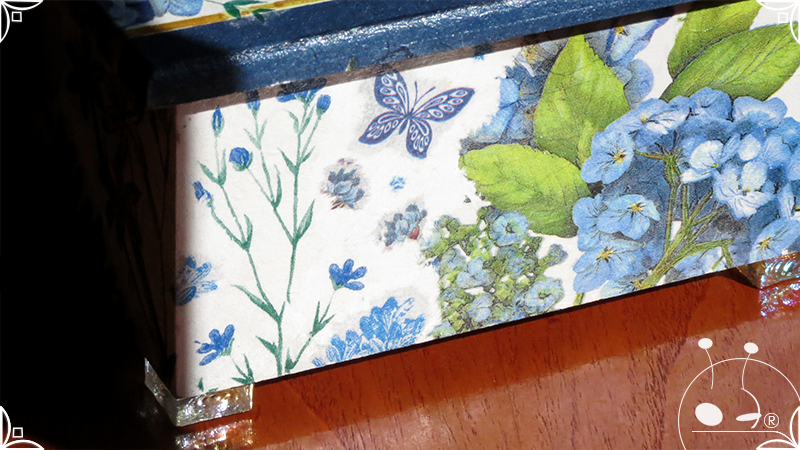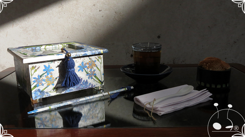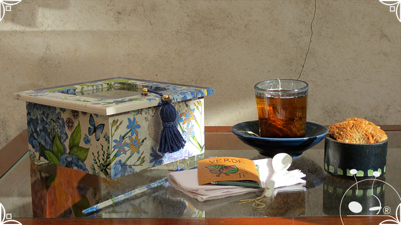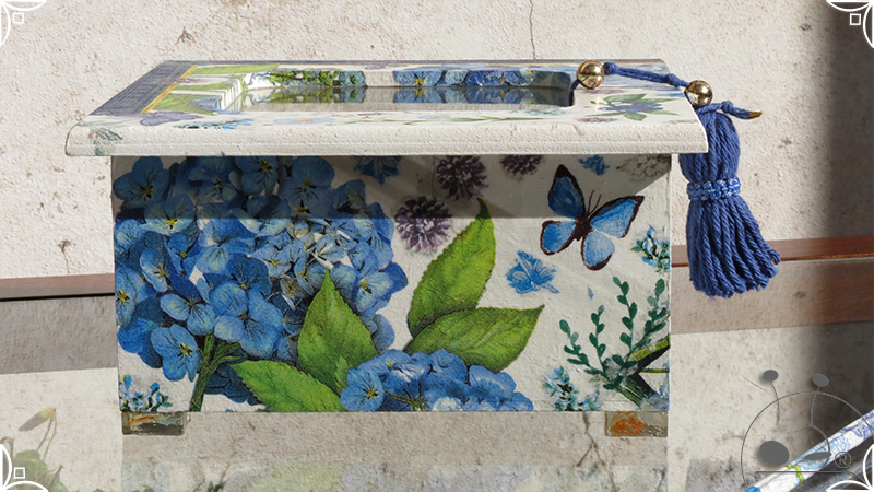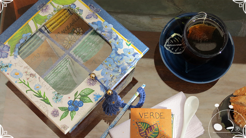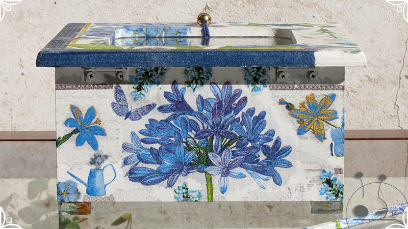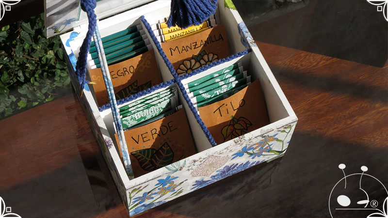 Caja de té de madera con cuatro divisiones intervenida en decoupage, pintura y venecitas de vidrio para el apoyo de la caja sobre superficies. La temática principal a pedido del cliente, fue la abundante presencia del azul y sus variantes. La Caja de té contiene, además, un tirador realizado con borla, mostacillas y una cintura de cordel azul. En el interior presenta terminaciones con cordón de crochet azul y detalles en decoupage. Se complementa con rótulos pintados a mano estilo arte egipcio para organizar el té y una varilla artesanal para sostener la tapa de la caja de té.
