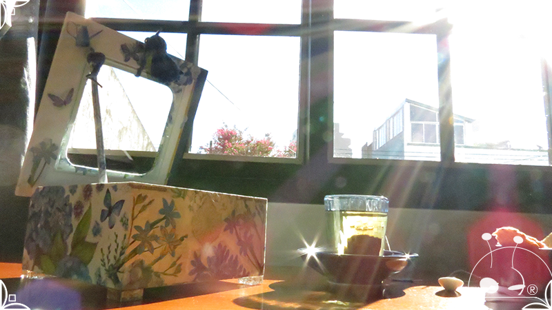 Mesa de té presentada con plato azul primicia de próxima línea de bazar a presentar.