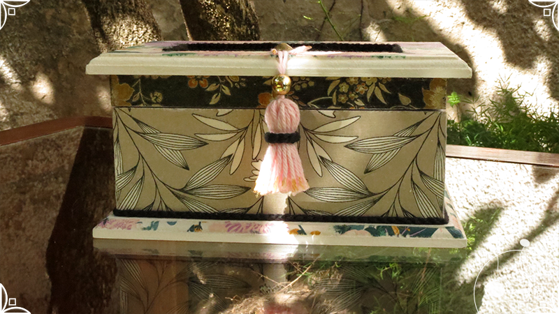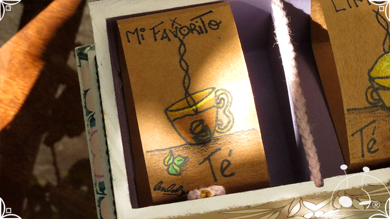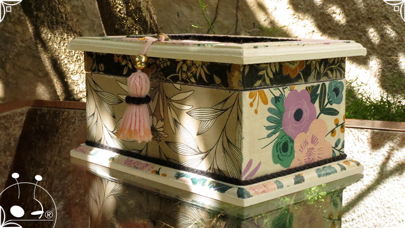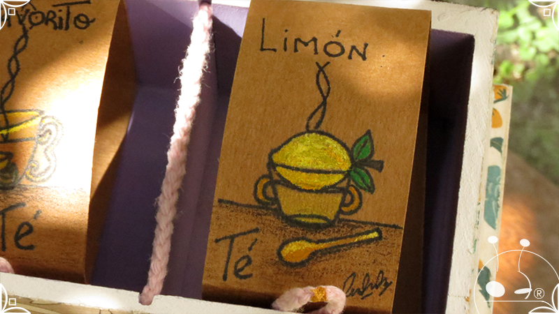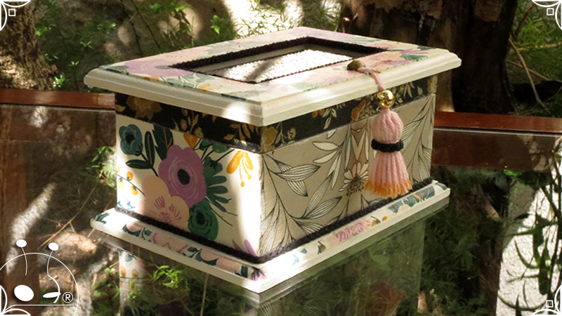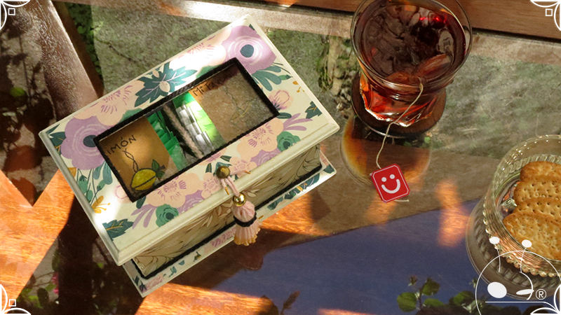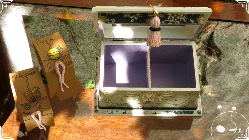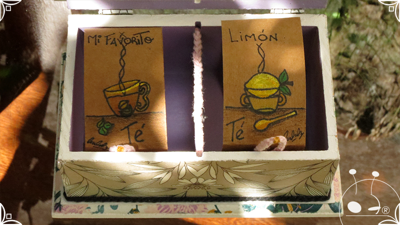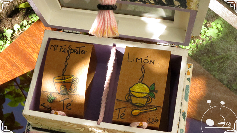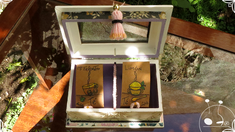 Caja de té de madera moldurada, con cornisas y dos divisiones. Intervenida en decoupage en una temática floral fresca, sobria y elegante, complementada con terminaciones en cordel negro en su exterior. La Caja de té contiene, además, un tirador realizado con borla de hilo rosa pastel y dorado, con cintura de cordel tejido en color negro y una perla dorada. En el interior presenta terminaciones con cordón de crochet rosa pastel y pintura en color lavanda. Se complementa con 2 rótulos Precinto pintados a mano para organizar el té, en los cuales se representa vasijas sencillas de cristal.