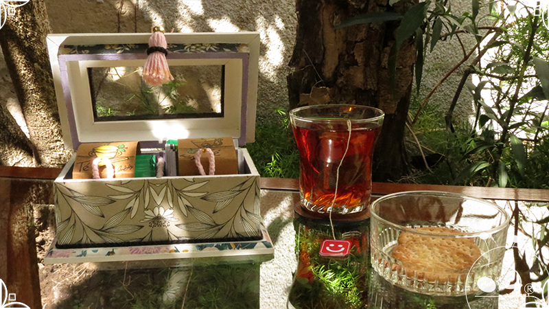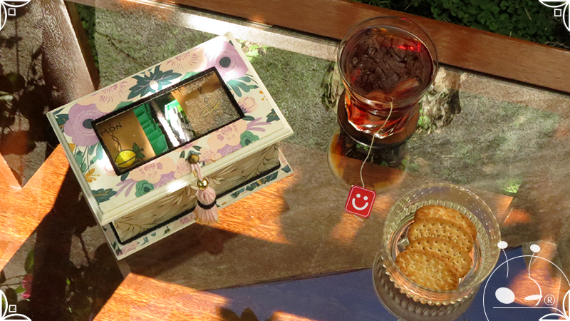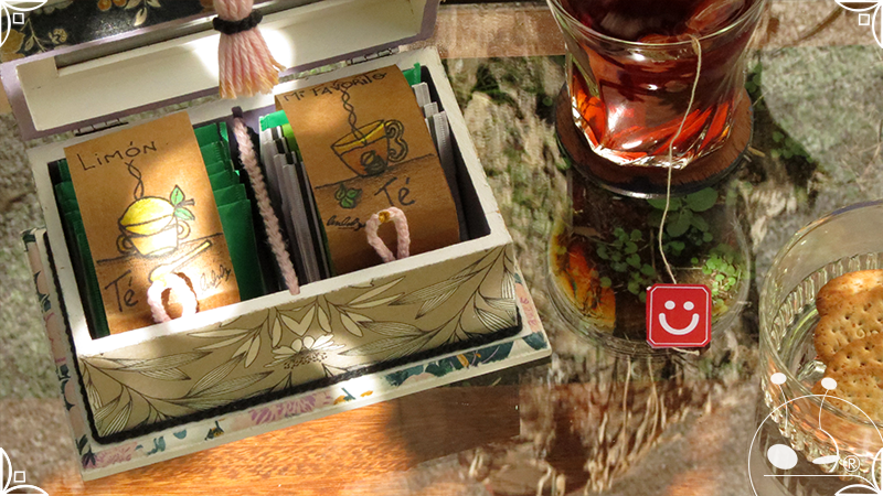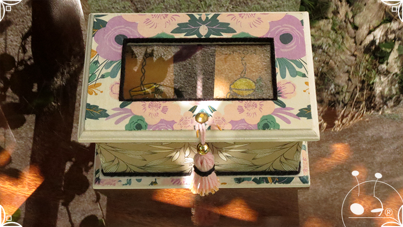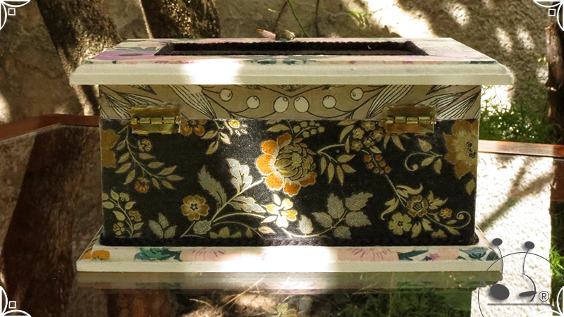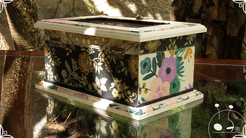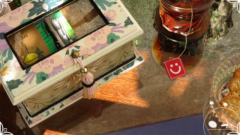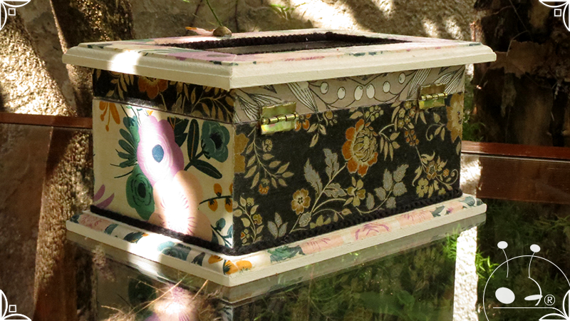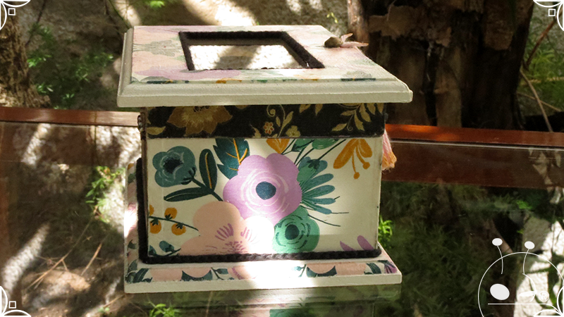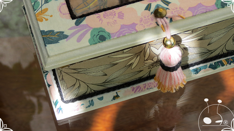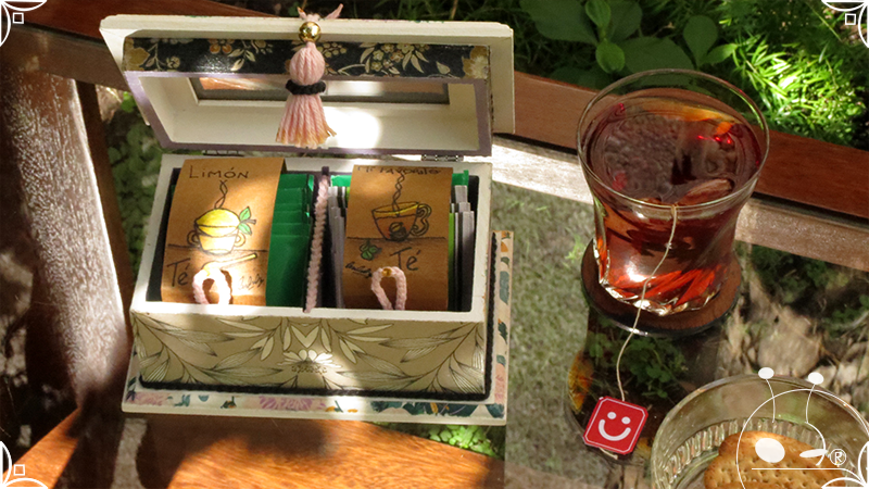 Caja de té de madera moldurada, con cornisas y dos divisiones. Intervenida en decoupage en una temática floral fresca, sobria y elegante, complementada con terminaciones en cordel negro en su exterior. La Caja de té contiene, además, un tirador realizado con borla de hilo rosa pastel y dorado, con cintura de cordel tejido en color negro y una perla dorada. En el interior presenta terminaciones con cordón de crochet rosa pastel y pintura en color lavanda. Se complementa con 2 rótulos Precinto pintados a mano para organizar el té, en los cuales se representa vasijas sencillas de cristal.