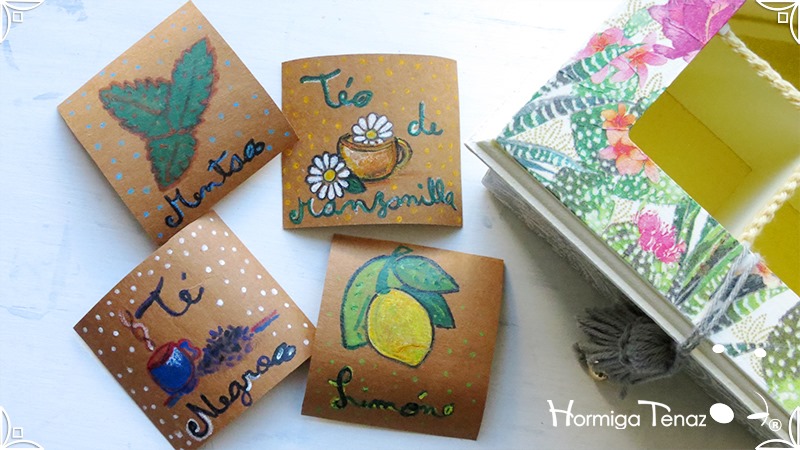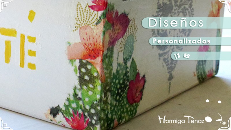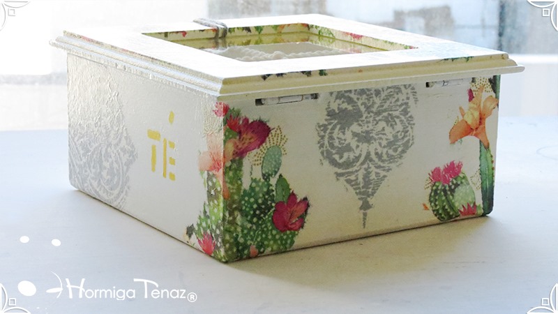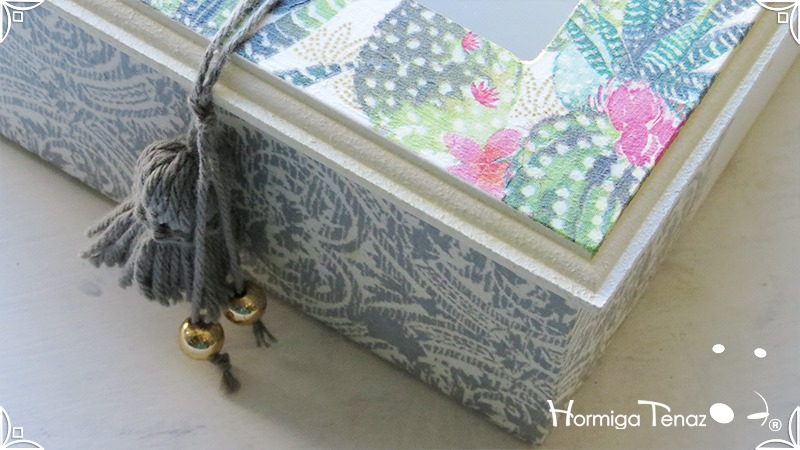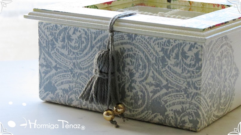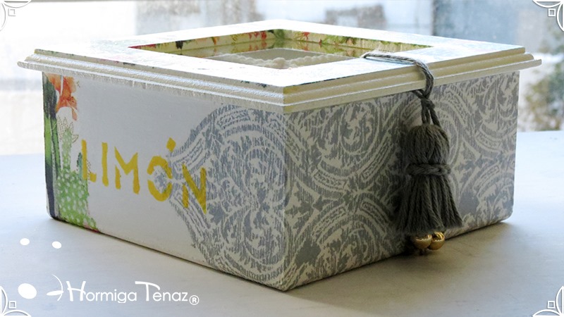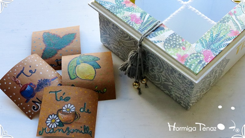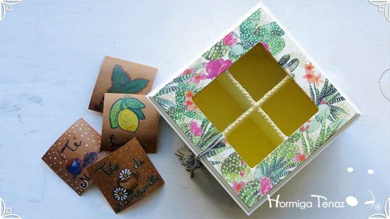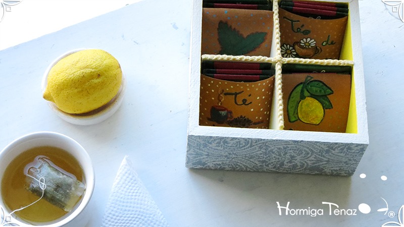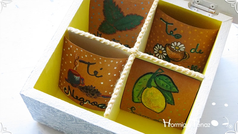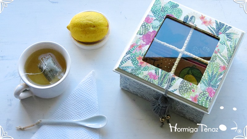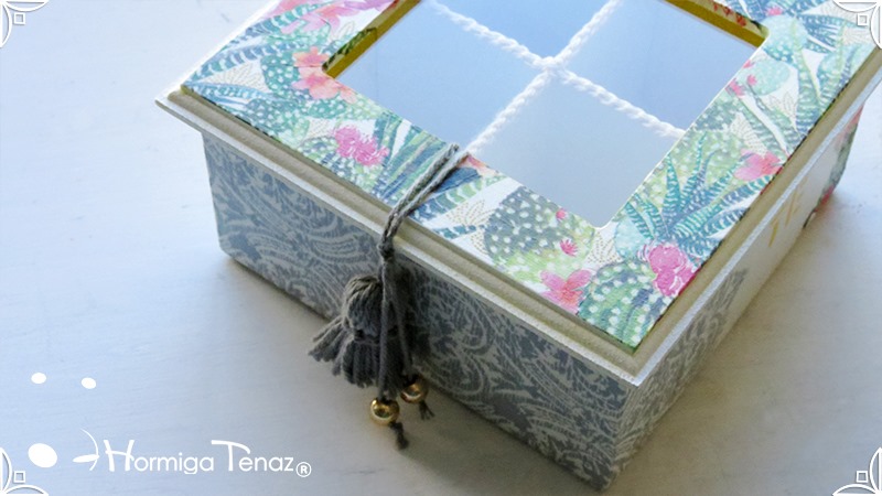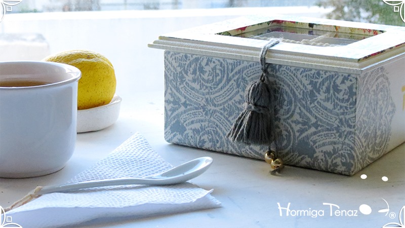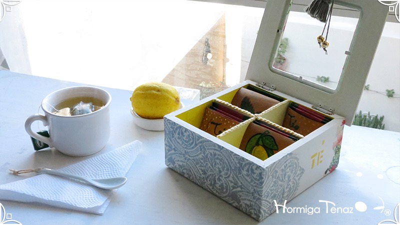 Elegante y fresca caja de té de madera con cuatro divisiones revestidas con cordón crochet, con tapa de vidrio, e intervenida en decoupage y pintura. Se le agregó además, un detalle de borla con mostacillas doradas que cumple la función de tirador y cuatro rótulos pintados a mano para organizar el té.