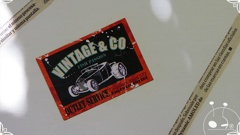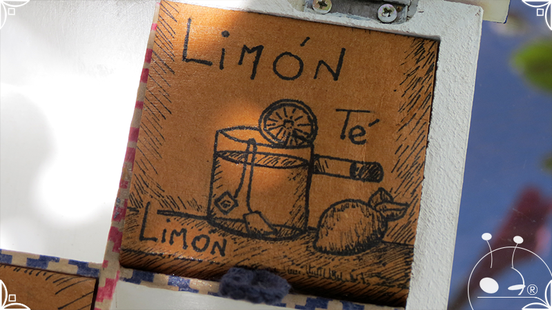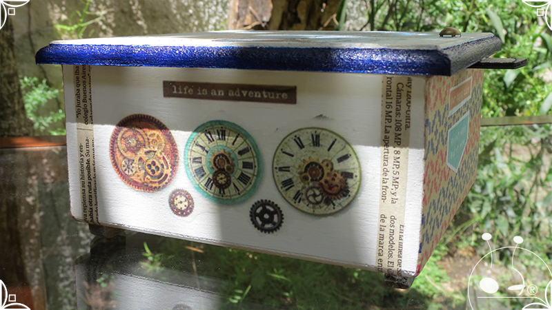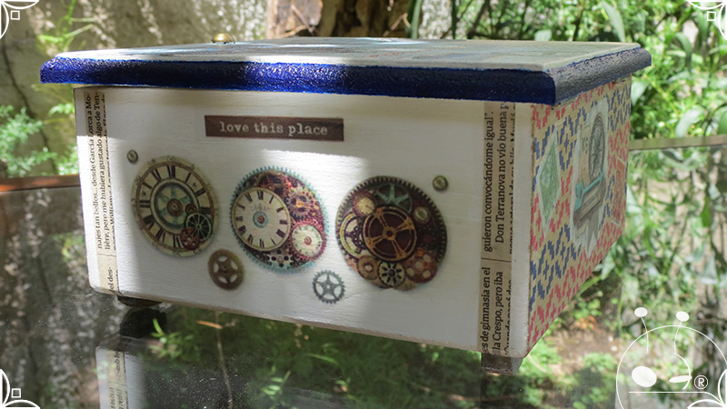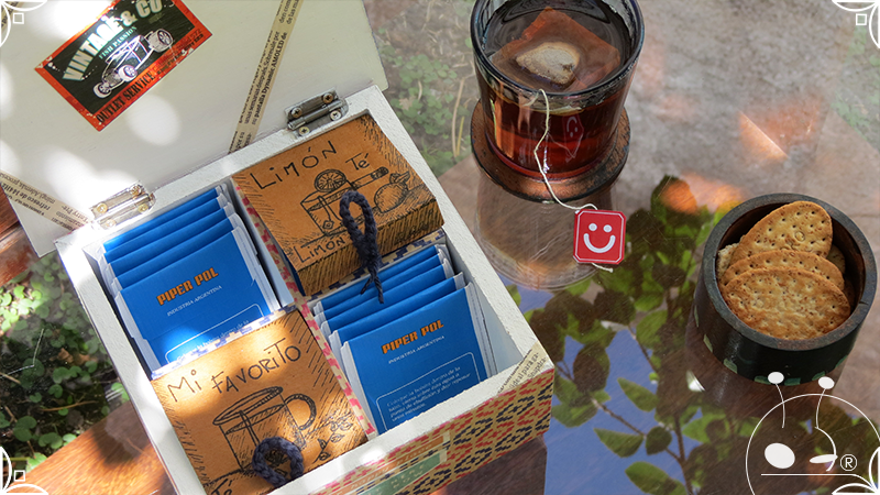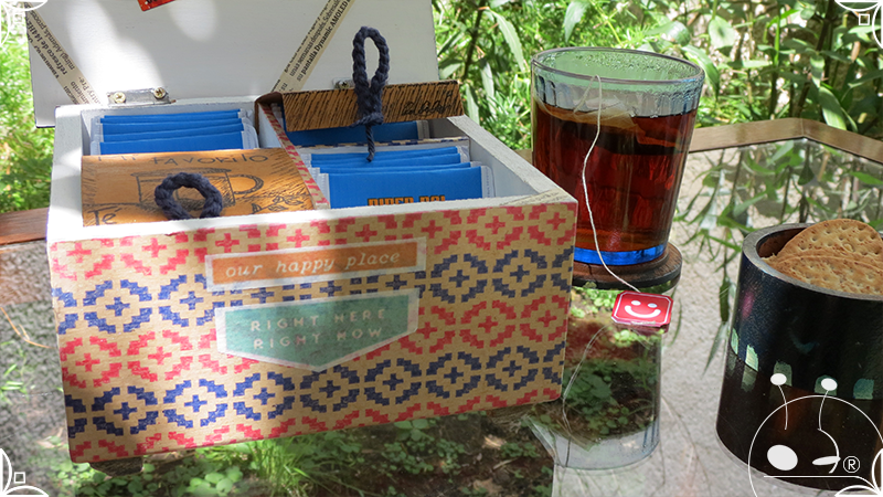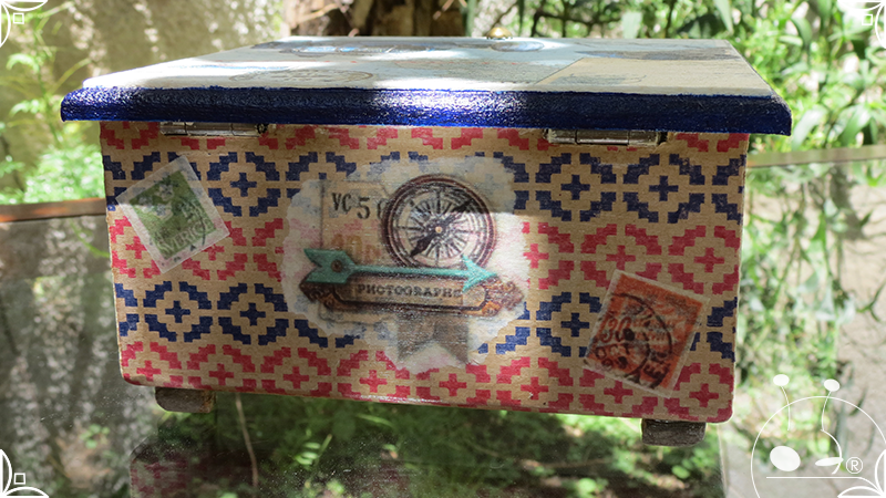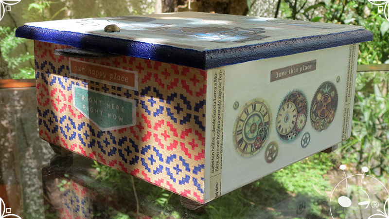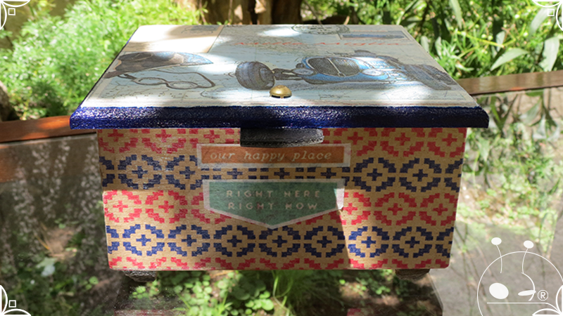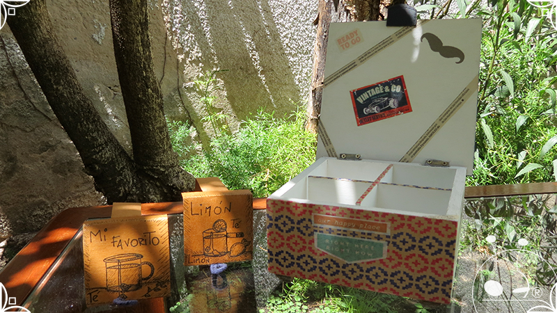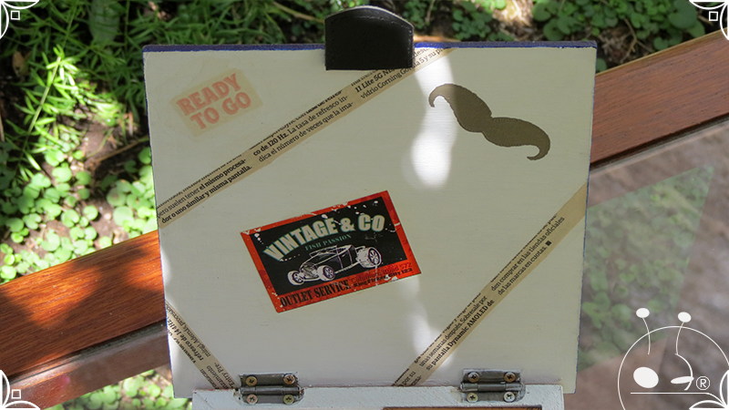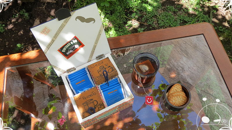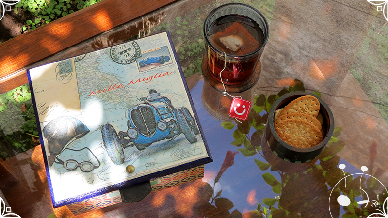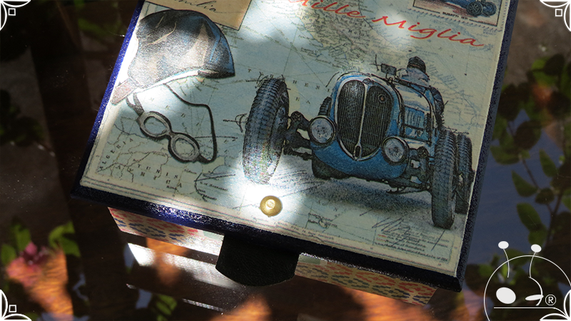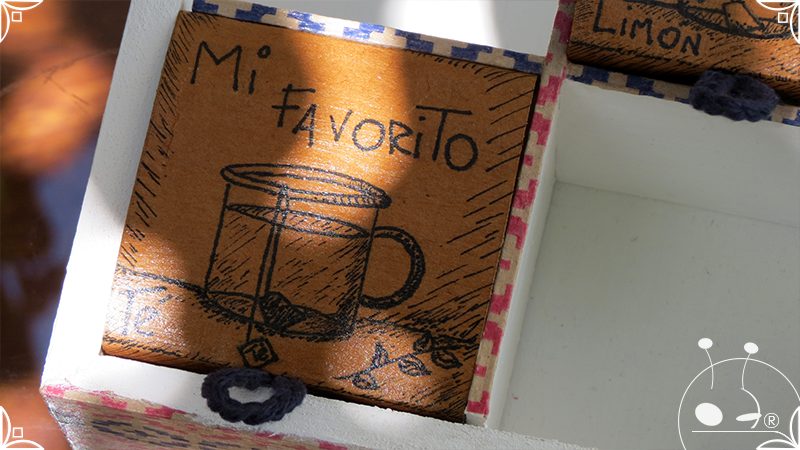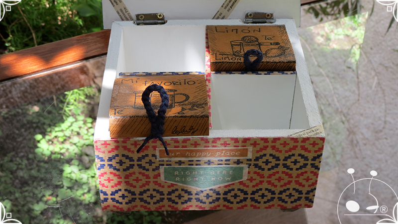 Caja de té de madera con cuatro divisiones intervenida en decoupage y pintura, con pies de madera para el apoyo de la caja sobre superficies. La temática de Ruta o Viajero Vintage expresa predominantemente colores azules, marrones, y alguna presencia de cálidos para la construcción de un diseño masculino con elementos de autos, rutas, relojes, una brújula, frases y texto. La Caja de té contiene, además, una tacha dorada vintage en la tapa con una lengüeta de cuero negro para el abrir y el cerrar de la misma, mientras que en el interior presenta terminaciones y detalles también en decoupage, etiquetas y un sello de estilo vintage. Se complementa con 2 rótulos Tapa pintados a mano en estilo Grabado con cordones tejidos para organizar el té.