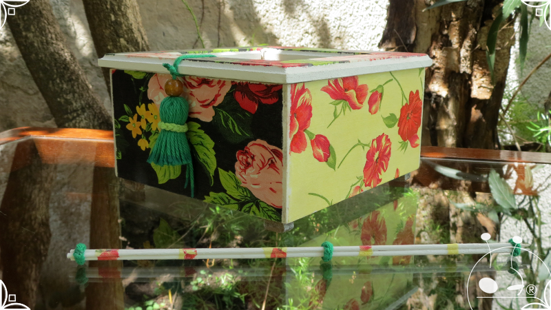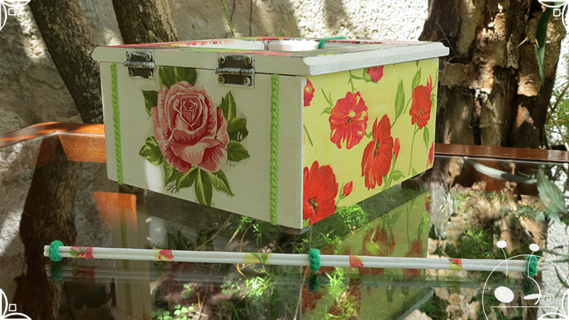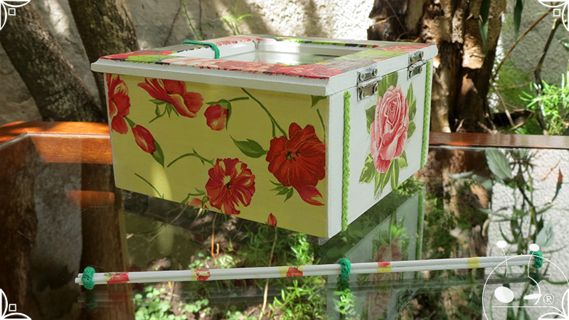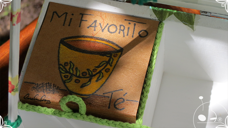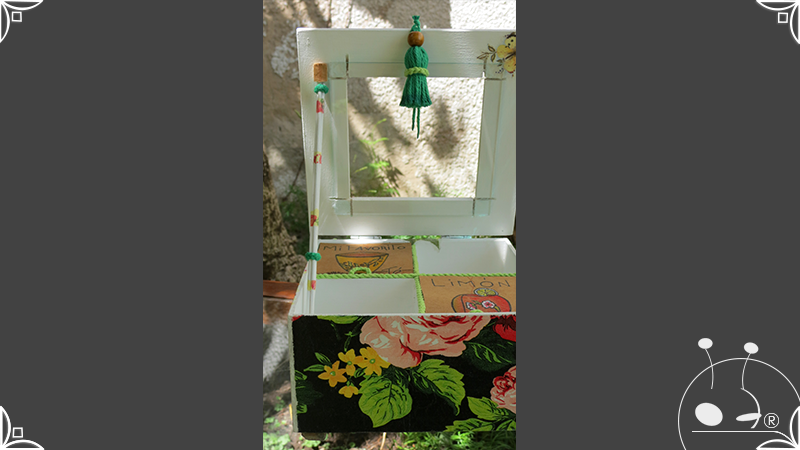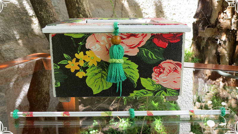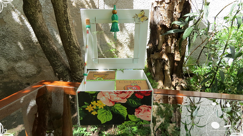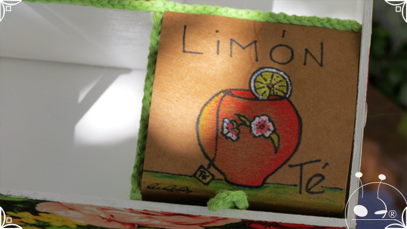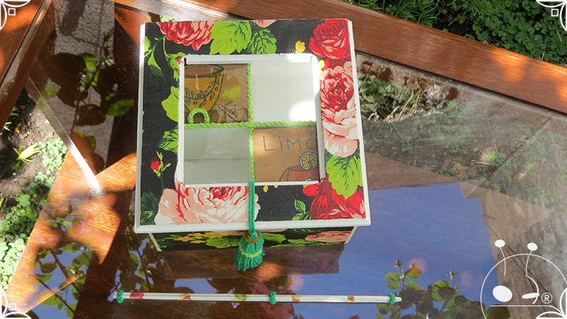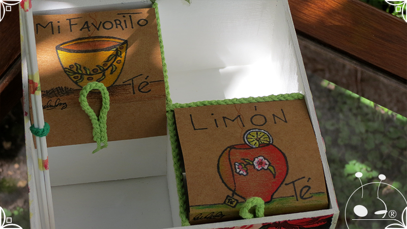 Caja de té de madera con cuatro divisiones intervenida en decoupage, con pies de madera para el apoyo de la caja sobre superficies. La temática floral muestra una influencia del arte y textiles oriental. La Caja de té contiene, además, un tirador realizado con borla de hilo verde menta, con cintura de cordel tejido en color verde manzana y una perla de madera. En el interior presenta terminaciones con cordón de crochet verde menta y detalles en decoupage. Se complementa con 2 rótulos Tapa pintados a mano para organizar el té, en los cuales se representa vasija oriental en continuidad con la temática. Por último, contiene una varilla artesanal para sostener la tapa de la caja intervenida en decoupage, con detalles en cordones verde menta y con su tope de madera.