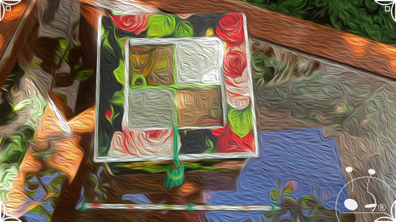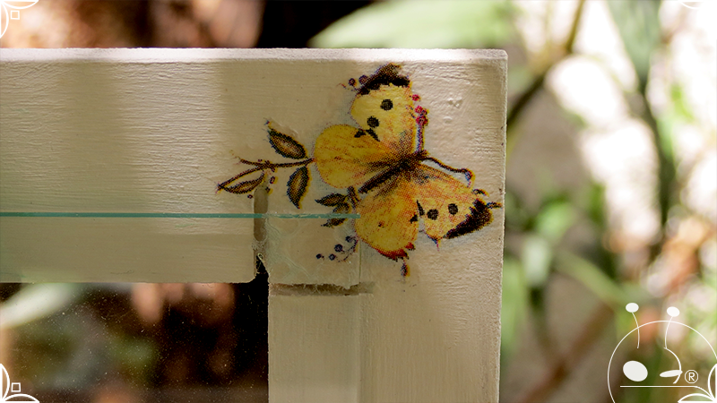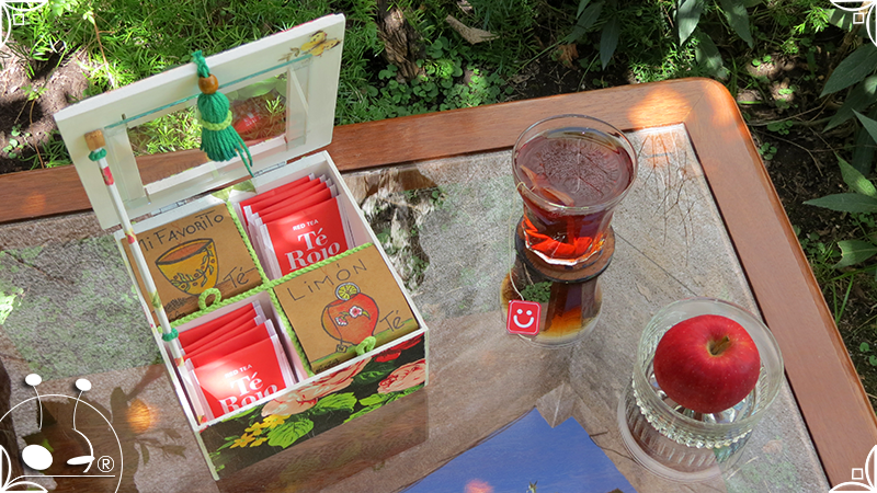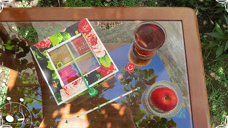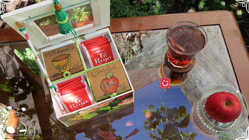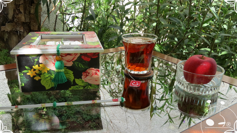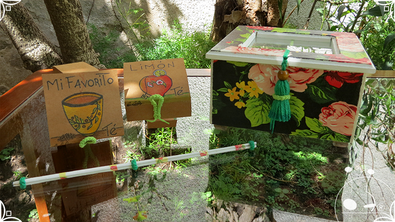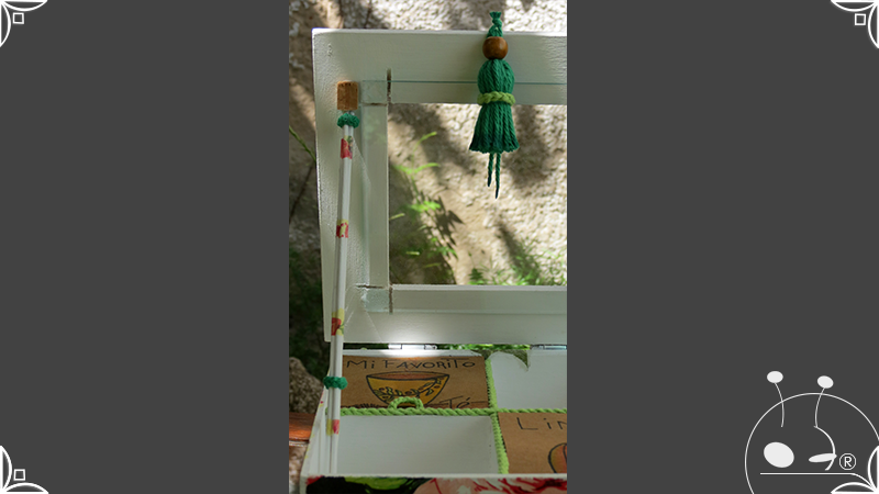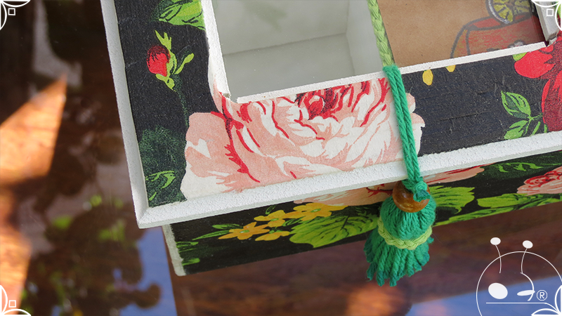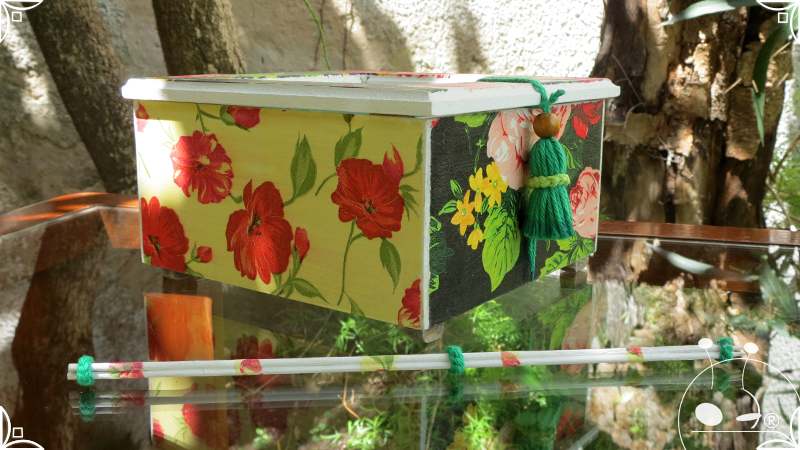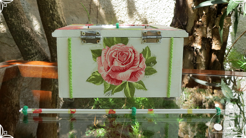Caja de té de madera con cuatro divisiones intervenida en decoupage, con pies de madera para el apoyo de la caja sobre superficies. La temática floral muestra una influencia del arte y textiles oriental. La Caja de té contiene, además, un tirador realizado con borla de hilo verde menta, con cintura de cordel tejido en color verde manzana y una perla de madera. En el interior presenta terminaciones con cordón de crochet verde menta y detalles en decoupage. Se complementa con 2 rótulos Tapa pintados a mano para organizar el té, en los cuales se representa vasija oriental en continuidad con la temática. Por último, contiene una varilla artesanal para sostener la tapa de la caja intervenida en decoupage, con detalles en cordones verde menta y con su tope de madera.