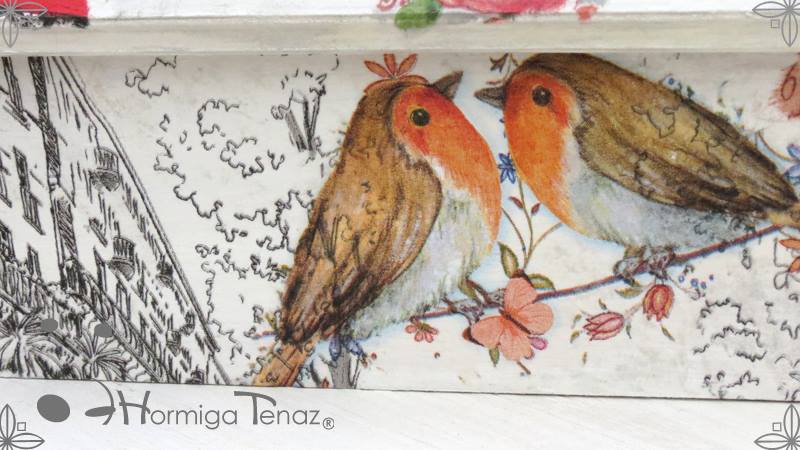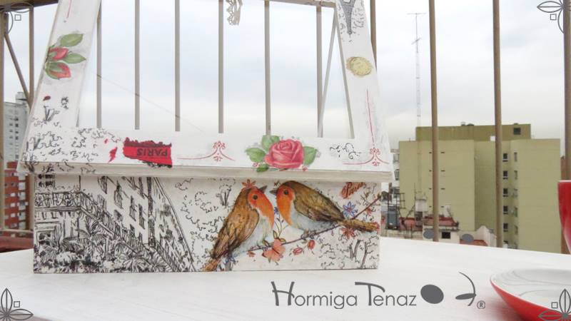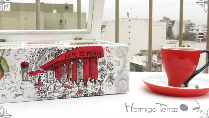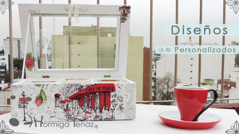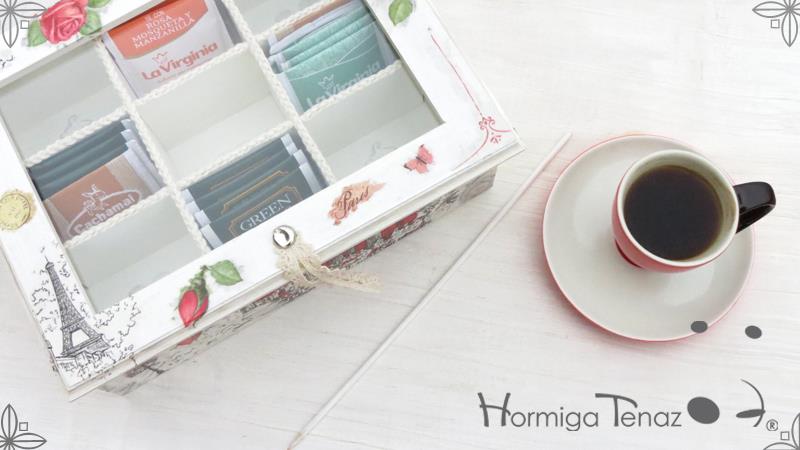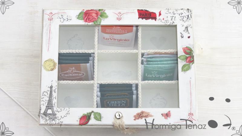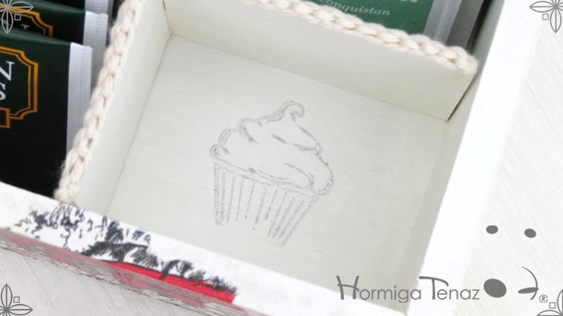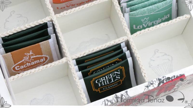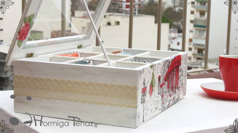 Caja de madera para té con nueve divisiones revestida con cordón de crochet e intervenida en decoupage, pintura y lazo de encaje. Más el detalle funcional de un tirador realizado con tacha y puntilla.