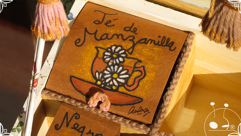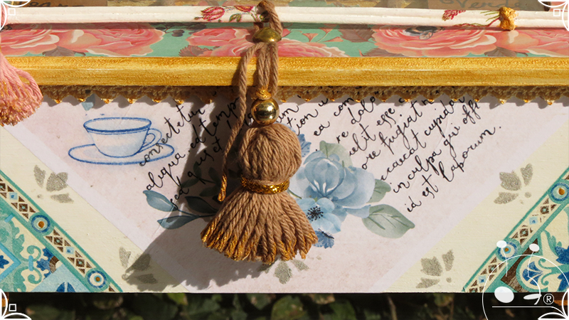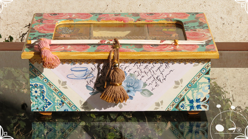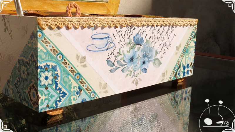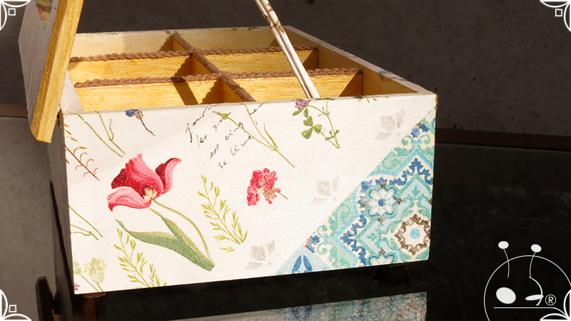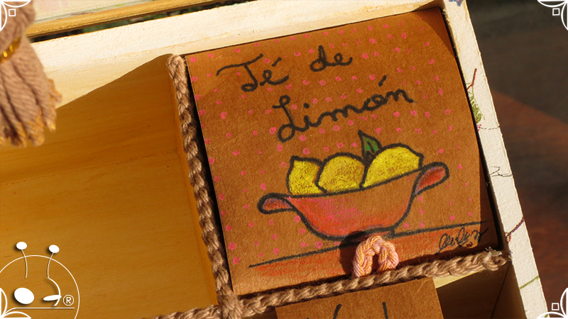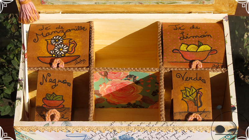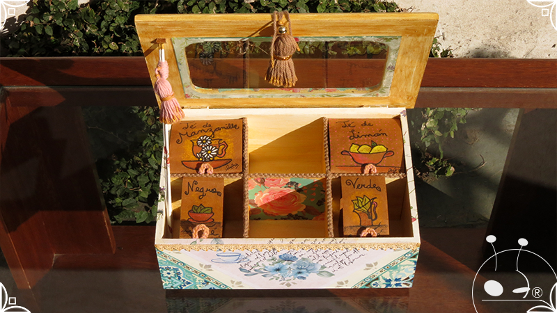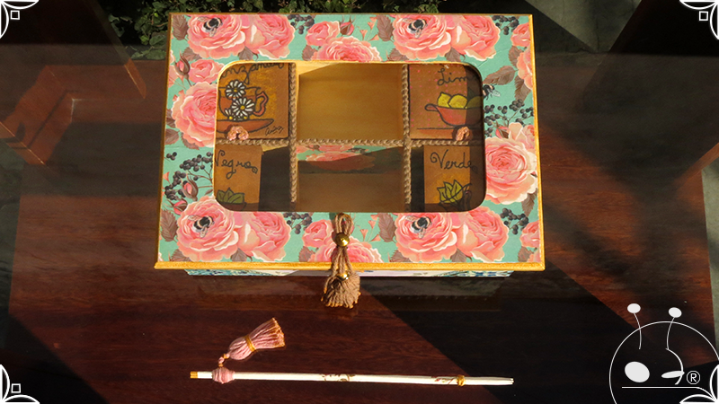 Caja de té de madera con seis divisiones intervenida en decoupage y pintura, con pies de madera para el apoyo de la caja sobre superficies. La temática expresa colores característicos del Rococó, en un conjunto de motivos de jardín, porcelana antigua, guardas, y puntilla natural con perlitas doradas. La Caja de té contiene, además, un tirador realizado con borla de hilo marrón, con una perla dorada, cintura de cordel dorado y una tacha dorada vintage. En el interior presenta terminaciones con cordón de crochet marrón, detalles en decoupage y pintura dorada. Se complementa con 4 rótulos de Precinto y Tapa pintados a mano para organizar el té. Por último, contiene una varilla artesanal para sostener la tapa de la caja, con una borla en rosa y dorado como detalle y con su tope de madera.