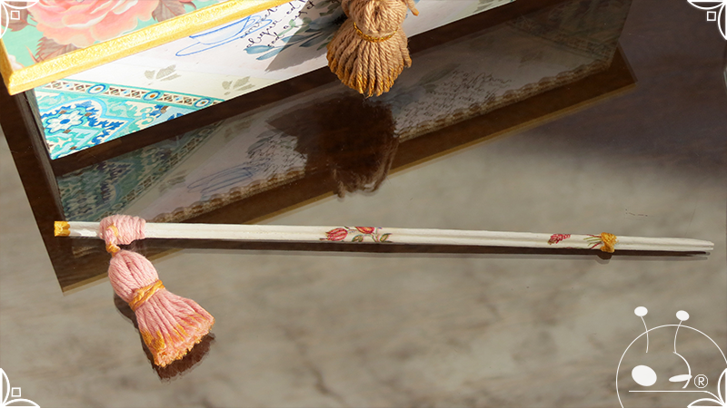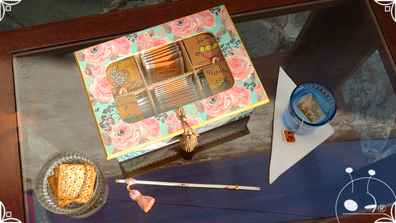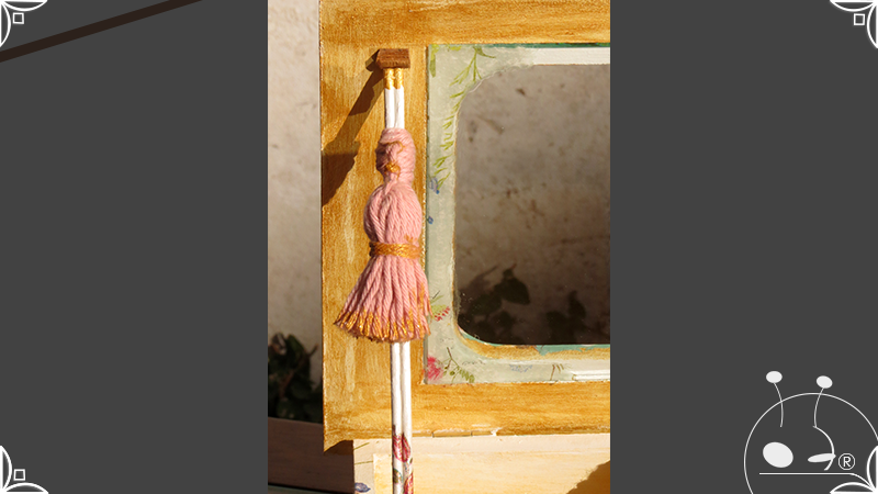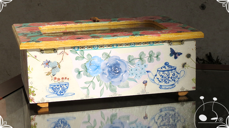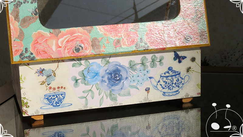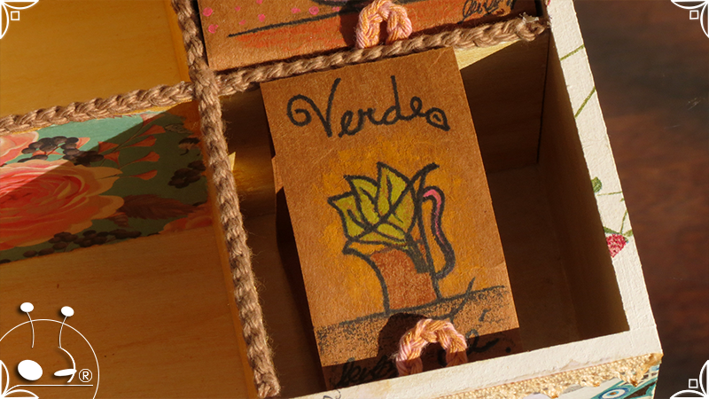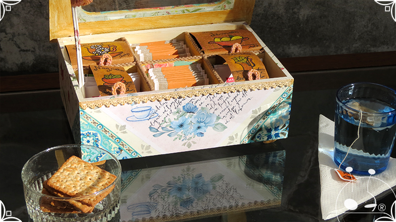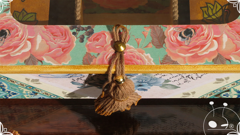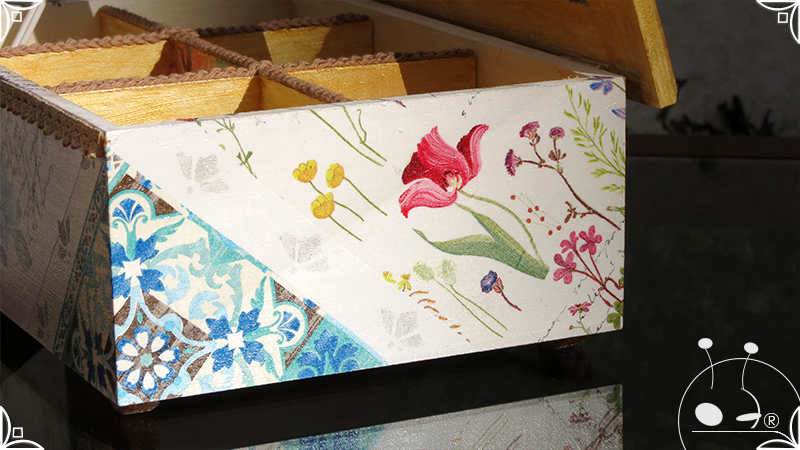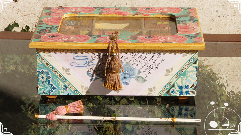Caja de té de madera con seis divisiones intervenida en decoupage y pintura, con pies de madera para el apoyo de la caja sobre superficies. La temática expresa colores característicos del Rococó, en un conjunto de motivos de jardín, porcelana antigua, guardas, y puntilla natural con perlitas doradas. La Caja de té contiene, además, un tirador realizado con borla de hilo marrón, con una perla dorada, cintura de cordel dorado y una tacha dorada vintage. En el interior presenta terminaciones con cordón de crochet marrón, detalles en decoupage y pintura dorada. Se complementa con 4 rótulos de Precinto y Tapa pintados a mano para organizar el té. Por último, contiene una varilla artesanal para sostener la tapa de la caja, con una borla en rosa y dorado como detalle y con su tope de madera.