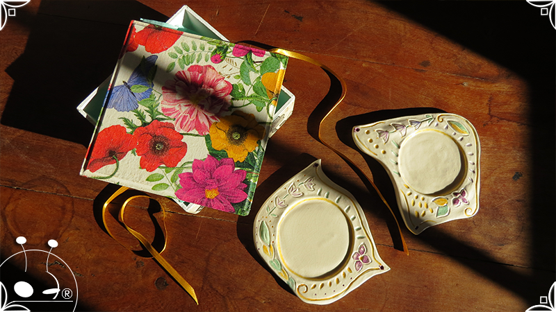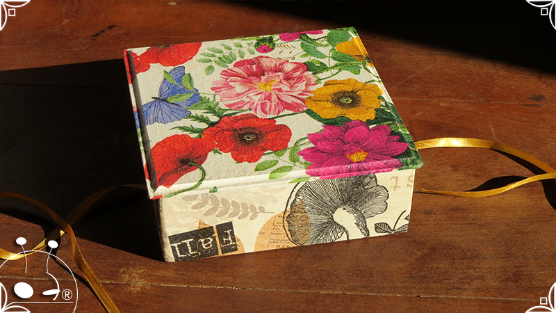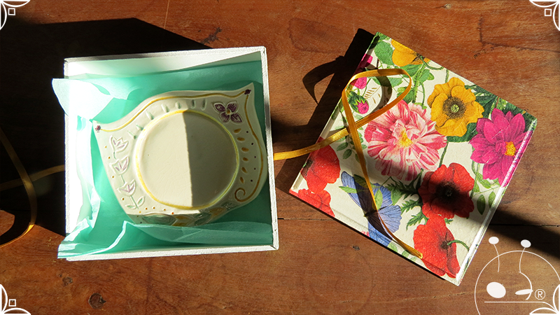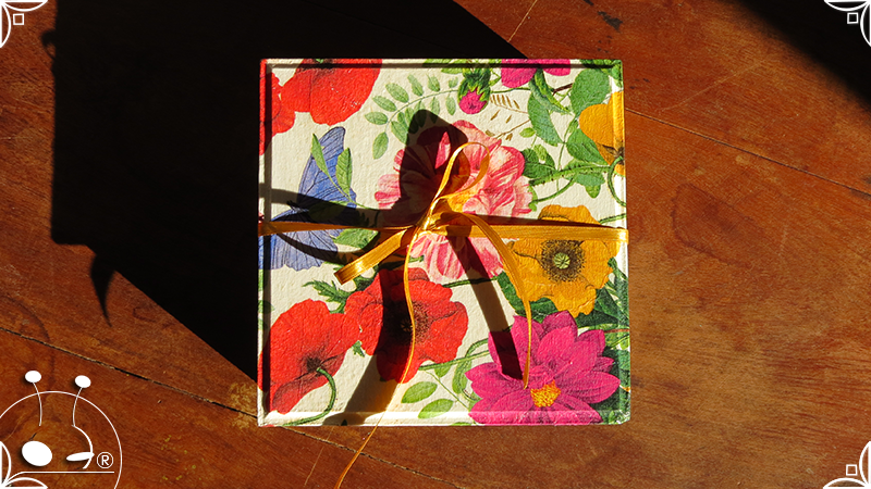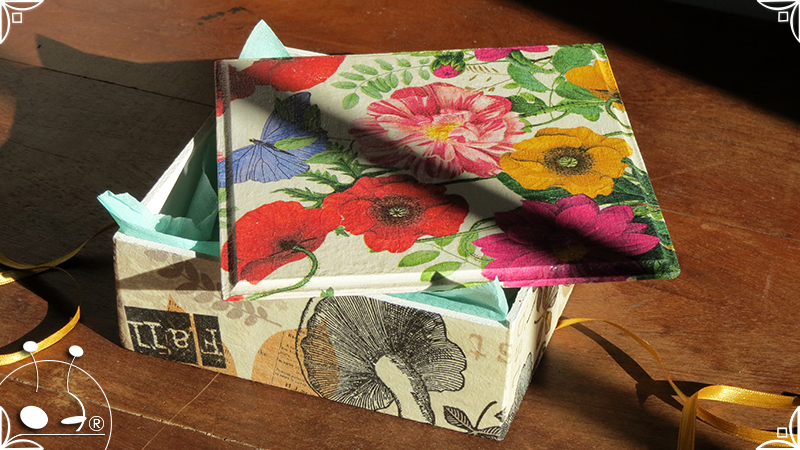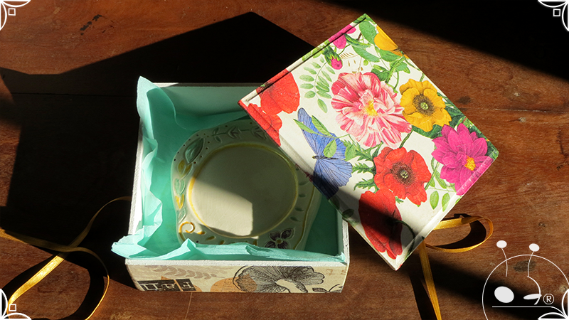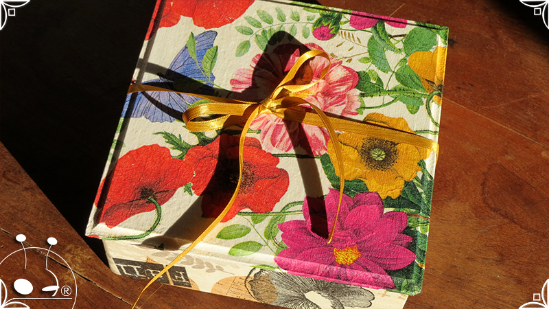 Caja de madera contenedora con tapa, intervenida en un decoupage floral refrescante y cinta de raso cúrcuma, preparada para el guardado de los Posavasos Ferolete.