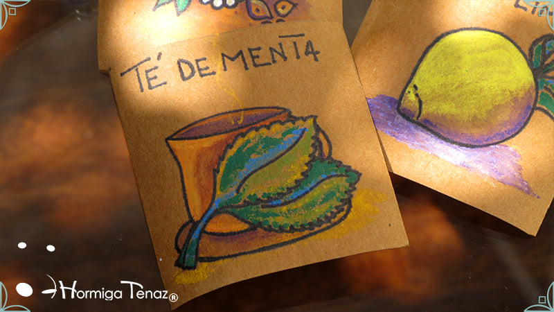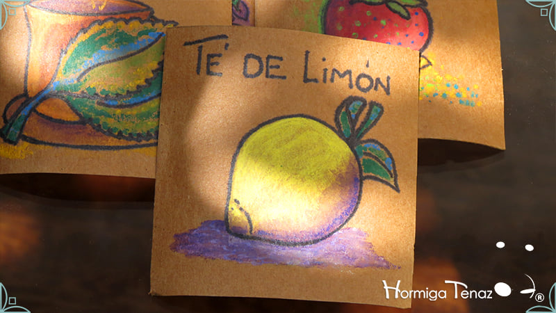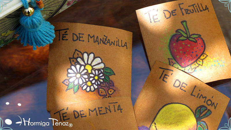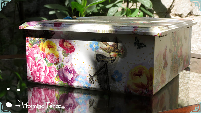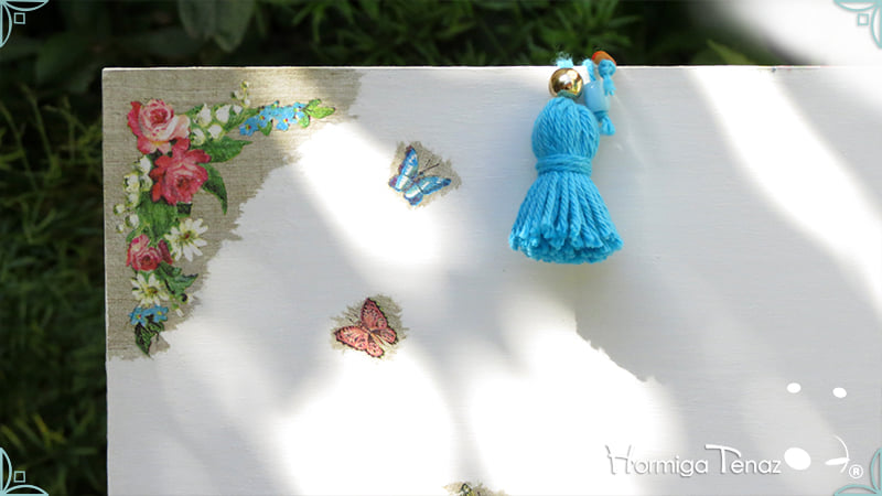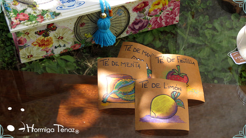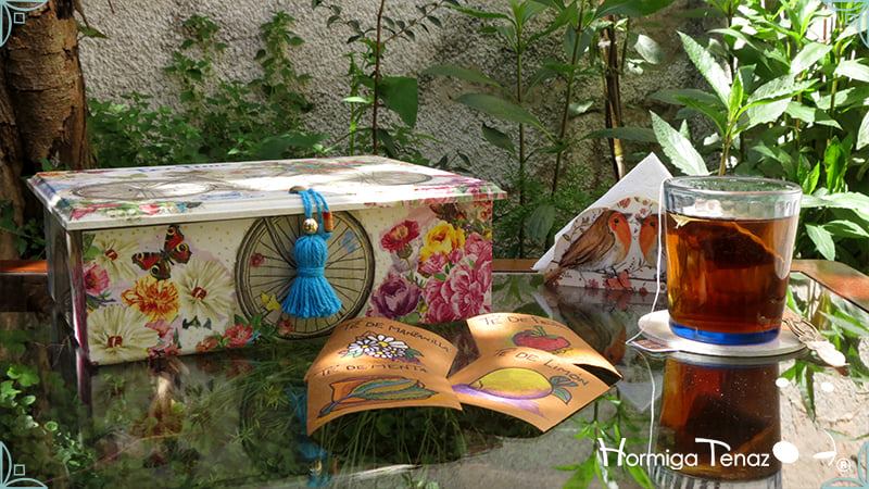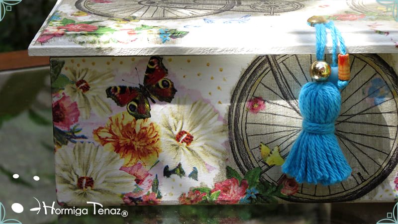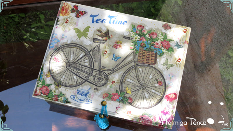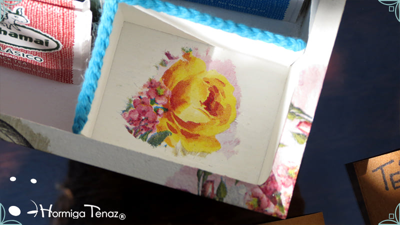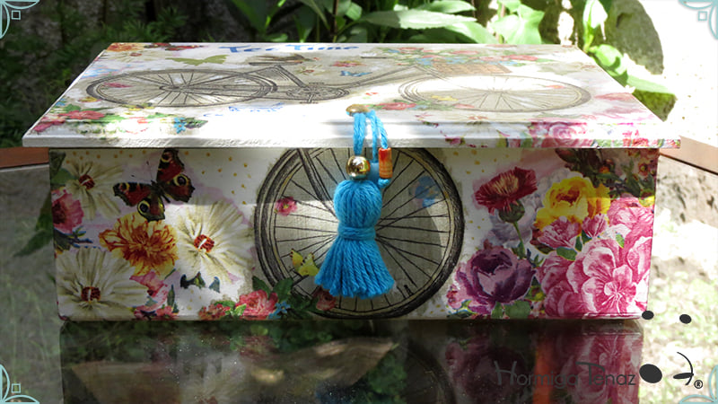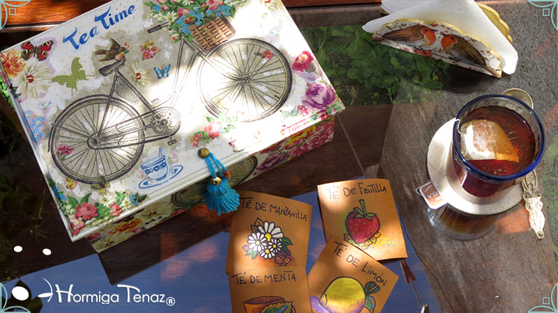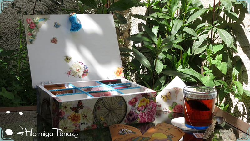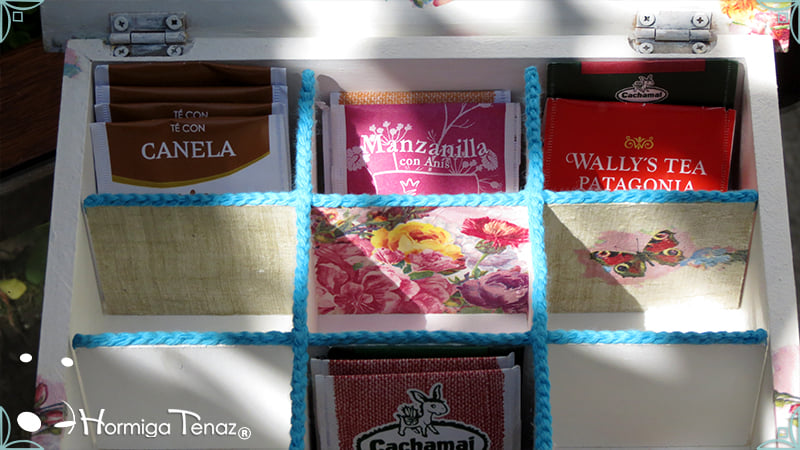Caja de té de madera con nueve divisiones intervenida en decoupage y pintura, con un tirador realizado con tacha, borla y mostacillas y en el interior terminaciones con cordón de crochet. Rótulos estilo Fauvismo pintados a mano para organizar el té.