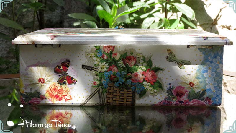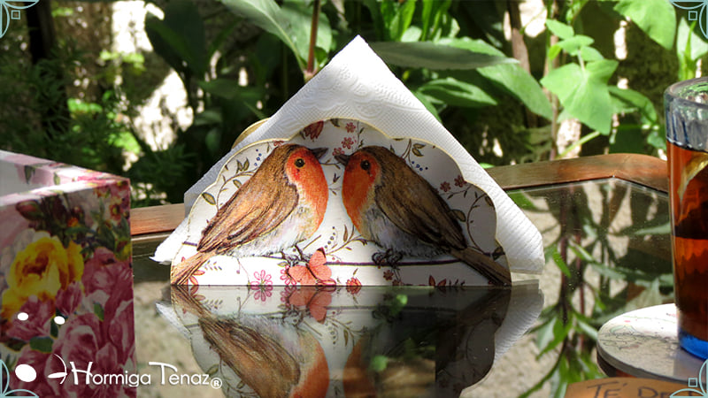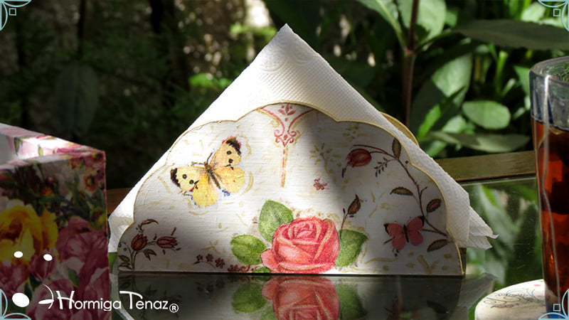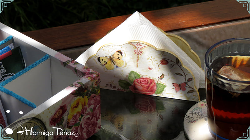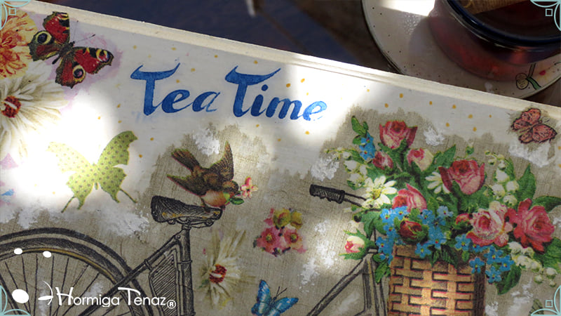 Mesa de té presentada con servilletero Abanico, intervenido también en decoupage ◌*꙳