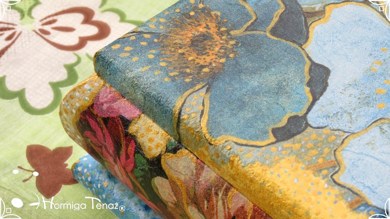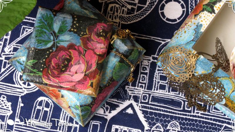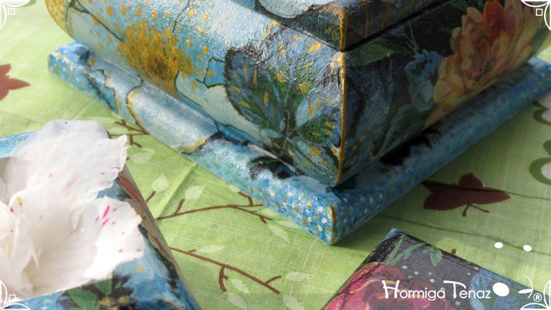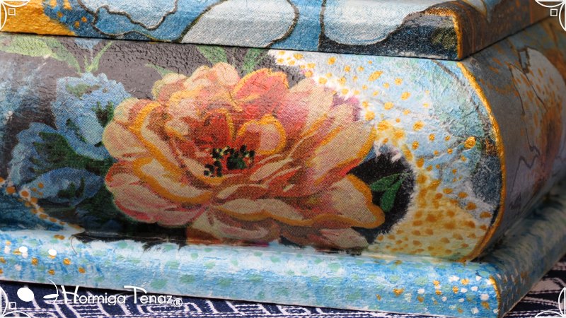 Dos cajas bombé decoradas con la fusión de dos técnicas, decoupage y pintura. Terminadas con barniz satinado para su preservación. Medidas: Caja pequeña 8,5 x 8,5 cm / Caja grande 12 x 12 cm.