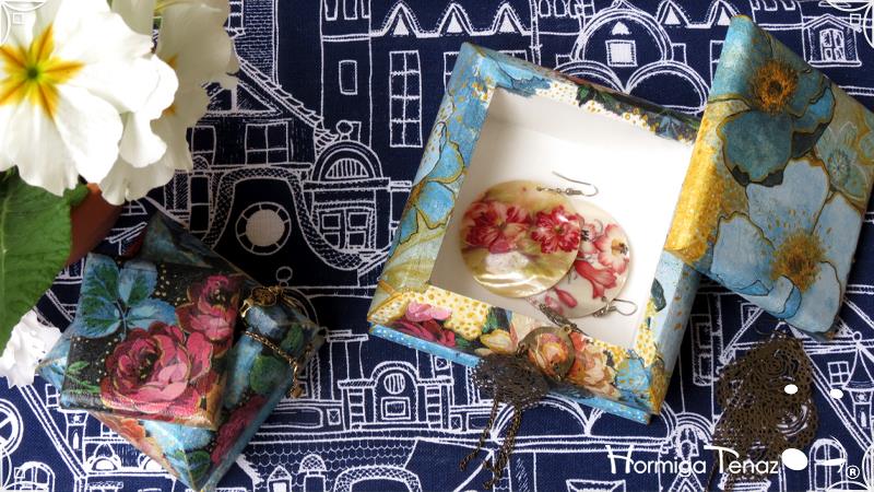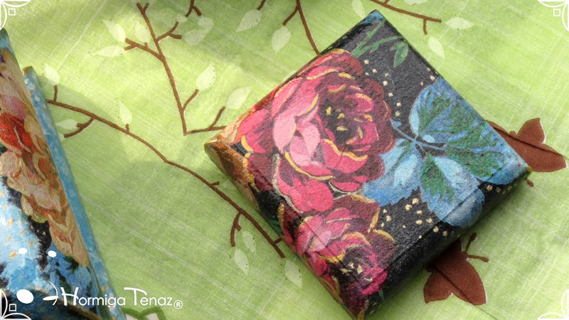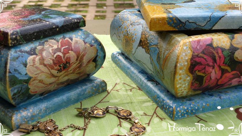 Dos cajas bombé decoradas con la fusión de dos técnicas, decoupage y pintura. Terminadas con barniz satinado para su preservación.