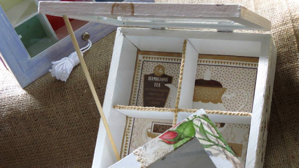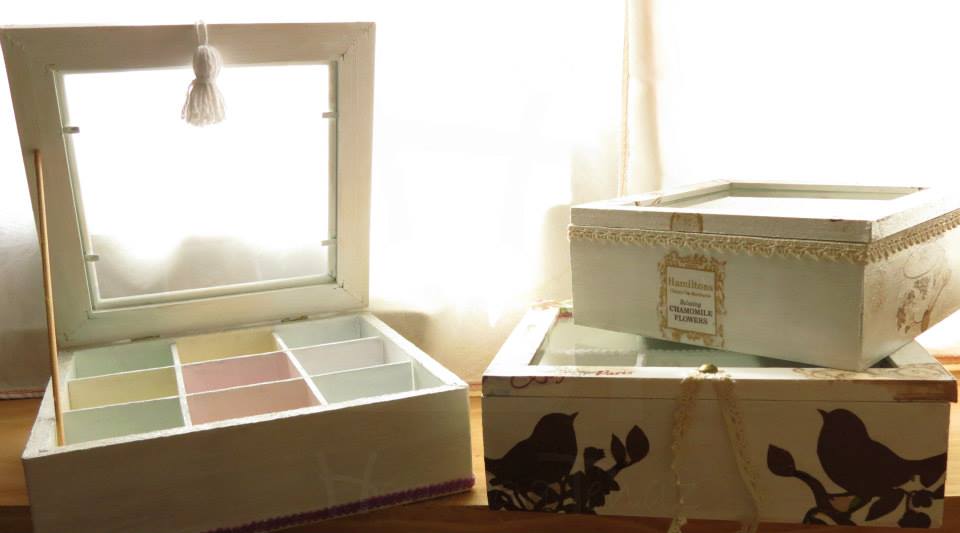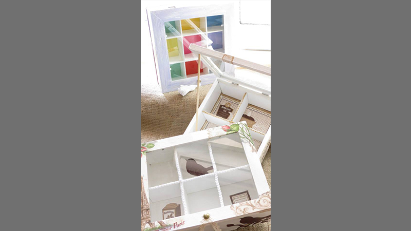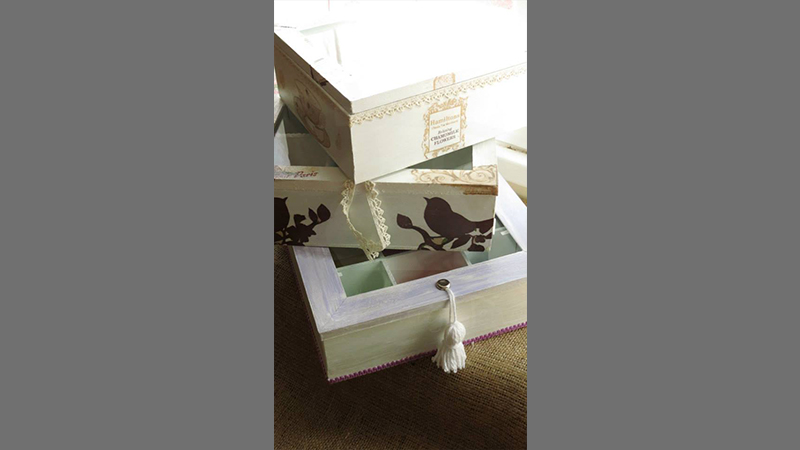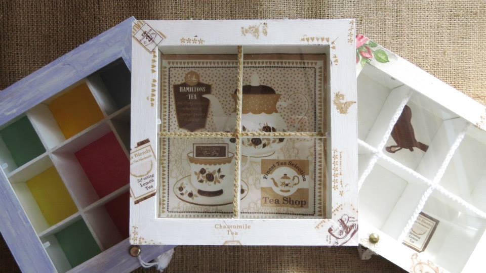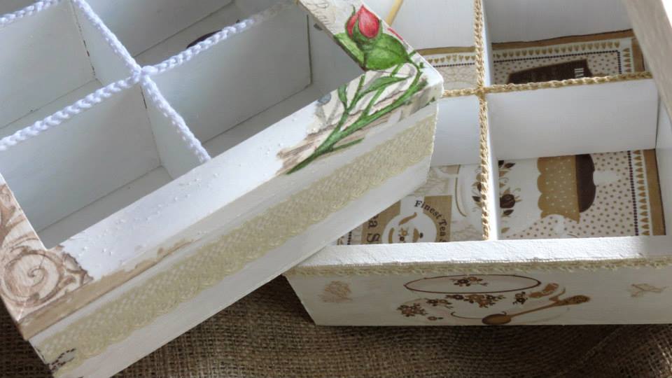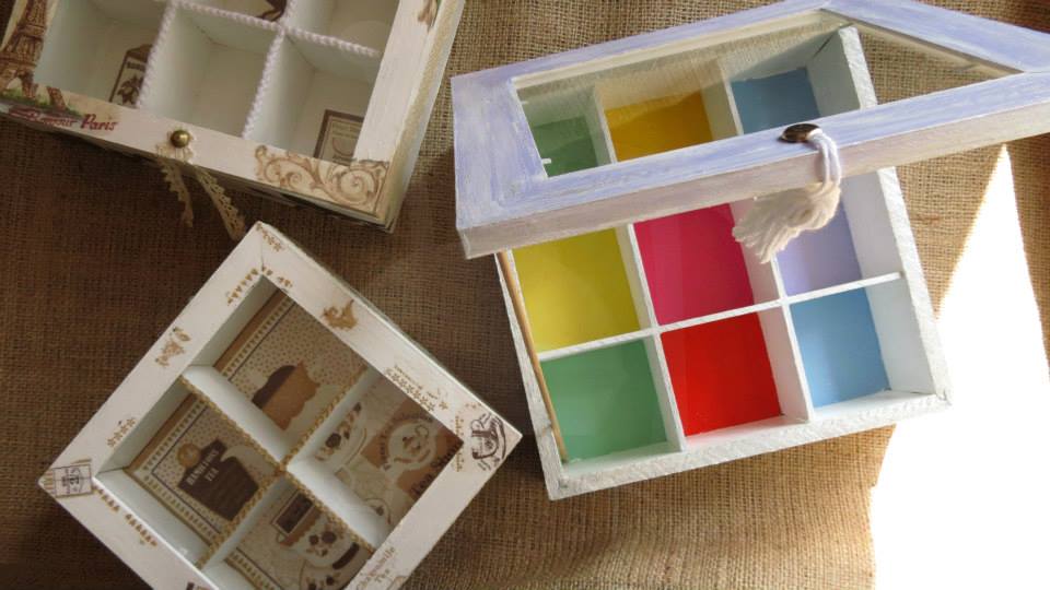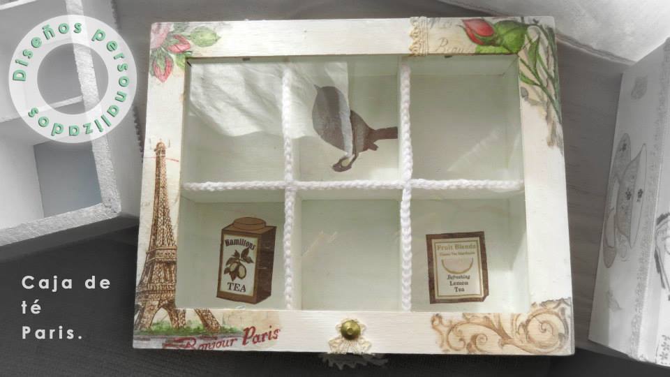 Tres cajas de té, Victoria de 4 divisiones, París de 6 divisiones y Paleta De Color de 9 divisiones, todas intervenidas en decoupage. Dos de ellas, París y Paleta De Color, fueron realizadas con tiradores en la tapa combinados con tachas, puntilla y borla de hilo. Además las tres cajas fueron decoradas con detalles de puntilla, lazos de encaje y cordones de crochet en el interior.