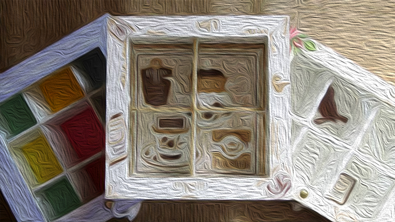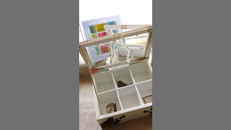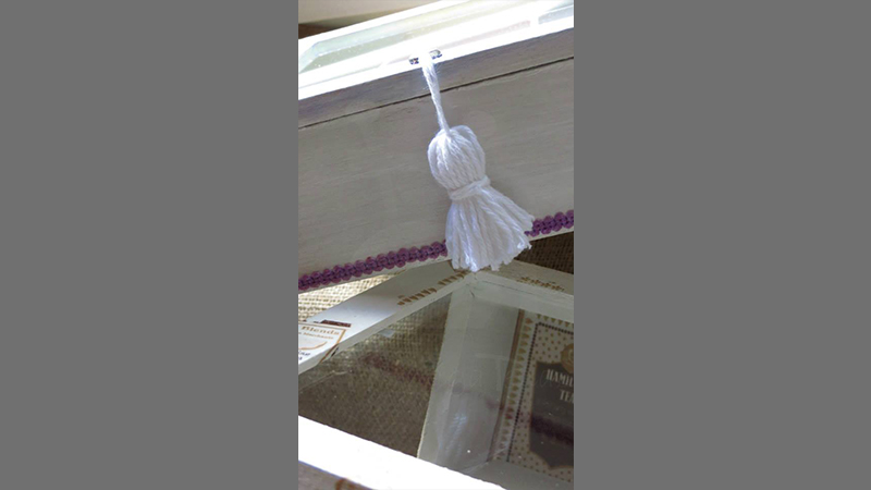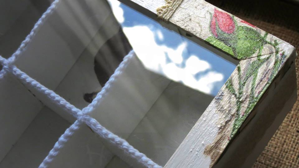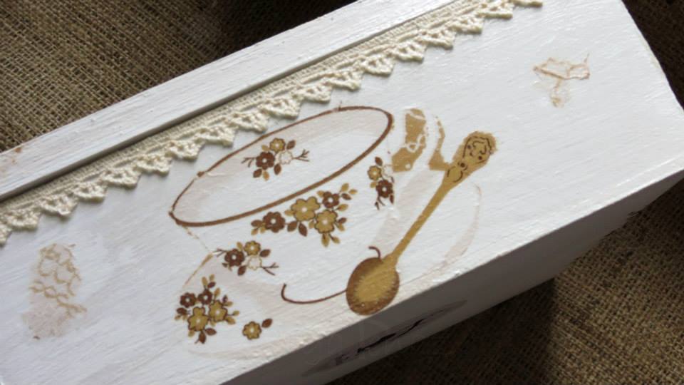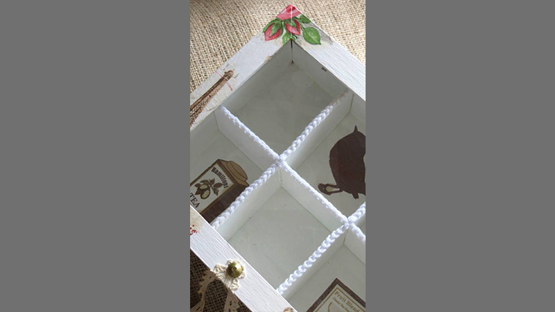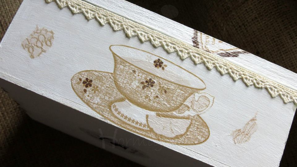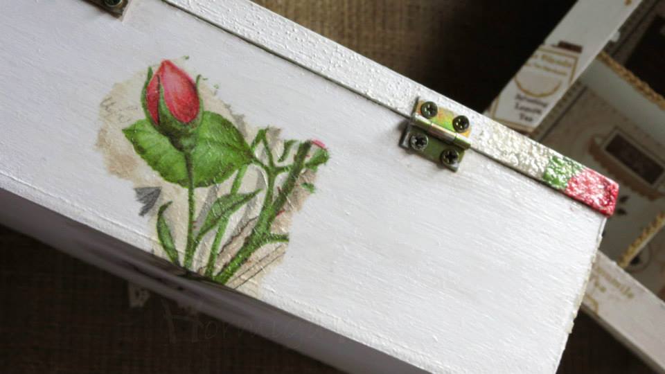 Tres cajas de té, Victoria de 4 divisiones, París de 6 divisiones y Paleta De Color de 9 divisiones, todas intervenidas en decoupage. Dos de ellas, París y Paleta De Color, fueron realizadas con tiradores en la tapa combinados con tachas, puntilla y borla de hilo. Además las tres cajas fueron decoradas con detalles de puntilla, lazos de encaje y cordones de crochet en el interior.