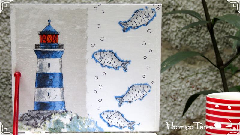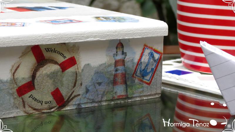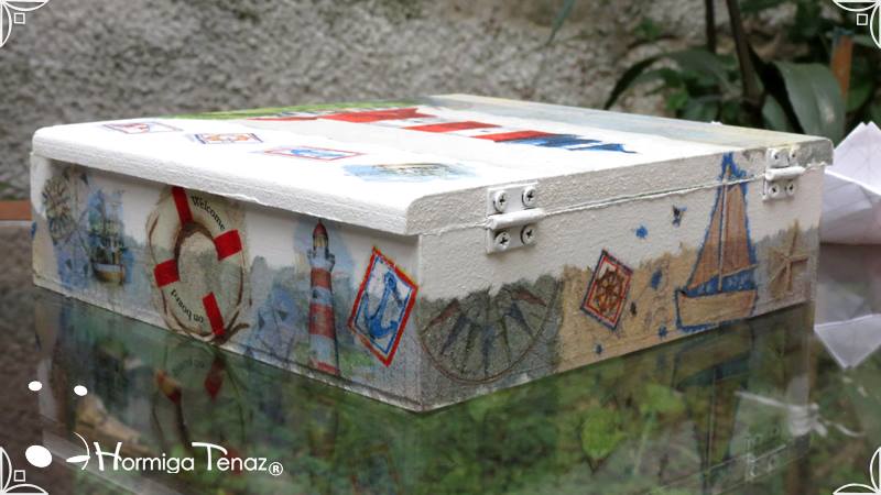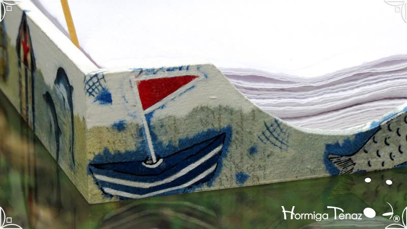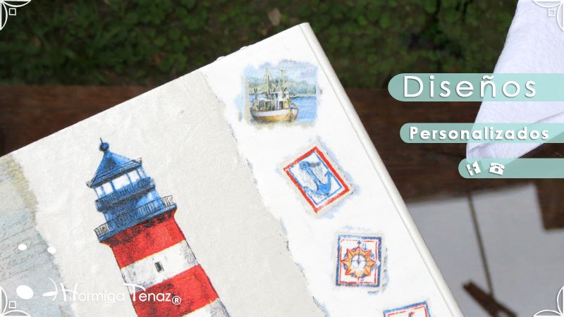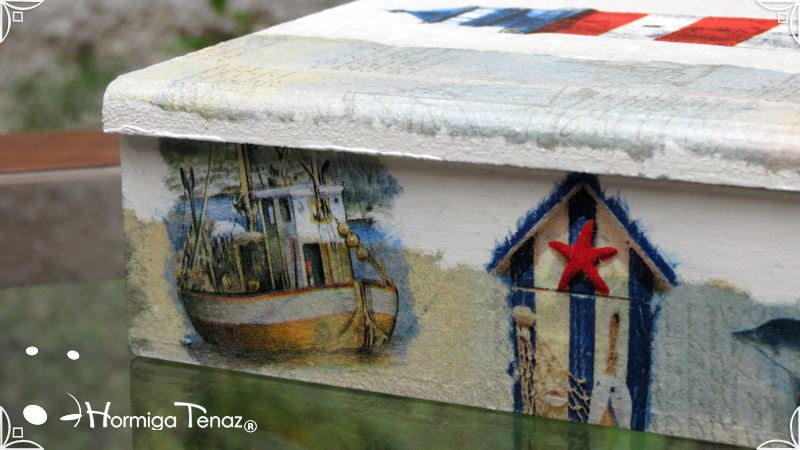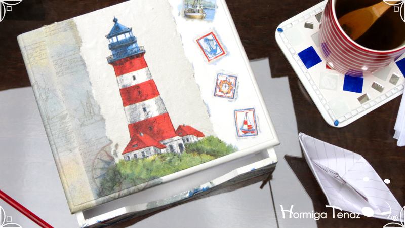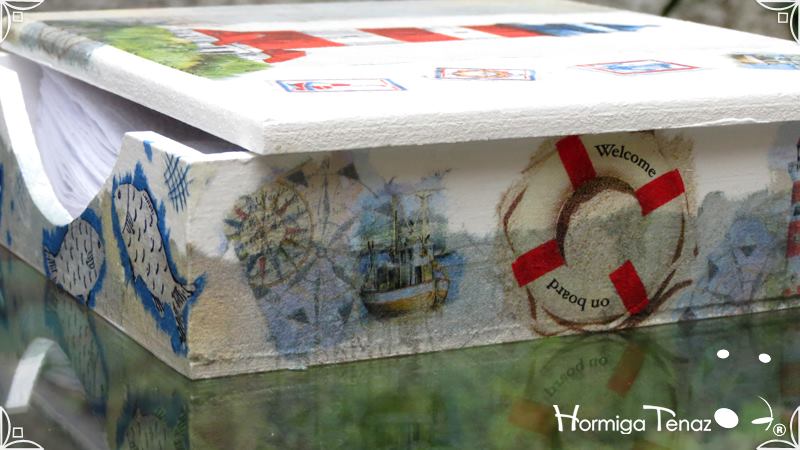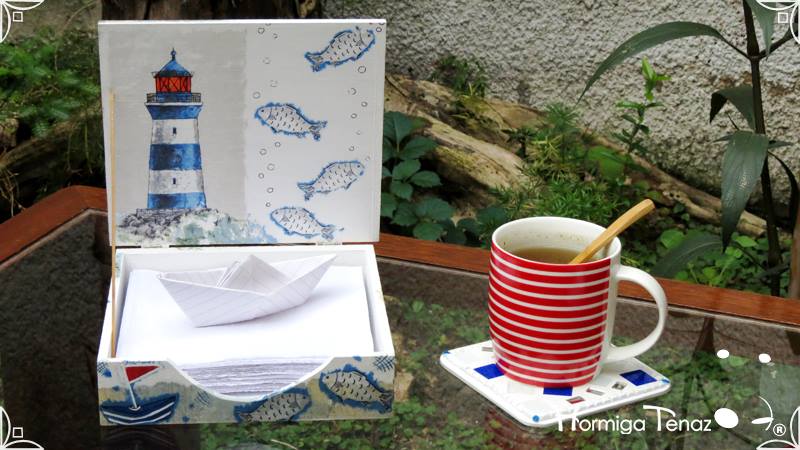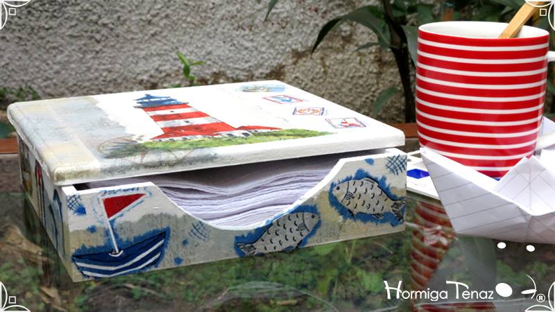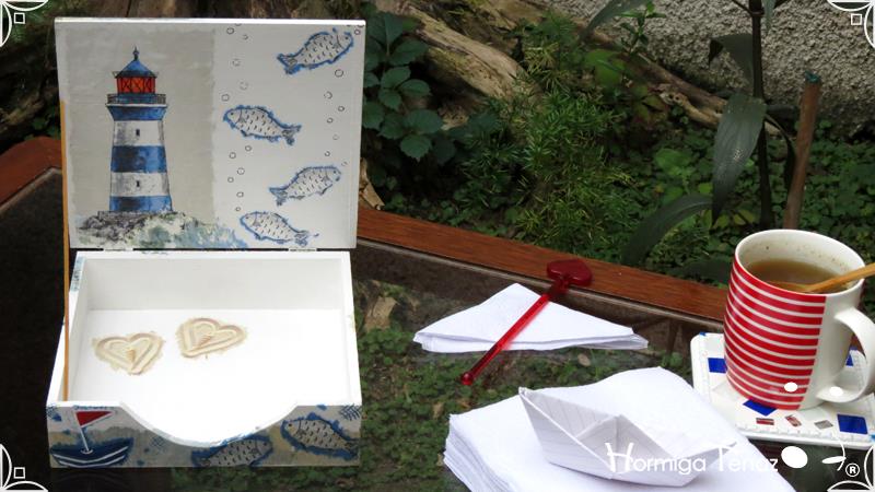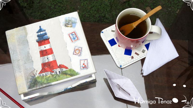 | Servilletero intervenido en decoupage, ilustraciones y pintura. La caja servilletero Océano fue presentada en las fotos junto con los Posavasos Mosaico. Diseño Personalizado ✎