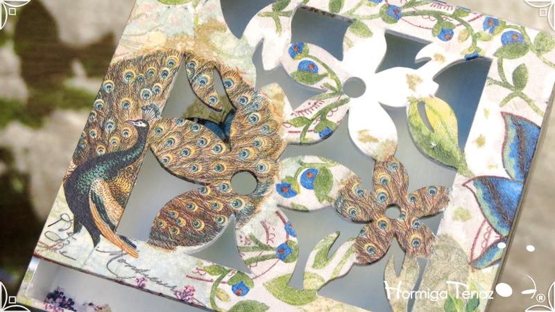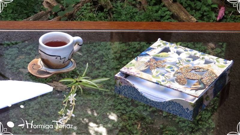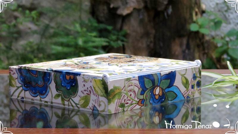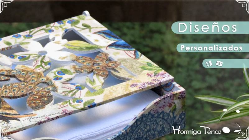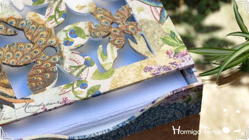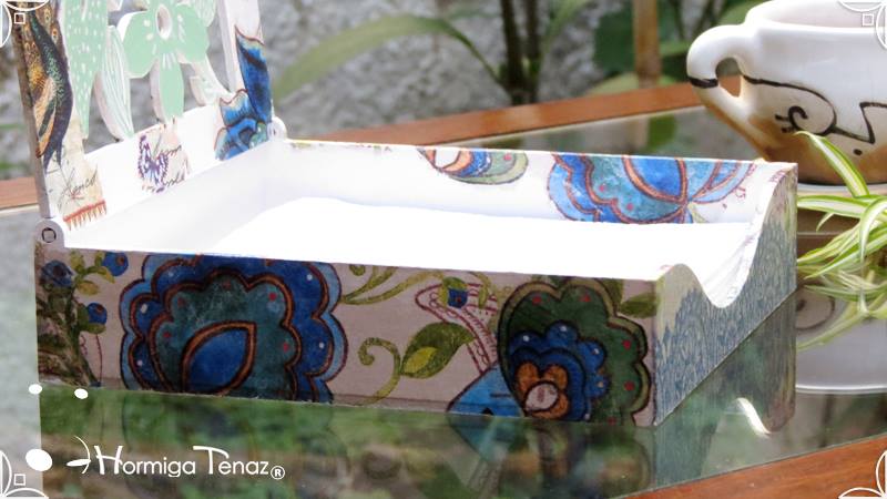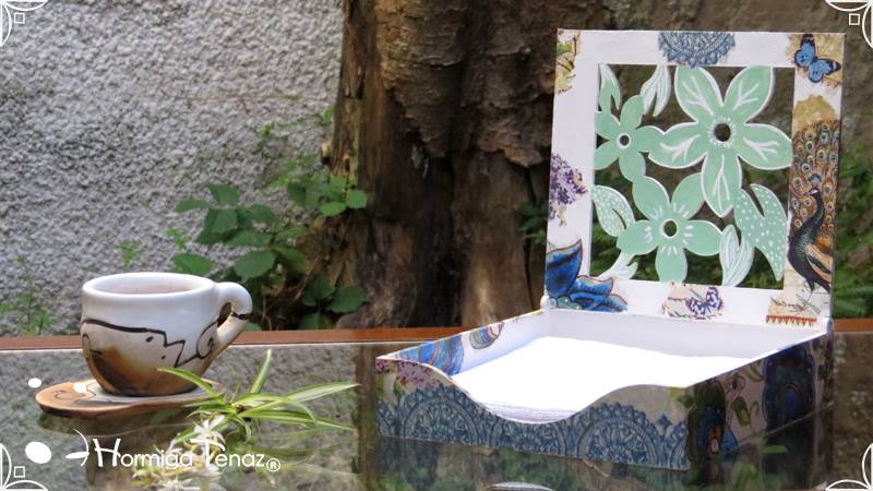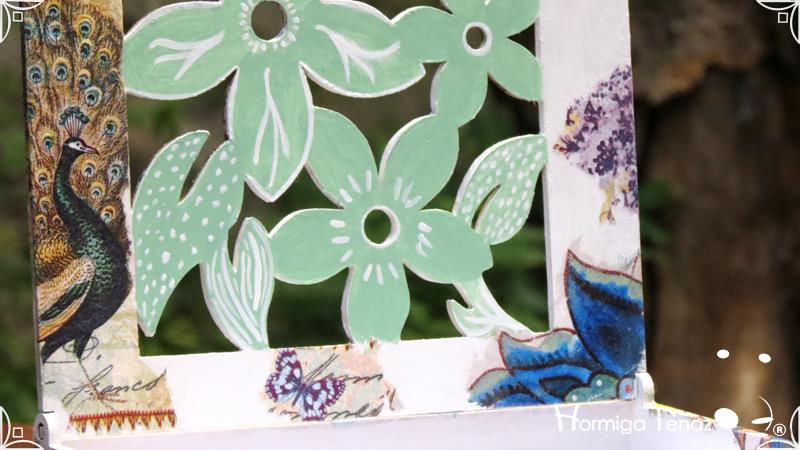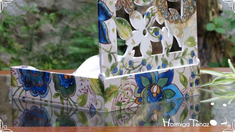 Servilletero de madera calada, intervenido en decoupage y pintura.