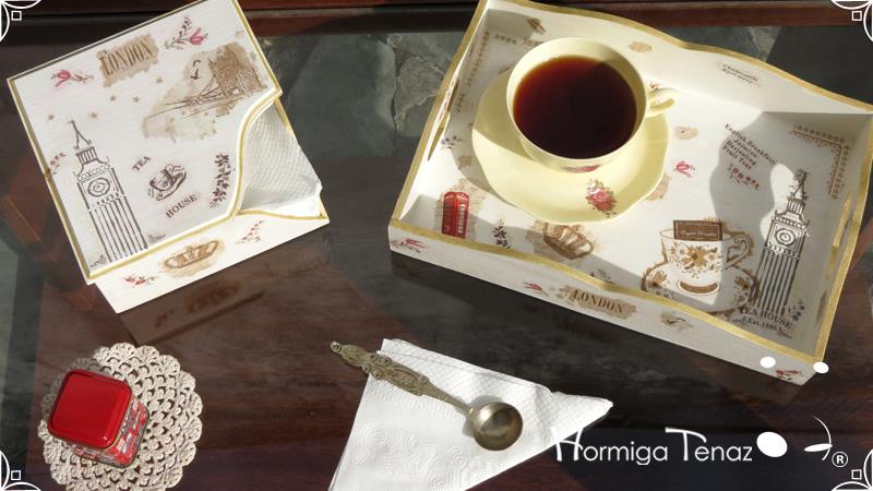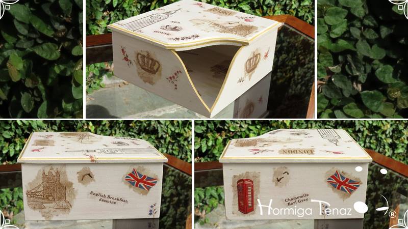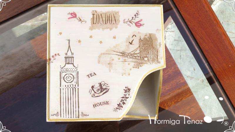Caja servilletero con tapa desmontable intervenido en decoupage y pintura, generando una decoración con una temática londinense. Finalmente a toda la pieza se le dio un acabado en barniz satinado para su uso y preservación.
