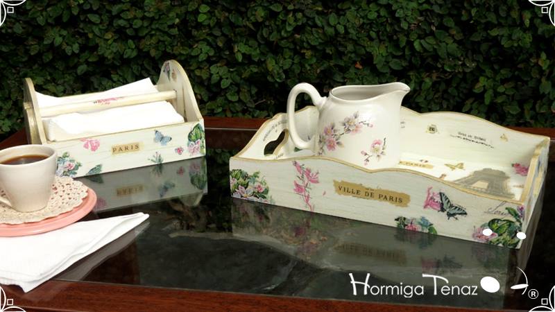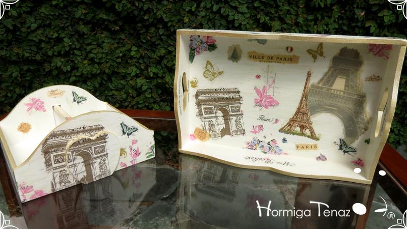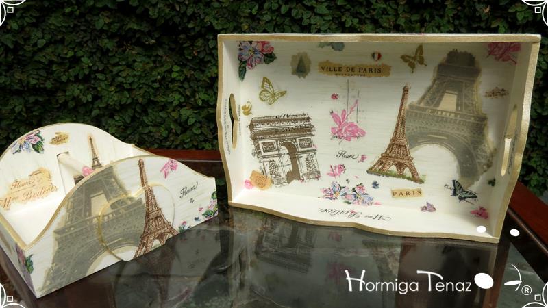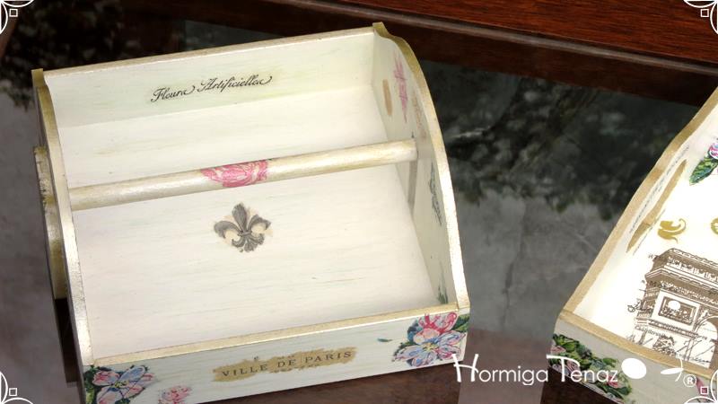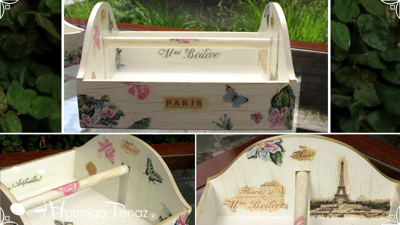 Servilletero abierto tipo canasta intervenido en decoupage y pintura, generando una decoración de temática parisina. Finalmente a toda la pieza se le dio un acabado en barniz satinado para su uso y preservación.