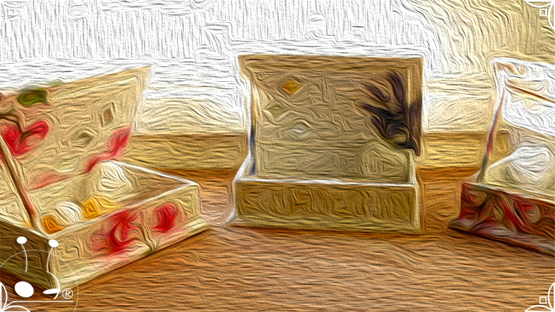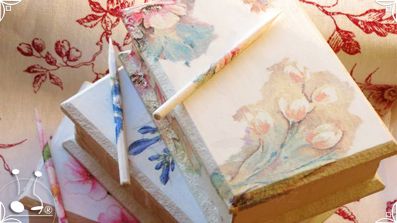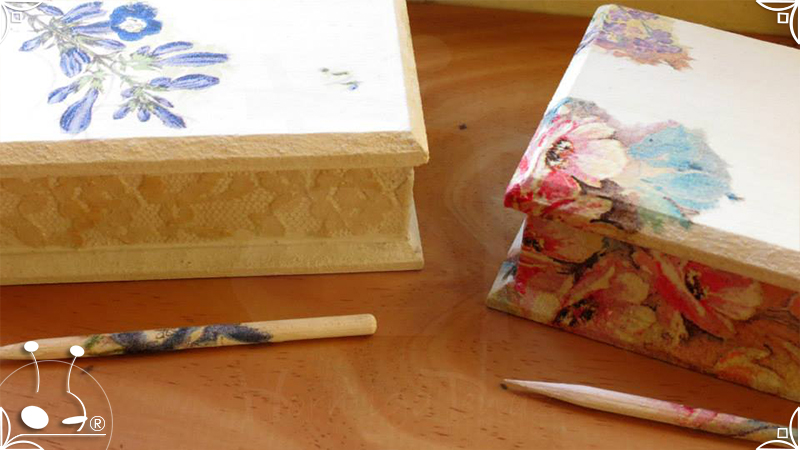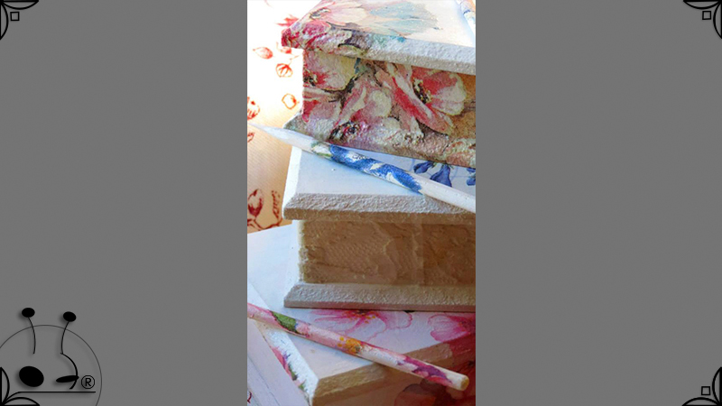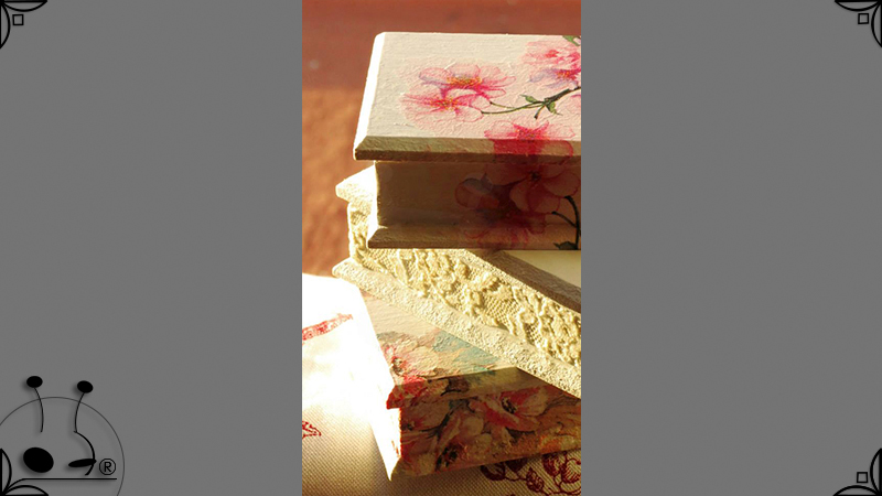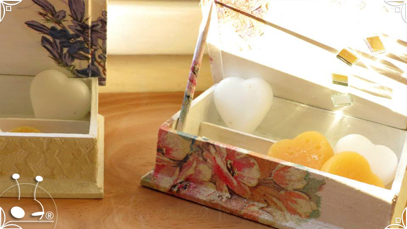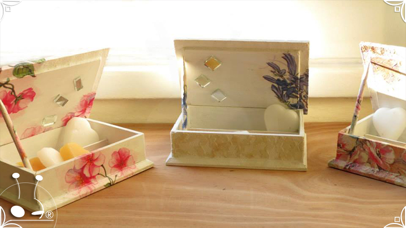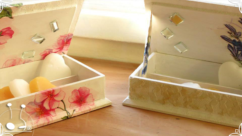 Elegantes cajas de madera intervenidas en decoupage, venecitas de espejo, y detalles de encaje. Todas las cajas fueron impermeabilizadas con barniz satinado para su preservación. Pensadas para perfumar los ambientes, ideales para el cuarto de baño o placares, ya que contienen cuatro corazones aromáticos con fragancia a sandía y vainilla, junto con pequeñas varillas en composé, para sostener la tapa abierta.