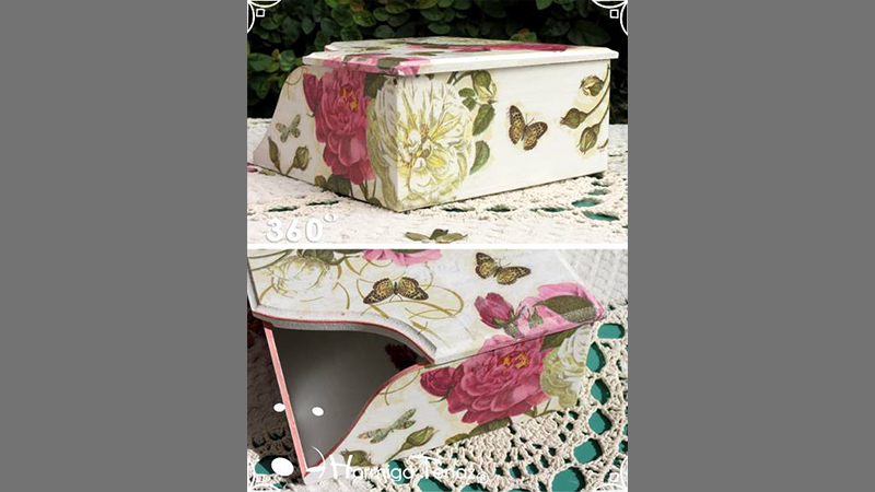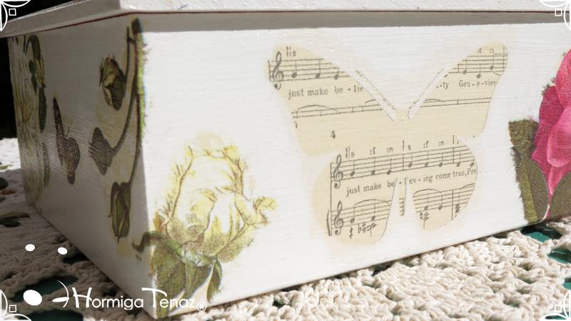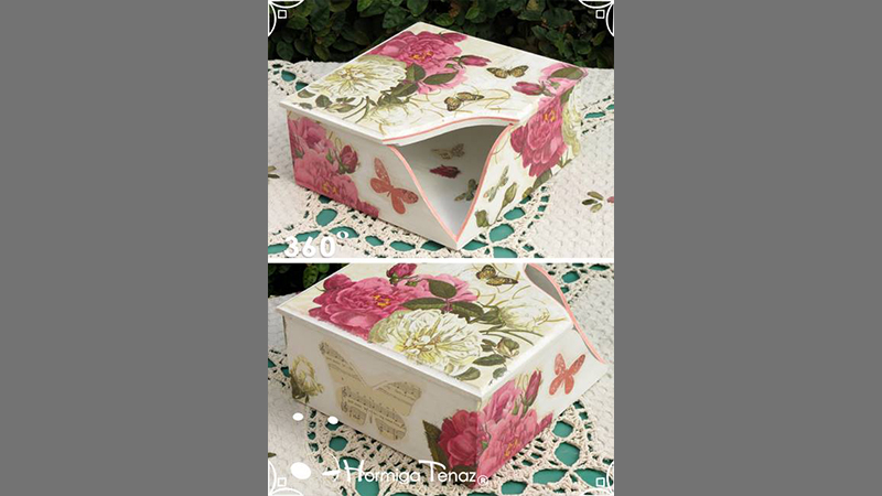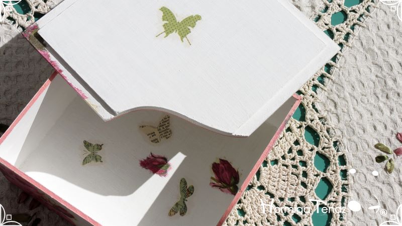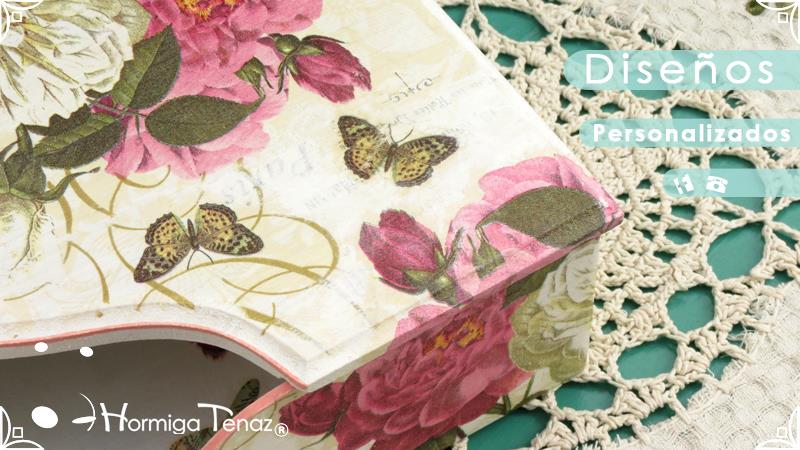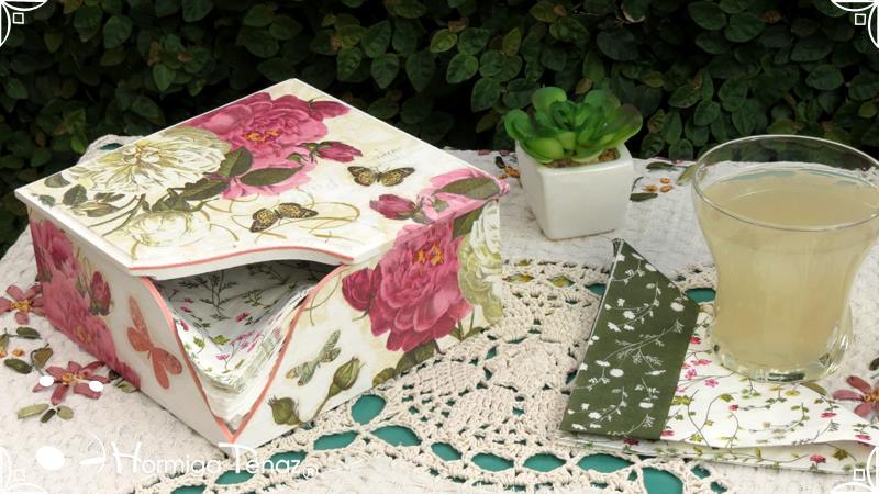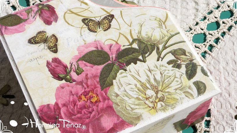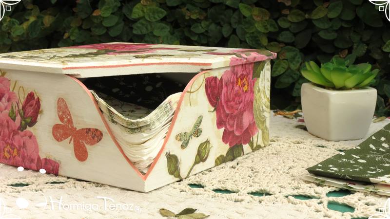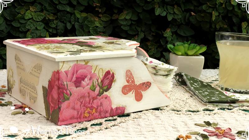 Caja servilletero de madera con tapa desmontable, intervenida en decoupage y pintura. Sellada con barniz satinado para su preservación.