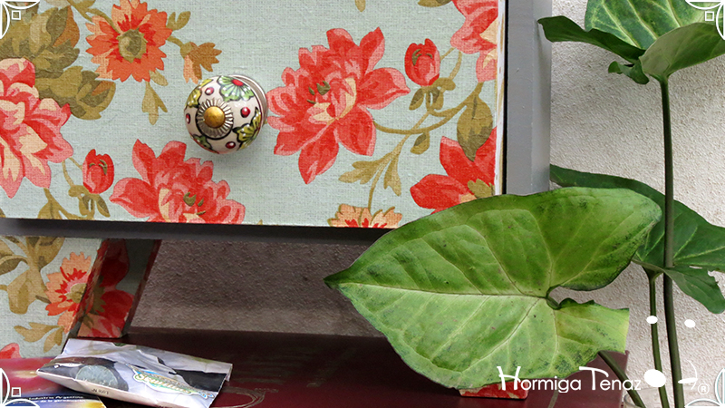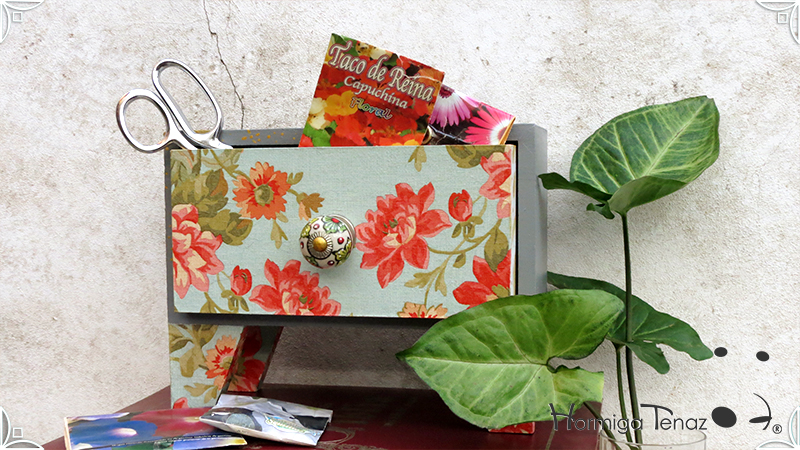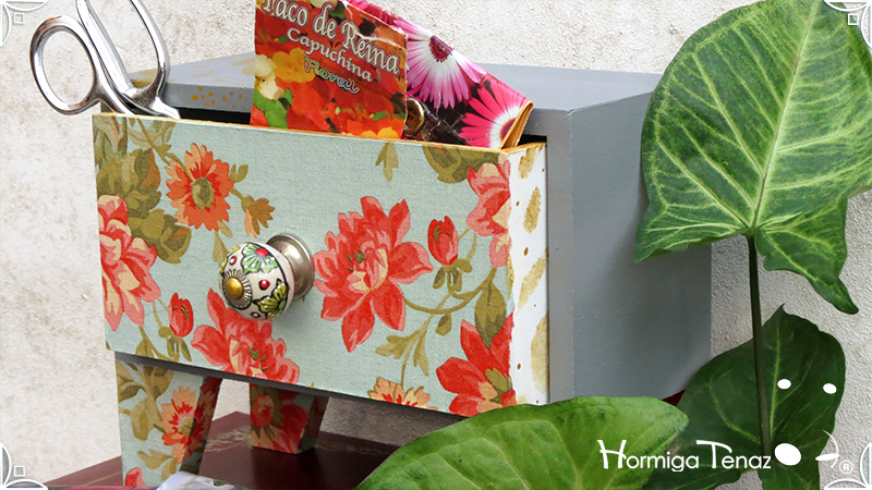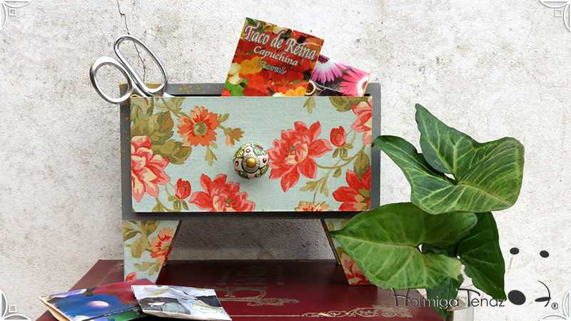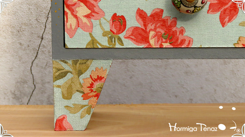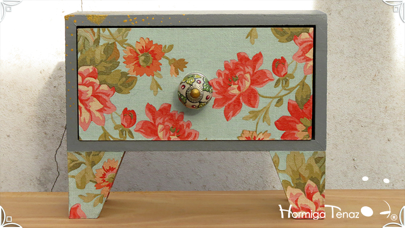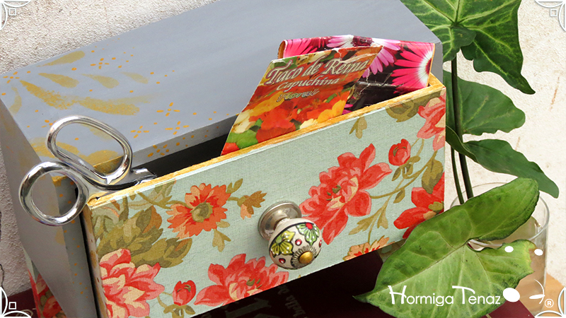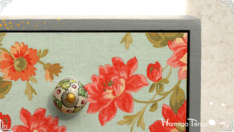 Pequeña cajonera de estilo Nórdico Escandinavo. Un pequeño mueble organizador pintado en color gris e intervenido en decoupage, con detalles de pintura en dorado, y con un hermoso tirador de porcelana y metal labrado.