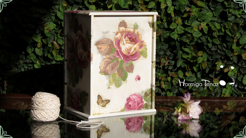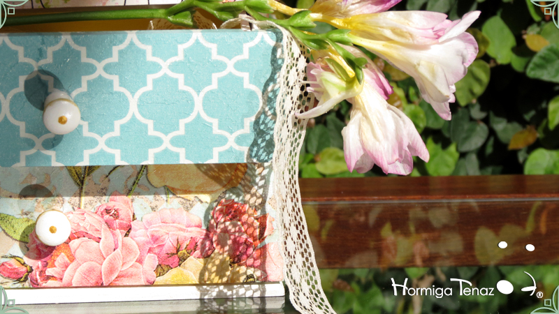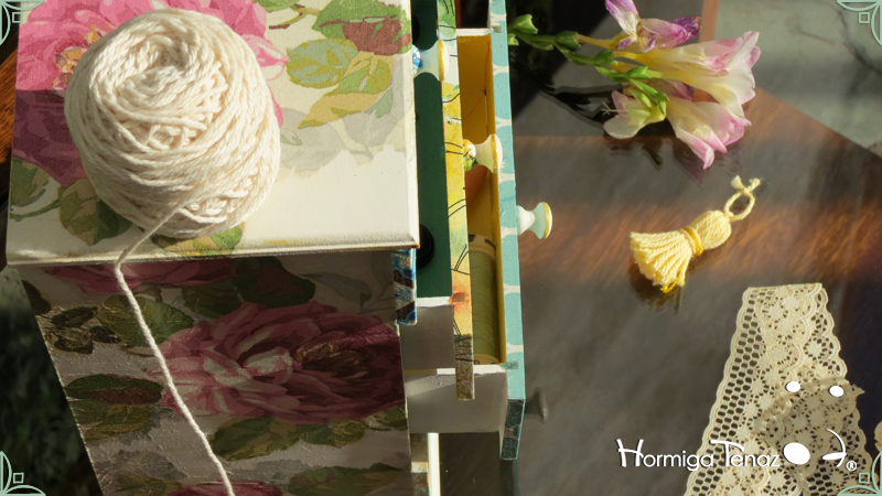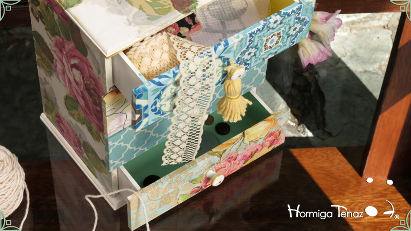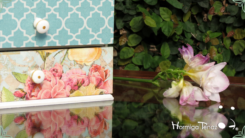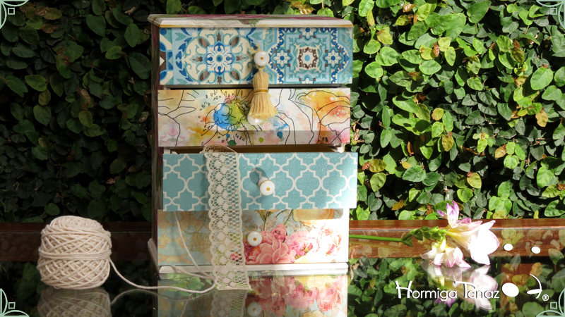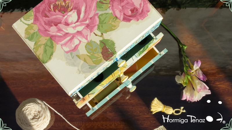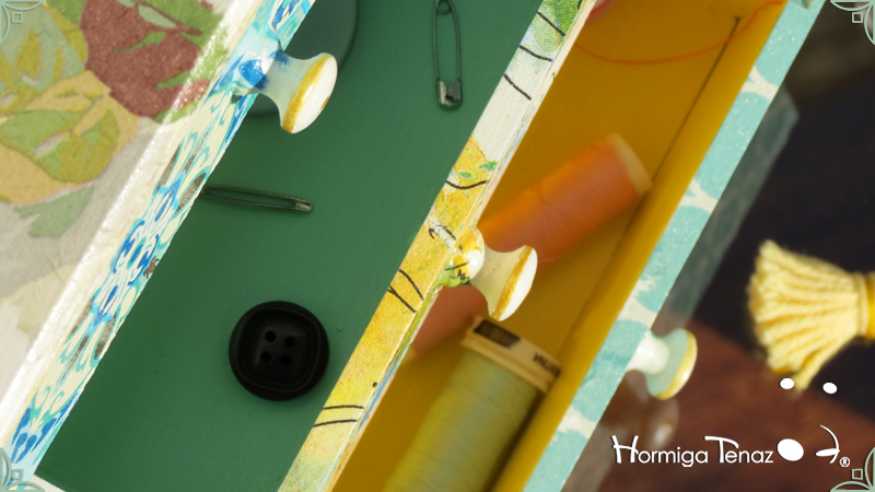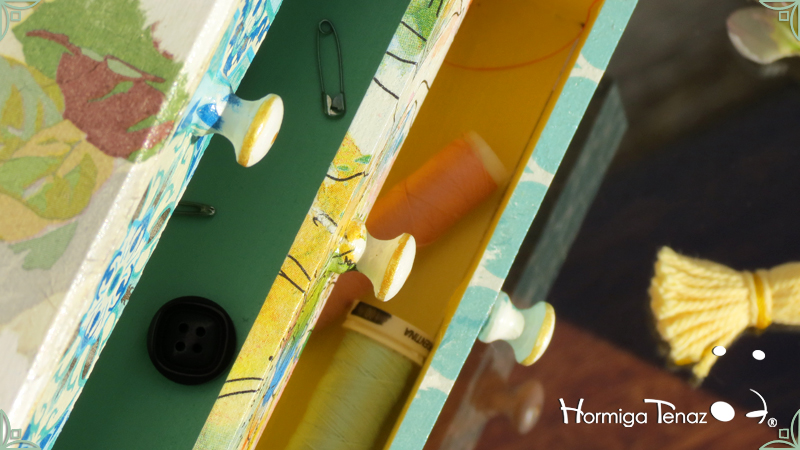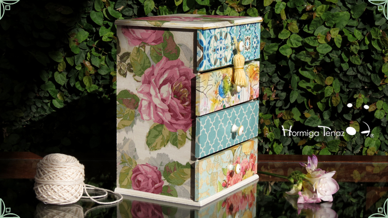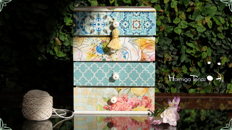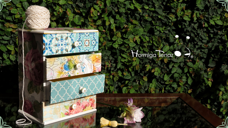 Cajonera de madera organizadora, intervenida por fuera con decoupage en una combinación de colores pasteles con motivos vegetales y geométricos, y con los tiradores pintados en dorado. Mientras que en el interior se pintaron los cajones de manera alternada en color verde pastel y amarillo vainilla, finalmente se impermeabilizó la cajonera con un acabado de barniz satinado, más el detalle textil de una borla amarilla con cintura dorada.