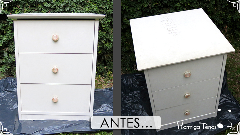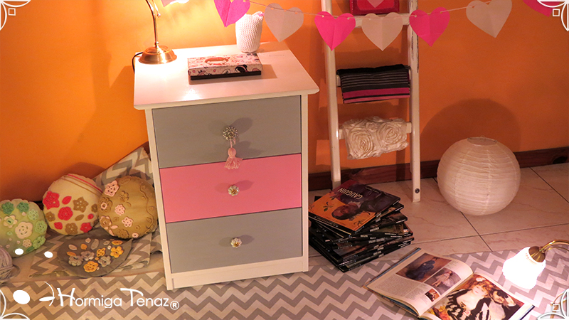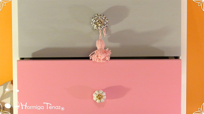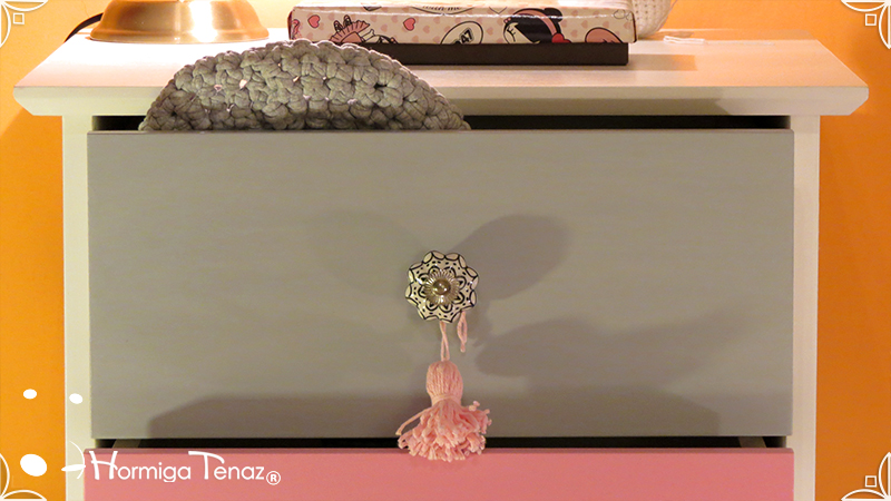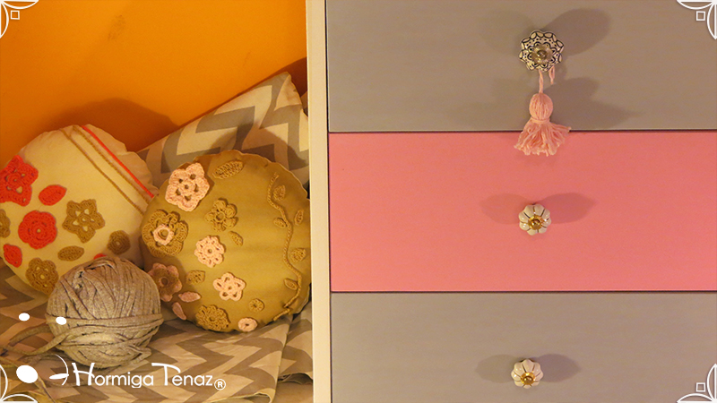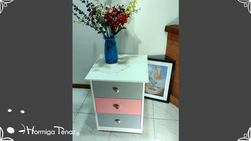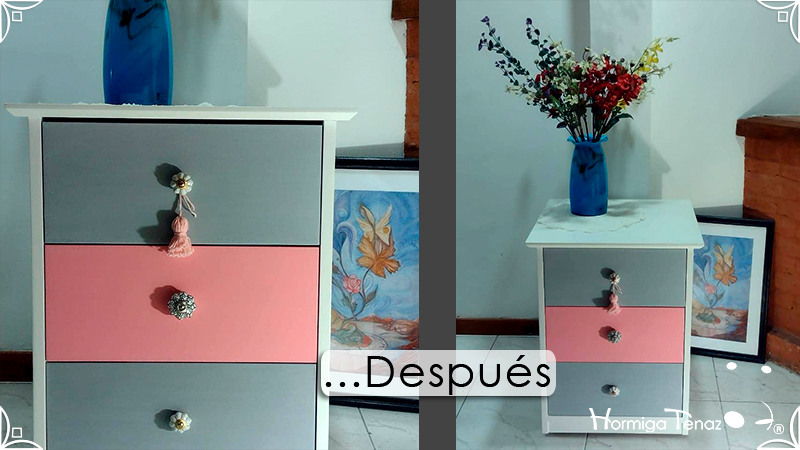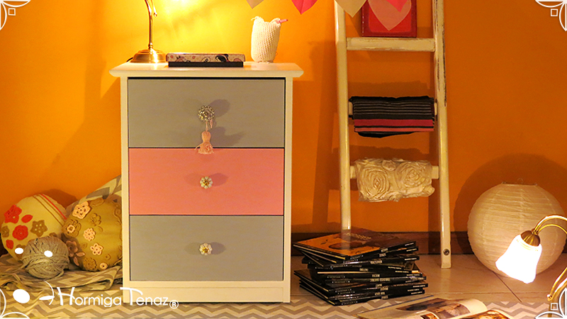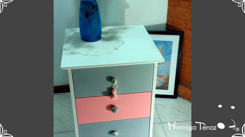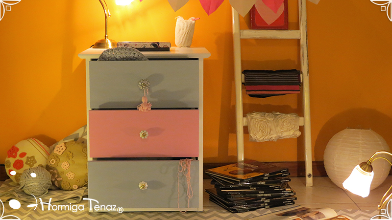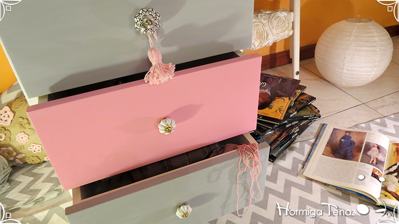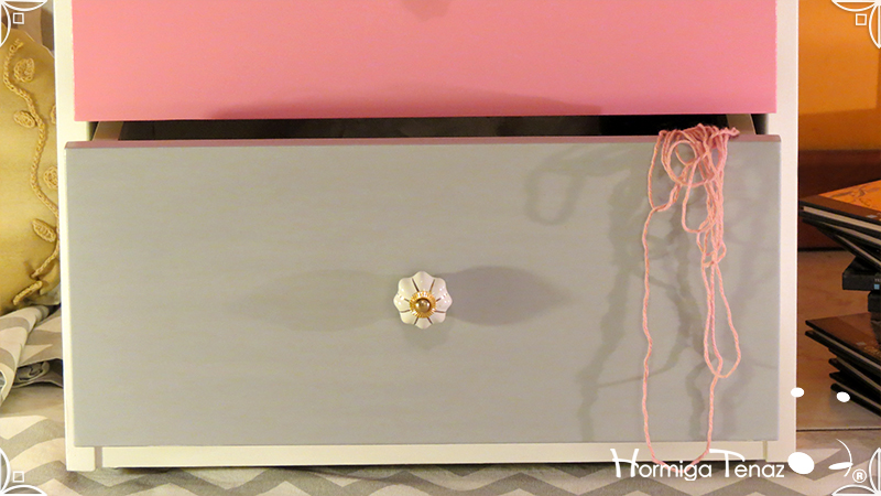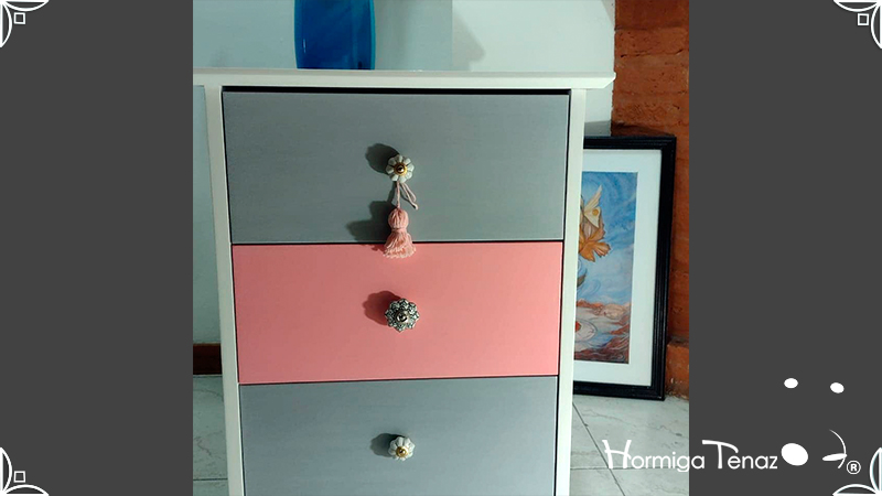 Transformación de una cajonera industrial-moderna a una cajonera femenina y con expresión artística, gracias a la combinación de los colores y los tiradores de porcelana.