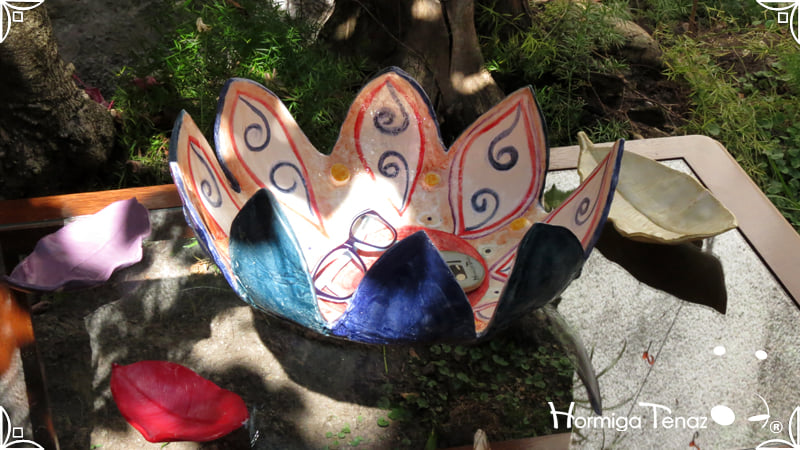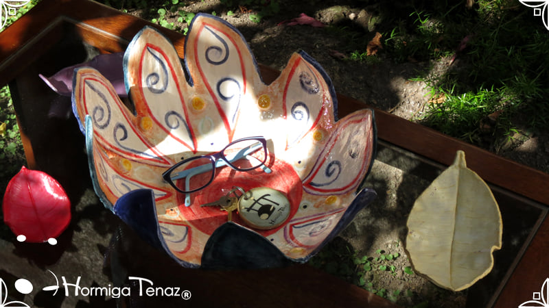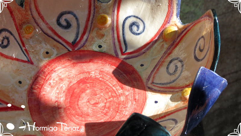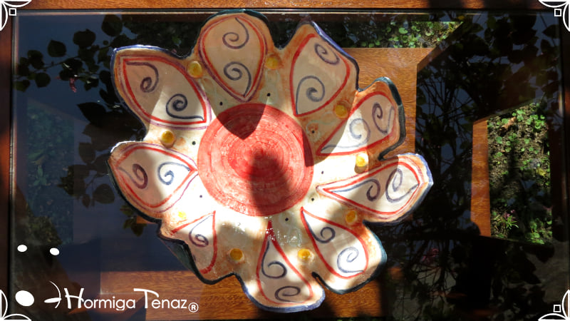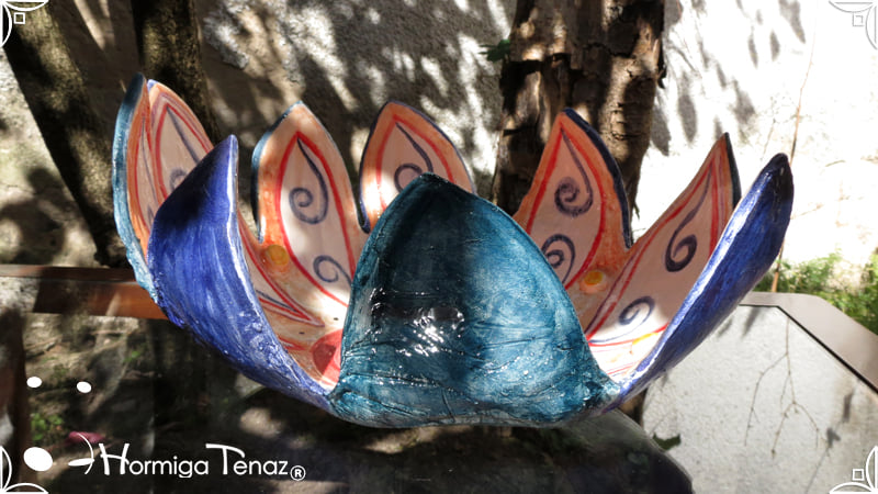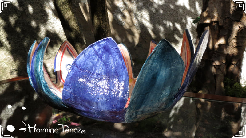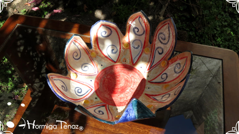 Escultural centro de mesa realizado en cerámica artesanal, con la forma de una gran flor de 9 pétalos expresando movimiento.